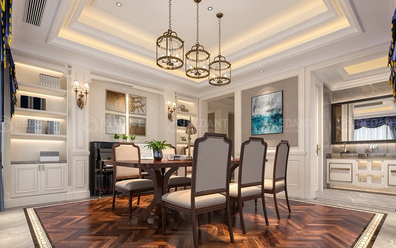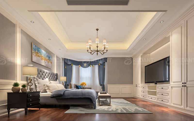美式风格来源于欧洲文化,其风格并不过分强调繁复的雕刻,以舒适和多功能为主,但同时也不失怀旧、浪漫的感觉。现在我们通常说起 美式风格,其实也只停留在表面呈现,而未能领悟其真谛。而本次设计跳出了美式风格的传统特点,在硬装上没有过分的做一些修饰,简单干净。而重点则是在软装搭配上,深色的沙发,显得感觉成熟稳重,营造了温馨的氛围。