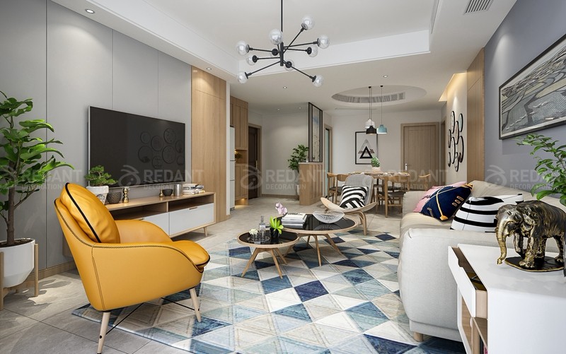 本案以白色与原木色为主,局部以亮色点缀。营造简约而不单调的家居氛围。业主比较喜爱储物式置物架,在整体设计上把电视背景墙以及餐边柜结合,以原木色的层板配以白色门板,渲染简约质朴亲近自然的家居环境。