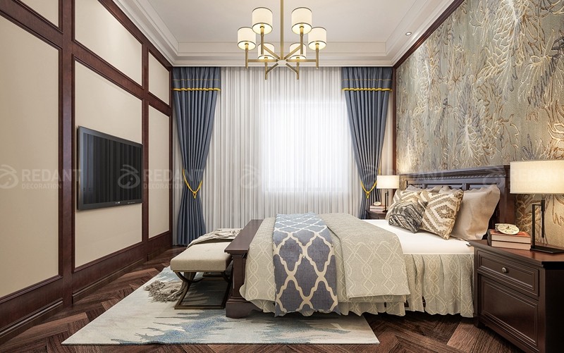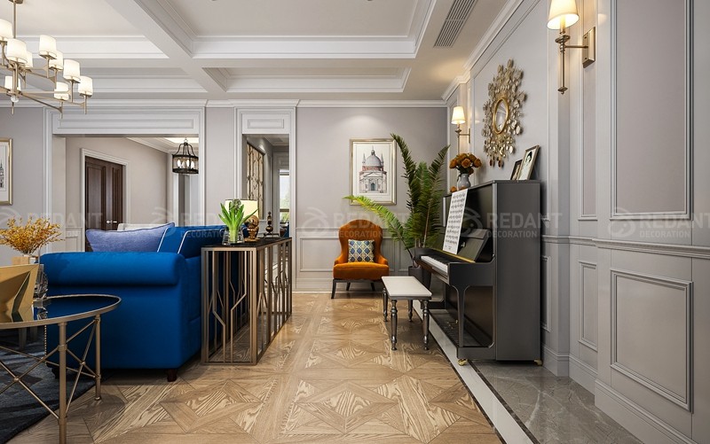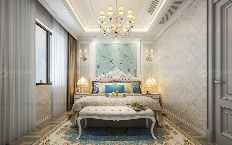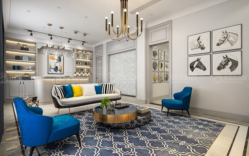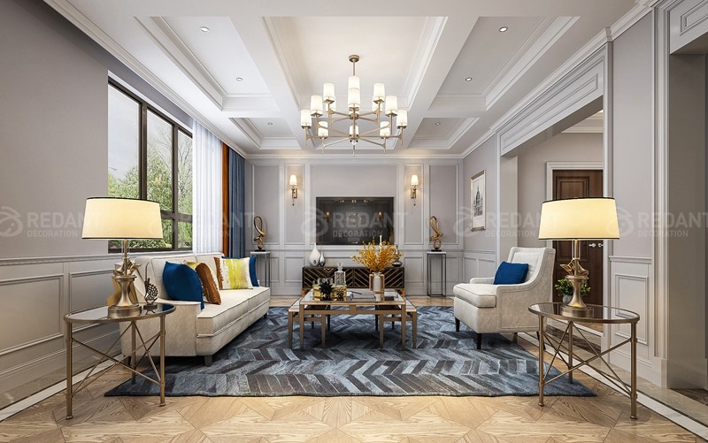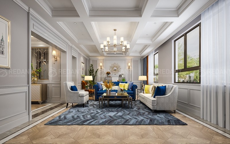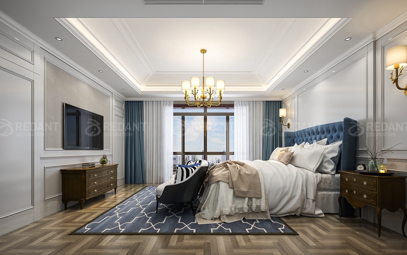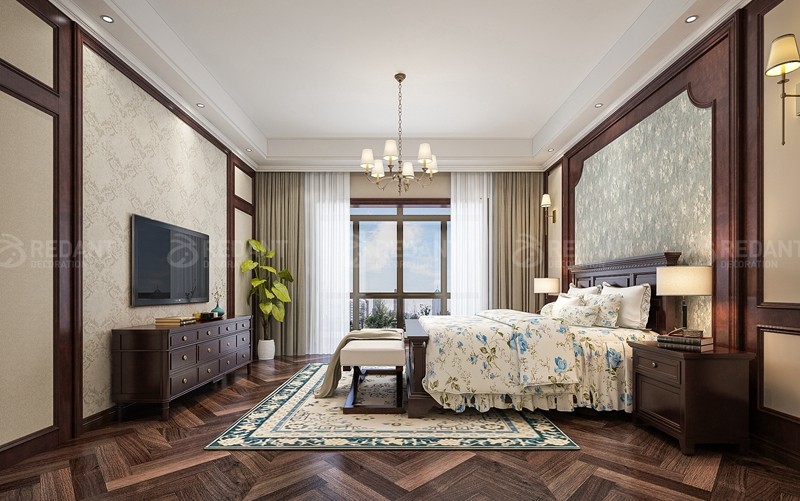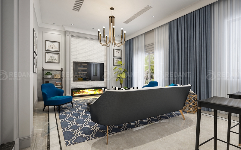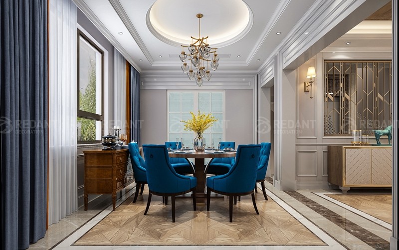 客厅作为待客区域,一般要求简洁明快,同时装修较其它空间要更明快光鲜,通常使用大量的石材和木饰面装饰;美国人喜欢有历史感的东西,这不仅反映在软装摆件上对仿古艺术品的喜爱,同时也反映在装修上对各种仿古墙地砖、石材的偏爱和对各种仿旧工艺的追求上。 总体而言,美式田园风格的客厅是宽敞而富有历史气息的.餐厅作为用餐区,保证满足家人用餐之时,古朴的实木餐桌椅,椅子与桌子边缘 -般都有一定的雕刻和弧度,典型的美式风格。而吊顶一般选用黑色吊灯做装饰,家里餐厅大的话,美式餐边柜也很常用于搭配。