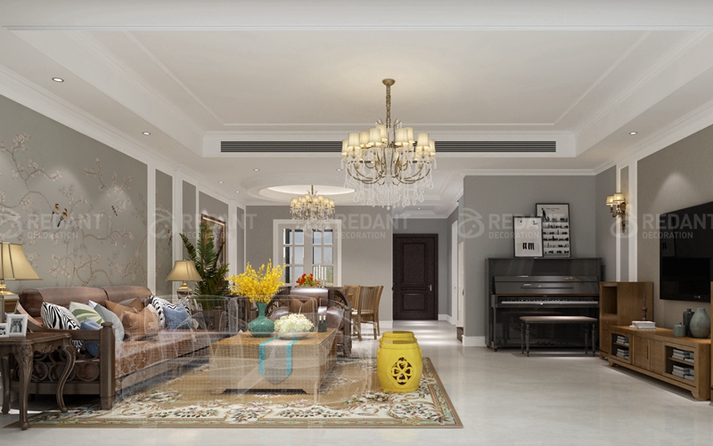走进客餐厅,首先映入眼帘的是大气典雅的室内空间!深色的橡木或枫木家具、精美的油画,还有制作精良的雕塑工艺品,都是强化风格不可缺少的元素。客厅错层结构,大面积的彩色涂料带来了空间的柔和感,布艺沙发有着高雅的质感,壁炉与一幅现代美式的装饰画相互呼应。充满异国情调的油画,典雅贵气的欧式壁炉,打造出沉稳而又奢华的贵族气质。