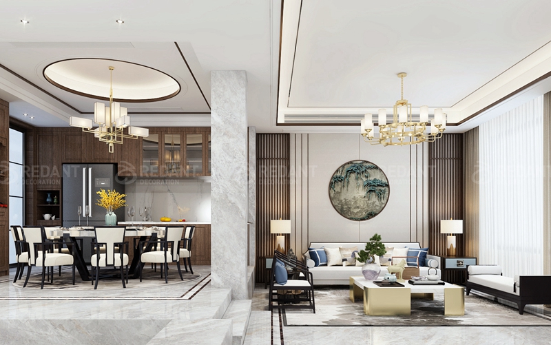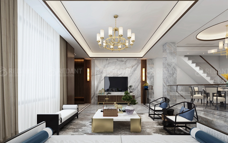 客户是两位年轻人,本案在保留原始的中国风情的同时,去繁存简地凸显一种现代气息,以线条的垂直比例结合中国古典装饰来表达。客厅的大理石,结合木饰面不锈钢线条,体现了主人的品味。家具骈弃了明清家具繁杂的雕花,自然清新的环境设计延续了整体空间的雅致,创造既不脱离传统,又有新的雍容华贵和审美情趣的中国之美。