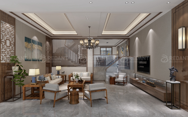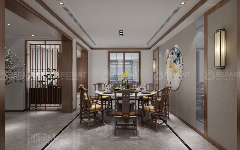 客户是位中年人,本案在保留原始的中国风情的同时,去繁存简地凸显一种现代气息,以线条的垂直比例结合中国古典装饰来表达。客厅的山水画大理石,结合木饰面,体现了主人的品味。家具骈弃了明清家具繁杂的雕花,在叠起圆球的烛台上,清香借着燃烧的烛光轻轻的溢满整个房间,“入兰芝之室,久而不闻其香”,或许就是主人的意境吧!