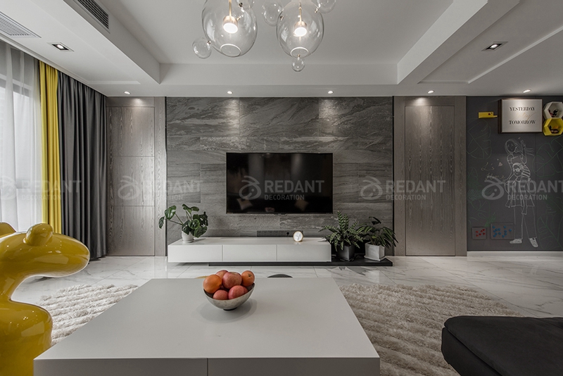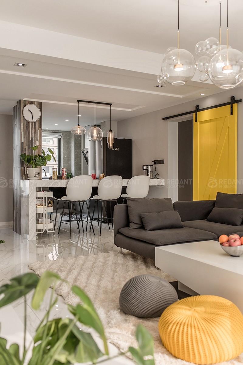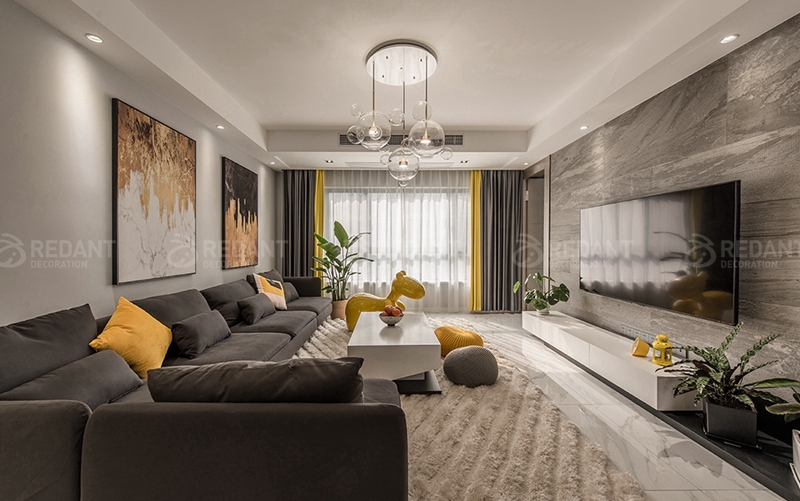 现代风格顾名思义,就是让所以细节看上去都非常简洁。无疑这种装修风格迎合了很多年轻人的喜爱。本业主也是两年轻夫妇。现代风格有时候会给人一种过于沉闷的感觉,所以本案搭配了很多柠檬黄的亮色(窗帘,挂画,靠枕都有呼应)。