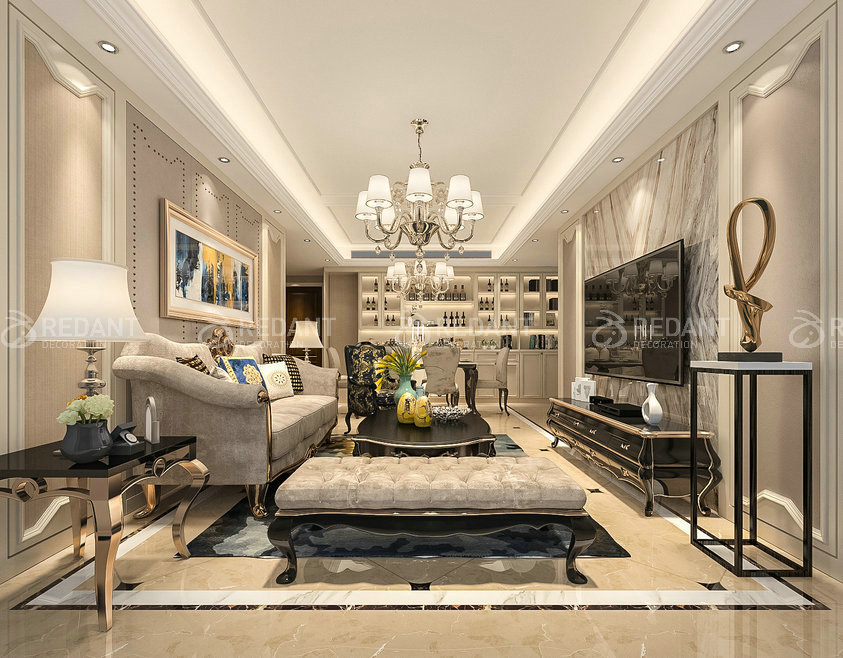 推开门进去玄关位置侧边是彩色玻璃的隔断,率先看到的是餐厅,餐边柜为现场定制与鞋柜连成一排隐藏了中央空调的出风口,增加储物的同时更为整体,客厅的电视、沙发背景均用实木多层木饰面建议象牙白(白色浑水)用其砖面、硬包、墙纸的收口。客厅顶面与餐厅顶面连为一体也用线条进行区域划分。厨房将原工作阳台进行改制归入厨房,需要进行一系的改造,如地面的垫高,墙面保温等。内卫在原基础上缩小,仅满足基本条件,没有窗需要构建好排风系统。