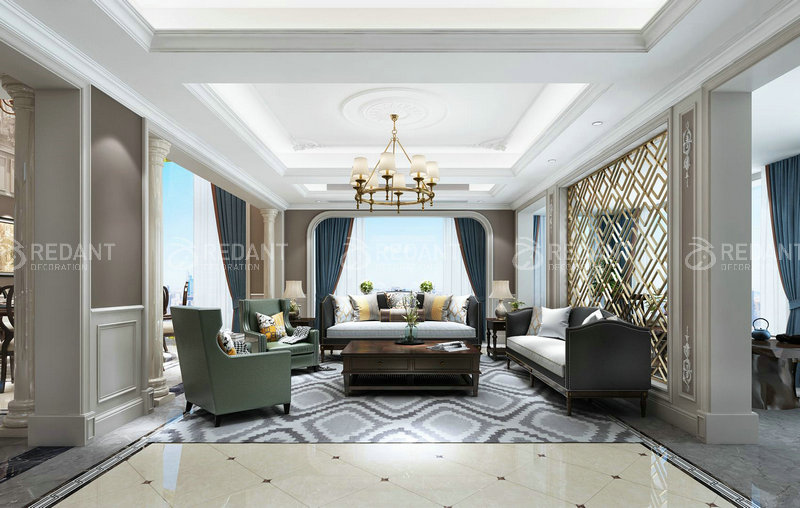 美式客厅风格较多采用嵌入式石膏吊顶,搭配精致的水晶吊顶,营造出一种怀旧、浪漫的感觉。以大理石作为地面装饰材料,光泽感极佳,在沙发区铺上大幅花纹地毯,使空间区域划分更加清晰。复古造型的组合沙发,以及茶几都具有上乘的质感,让美式风格得以进一步的彰显