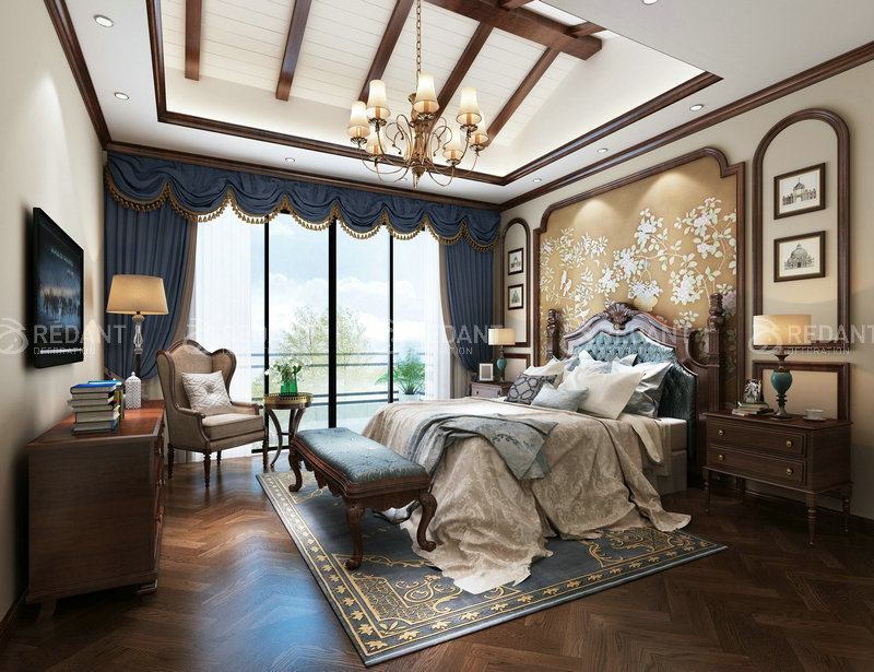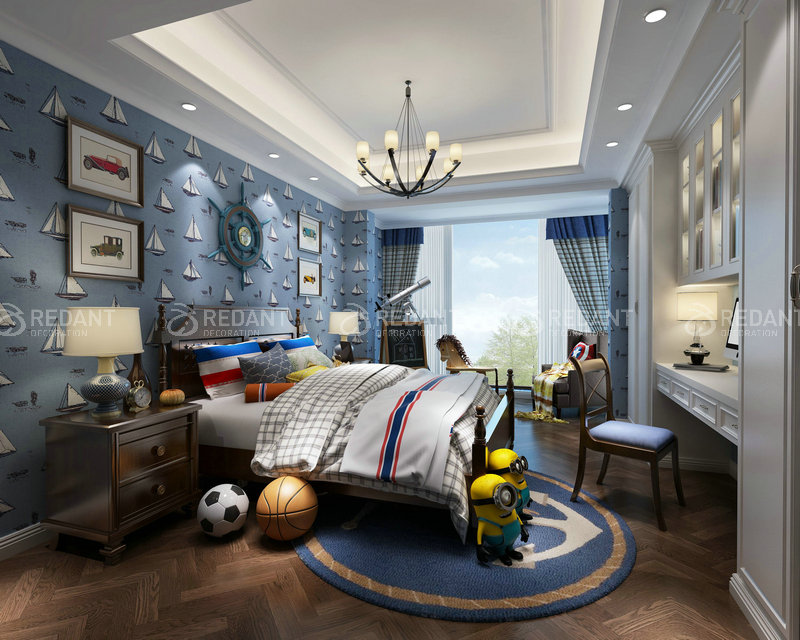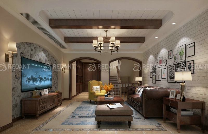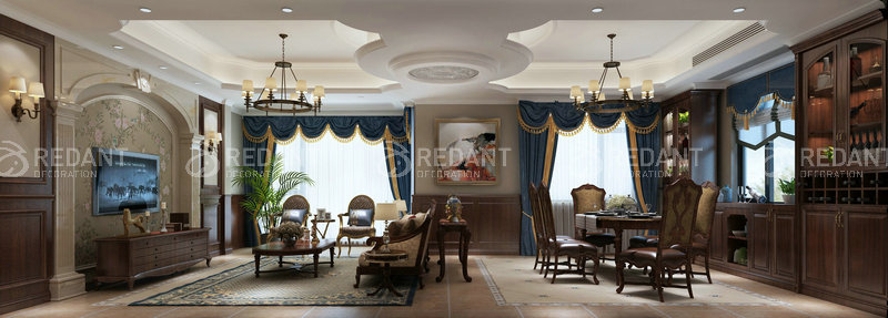 客厅以素雅的色彩为肌理,简洁而利落地诠释了美式的奢雅魅力。与 此同时,淡绿色的单椅带来古典特有的浪漫。电视背景墙增添亮点,彰显主人极高的审美品味。空间里的材质运用,营造出一丝淡淡的奢华气息,展示出不一样的家居氛围。客餐厅空间秉承了大尺度、大空间的理念,重新诠释了“宽敞”的定义。让视线可以任意地穿行,充分享受空间带来的自由感。浅色墙面与深色沙发相互映衬,显得更加明亮整洁,沉稳大气。通厅的户型上,餐厅和客厅隶属于同一个空间,却有着不同的功能。墙面造型与客厅相互呼应的同时,做一点细微的调整,利用吊顶的分割,既能让空间相互独立,又冲击了视觉感受。
