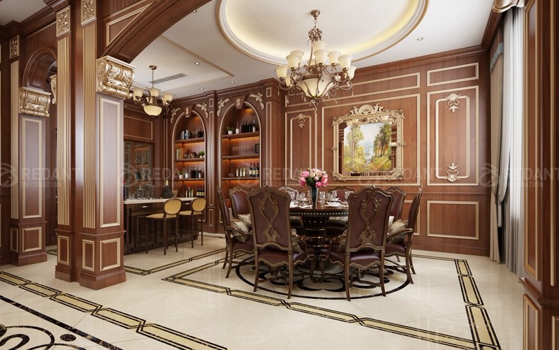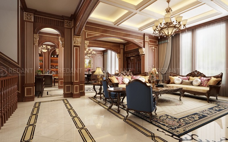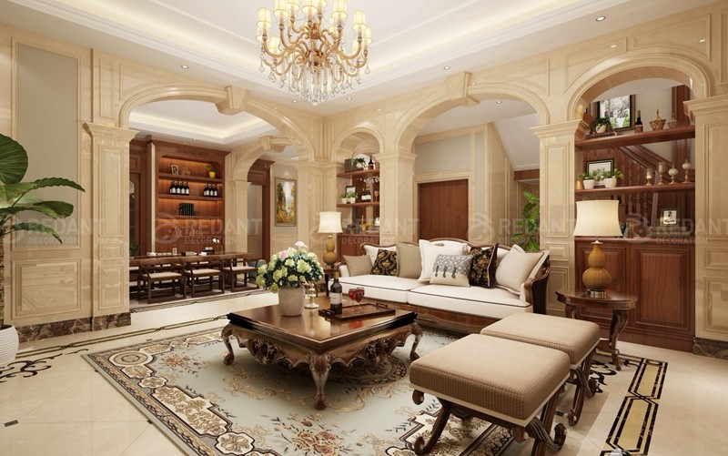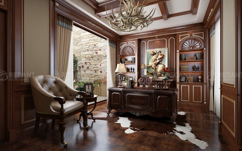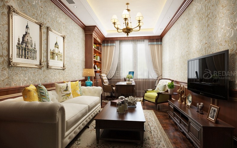采用英伦风格,花格布艺、深木色护墙板、学院派古典风景油画、装饰线脚等,营造出清静自然,格调明快的氛围,且有少许乡村风味,室内内部搭配元素和外部建筑风格一致。它的装修设计里“雅致”这个特点就必不可少了,在细节处体现出英国的文化氛围。