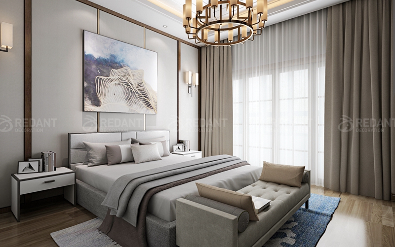 点,线,面与空间的建筑语汇有机结合,色彩与质感的搭配,材料的运用,使设计中跳动、激荡,让人感觉空间的精神以及尺度与比例关系带来的冲击感,体现出既有传统底蕴又富有前瞻性的生活品味。建筑造型优雅,装饰线条明快,颜色搭配大方,材料质感丰富,家具浑厚有力,饰品端庄典雅,古典的奢华在现代的简约中得以诠释。