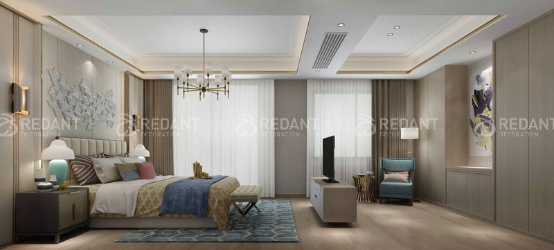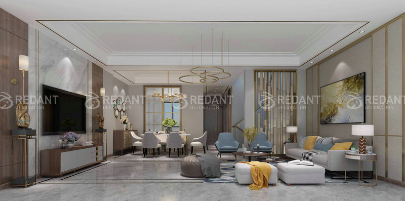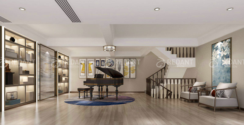 本案为建筑面积198方联排。整个居室的设计经过和业主沟通选择现代风格。整个色调以业主喜欢的原木色调为主。墙面以白色乳胶漆和装饰柜为装饰。家居以灰色布艺搭配主主色调。在功能布局上充分和业主沟通满足生活习惯和家庭成员的要求。后期软装上以适合家居的温馨简洁干净的风格搭配体现出家庭氛围。