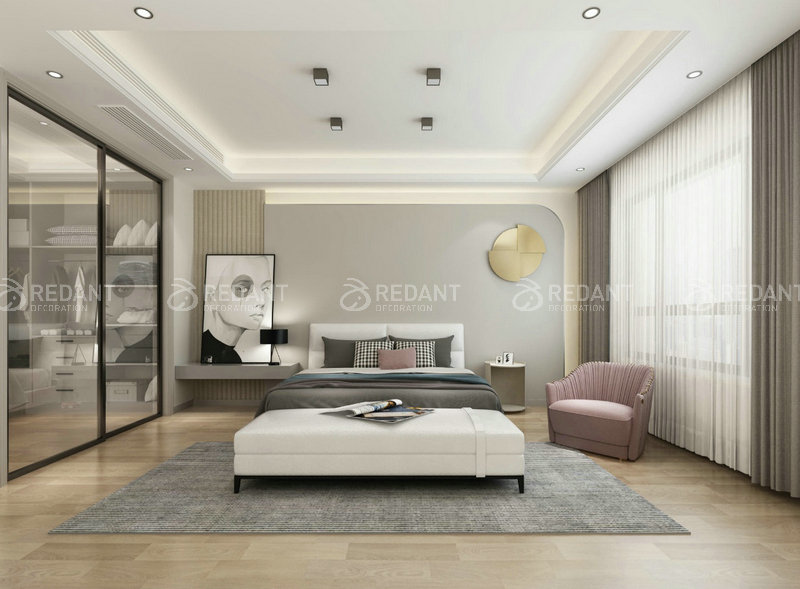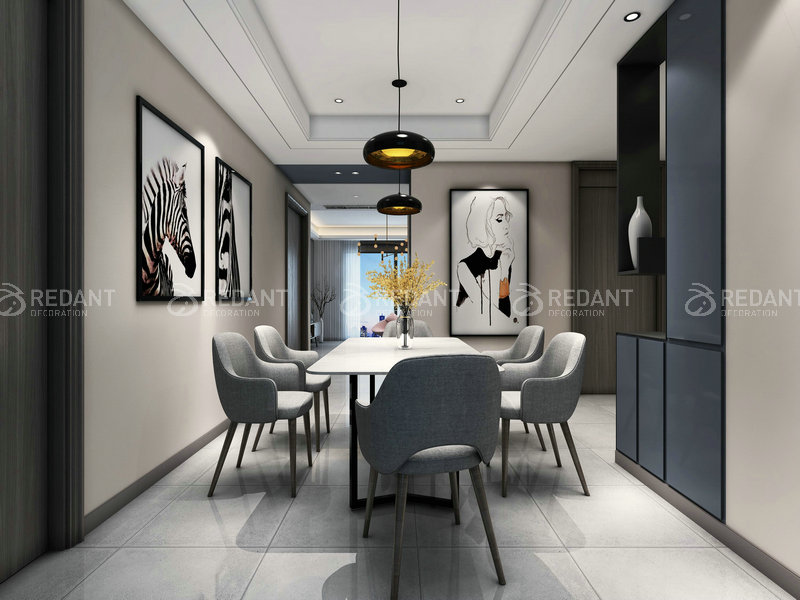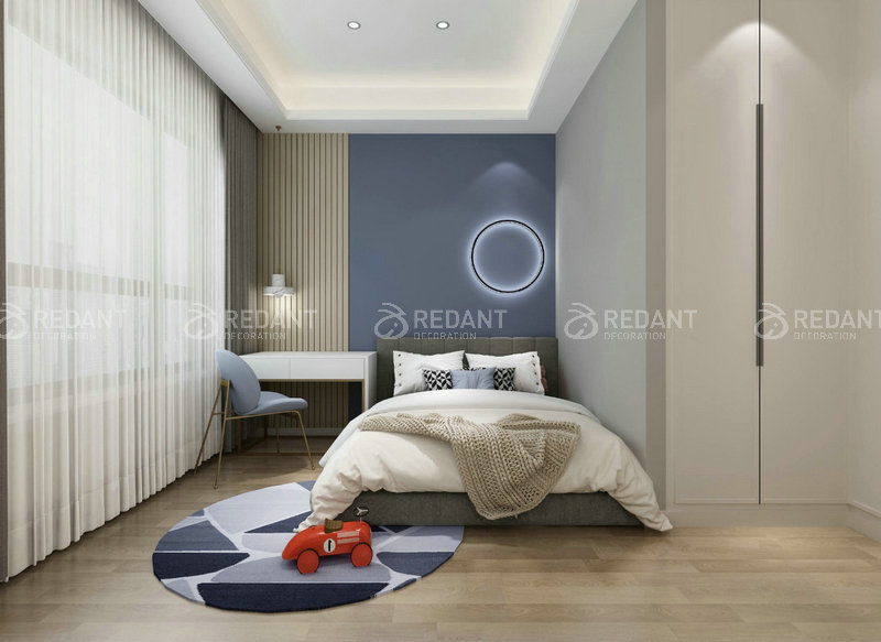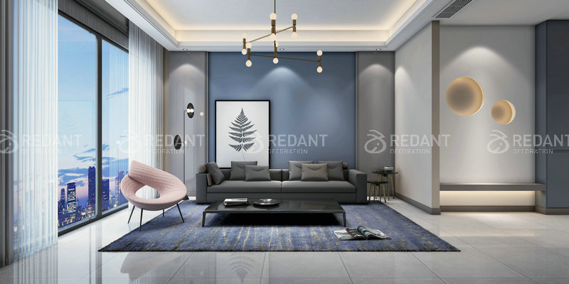 整体是现代简约的格调,删繁就简,去伪存真,以色彩的高度凝练和造型的极度简洁,在满足功能需要的前提下,将空间,人及物进行合理精致的组合,用最洗练的笔触,描绘出最丰富动人的空间效果,客厅的蓝灰色调带给客户平静的心境,让客户能够更好的享受生活,主卧室的米色以及灰色的搭配处理体现出当下的流行色调,紧跟潮流,而灯带就更好的柔和了整个卧室,使整个空间看起来更加温馨。