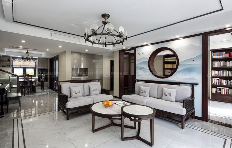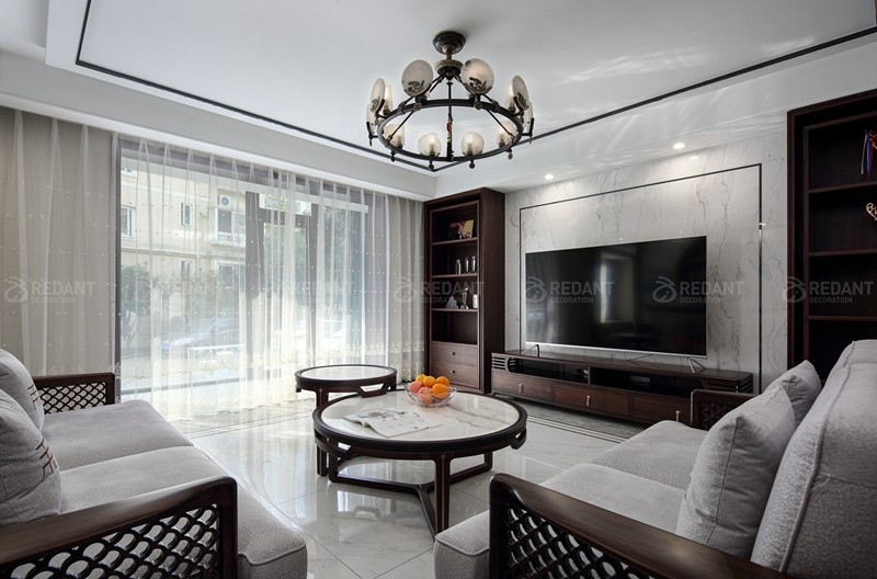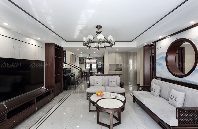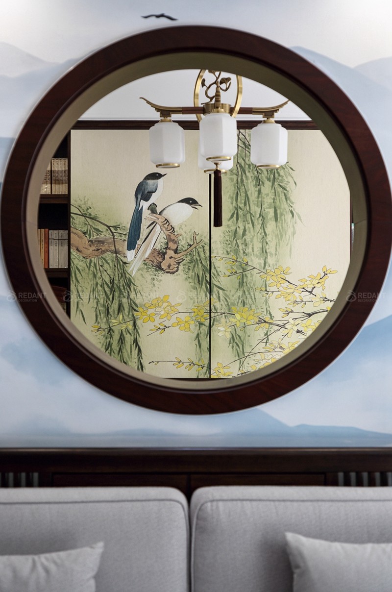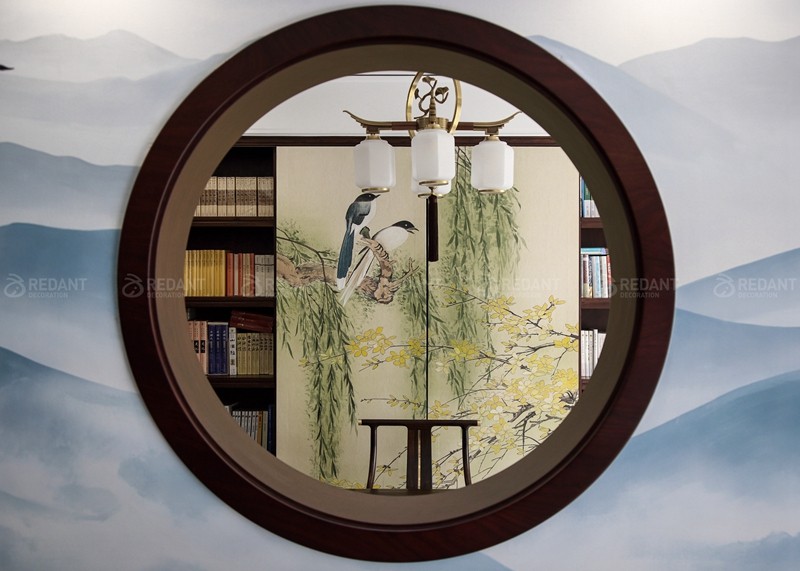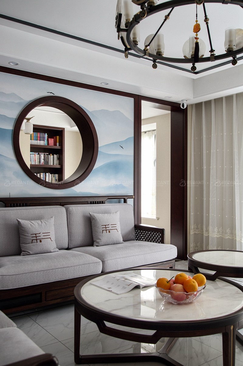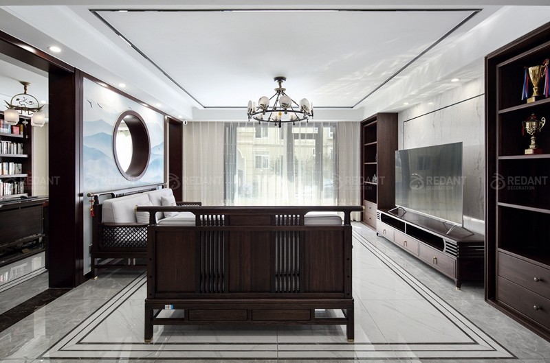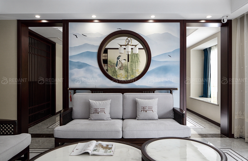 圆形露窗隔断,选用红木色,拉伸空间,富有层次感,给人曲径通幽的感觉,顿时为整个客厅添上一层神秘的面纱,不约而同的色调文化,为空间加了几分古朴与素雅的气质,展现出层次与中式艺术的结合。