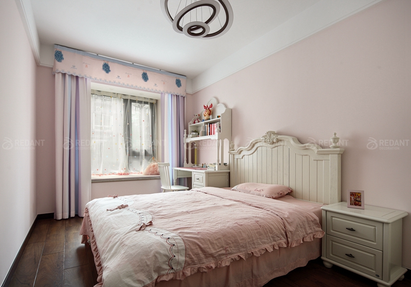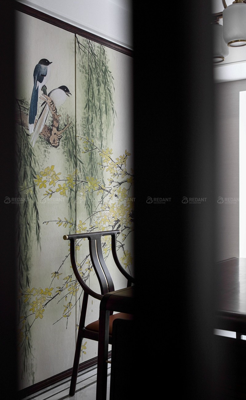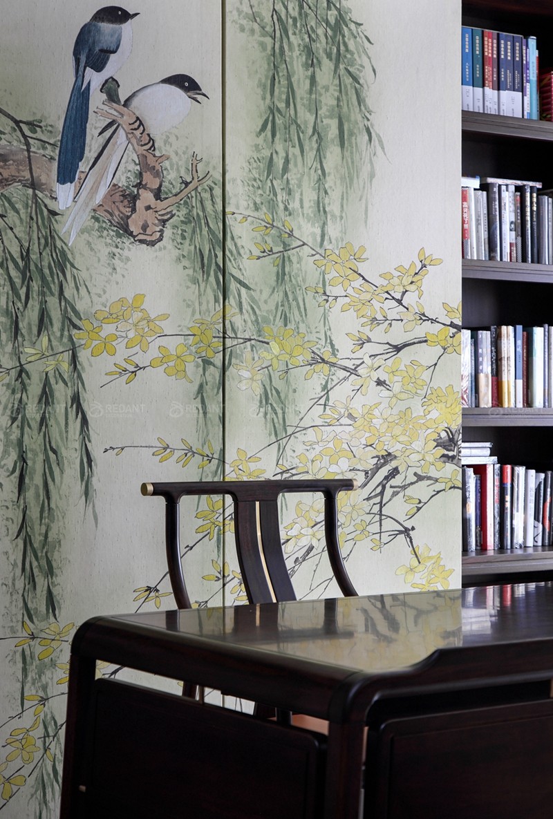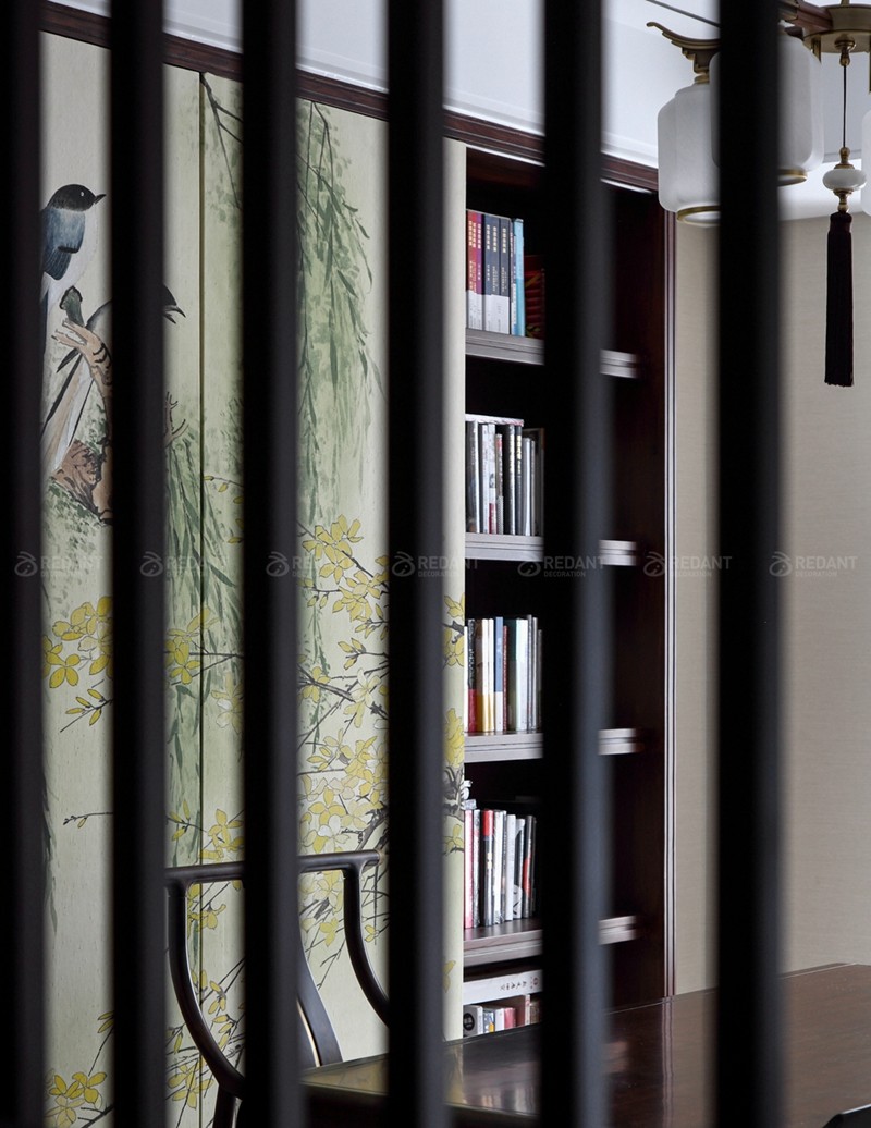 书房充分体现了传统意义上的“书斋”韵味。多采用简单的直线条,书柜中间两扇移门采用传统中式的屏风式设计,并以国画的花香鸟语来做装饰背景图案,构成极具新中式风格的书房蓝图。总体布局对称均衡,端正稳健,而在装饰细节上崇尚自然情趣,花鸟、鱼虫等精雕细琢,富于变化,充分体现出中国传统美学精神。格调高雅,造型简朴优美,色彩浓重而成熟。