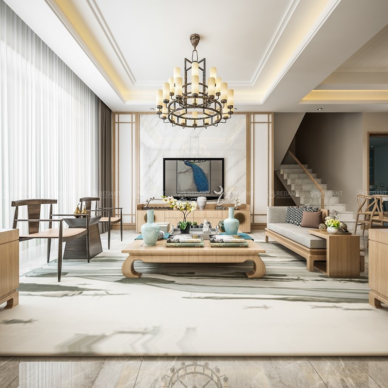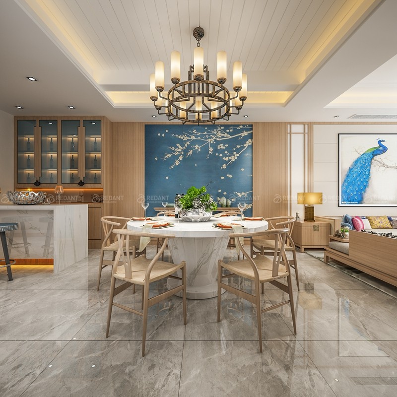 本案为新中式风格,客餐厅运用了大量的现代元素,例如仿大理石砖、金属线条、大理石风景石、实木线条以及银镜等,彰显了现代新中式的时尚感和理性。柚木色的家具和木饰面体现了新中式深厚的文化底蕴和内涵,简约而不简单。