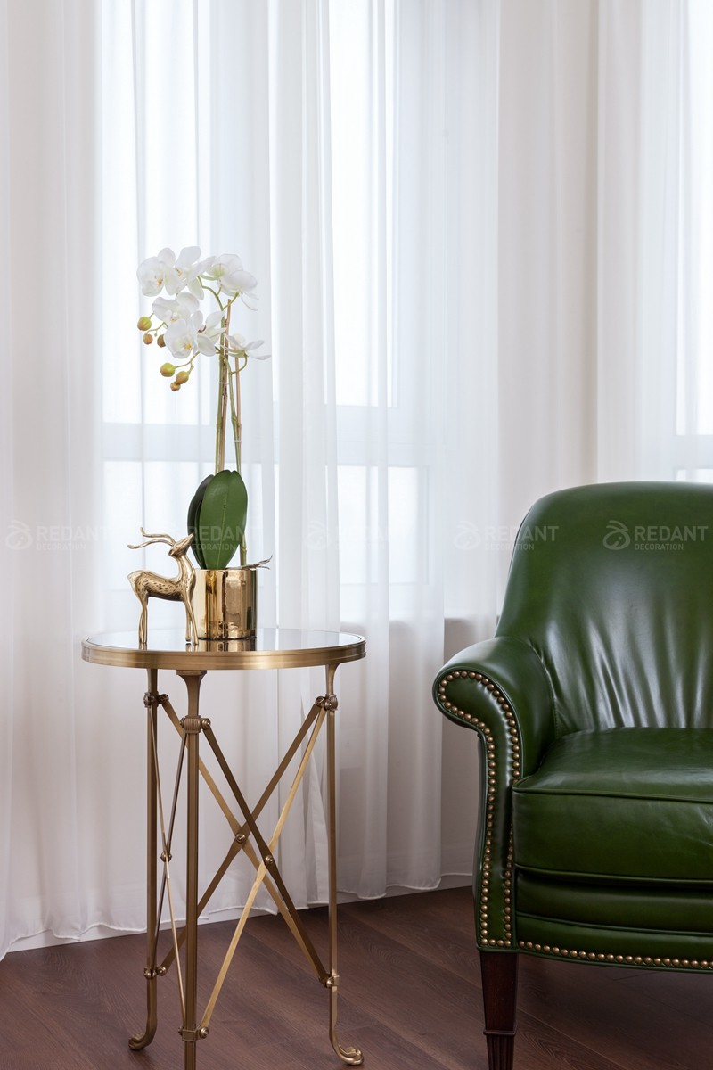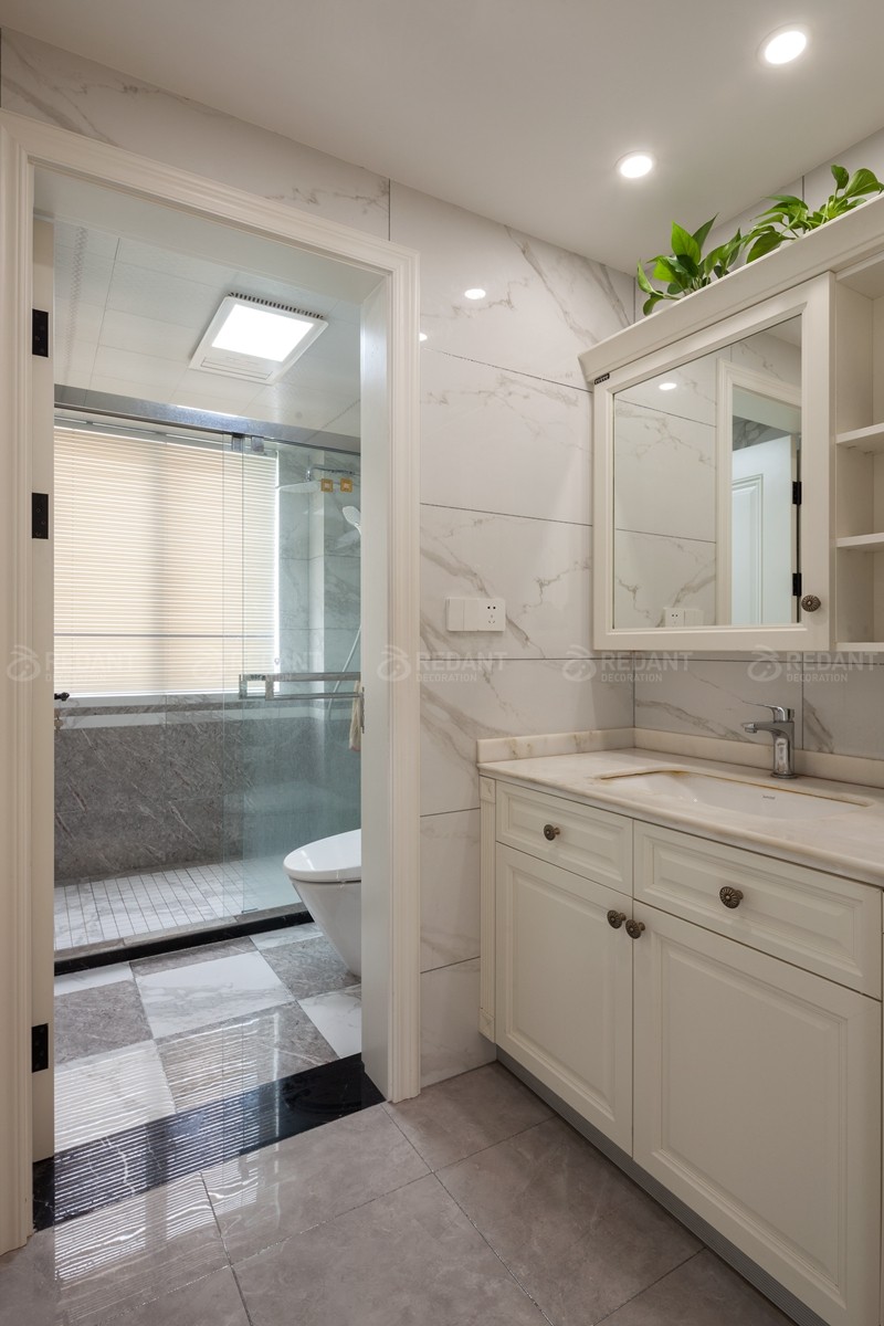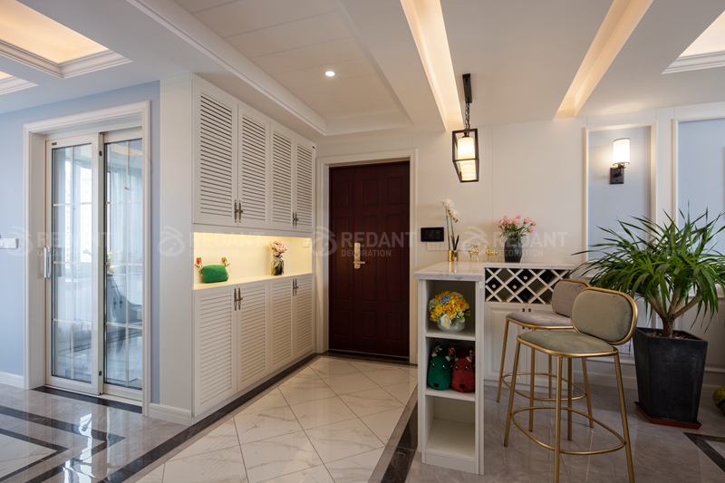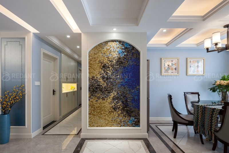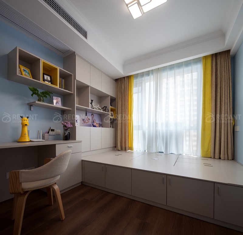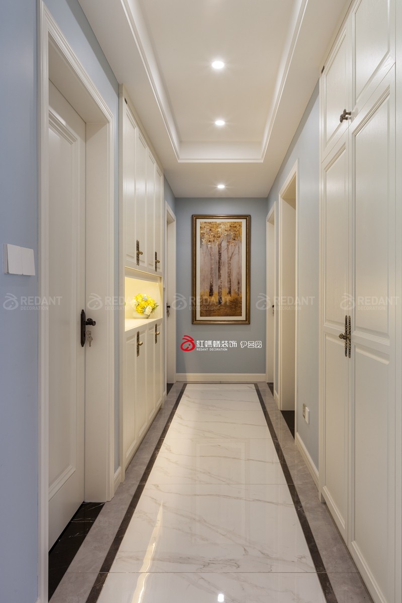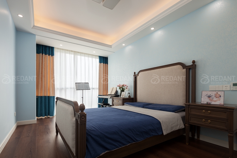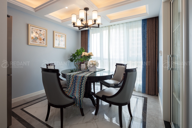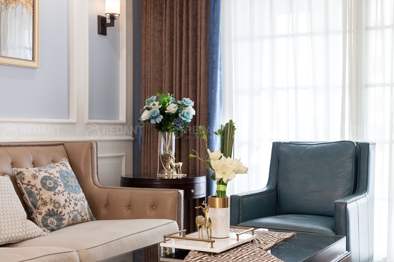 整体大面积浅灰蓝色的色调给人以放松闲适之感,我们并没有选过于浓重的色彩作为主色调。而蓝色和白色护墙板的结合又仿佛冰激淋般香甜,营造出一种梦幻舒适的居住氛围,用带有对比色黄色的装饰画点缀,增添一份活泼感。客厅硬包背景上添加了铆钉元素,这与颇具美式韵味皮质布艺结合的铆钉款家具呼应配合,整体空间设计淡雅不失韵味,清新不失格调。