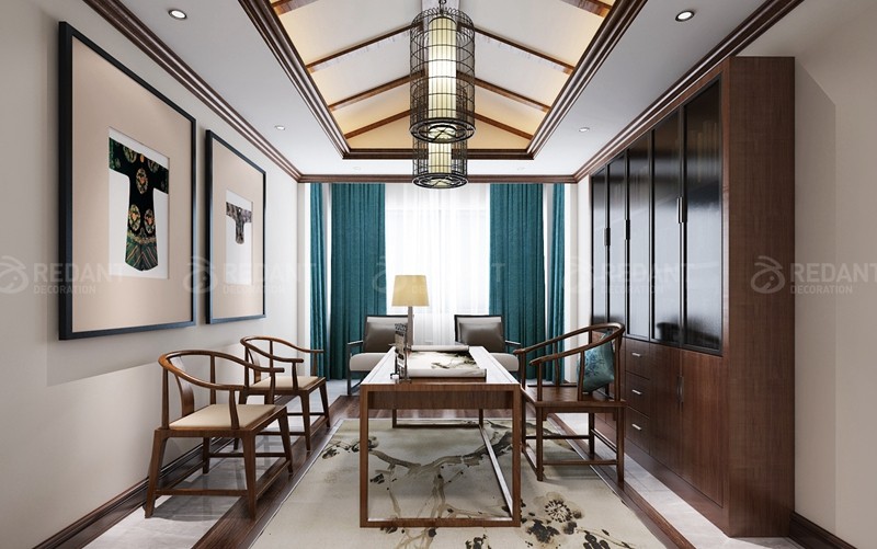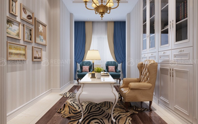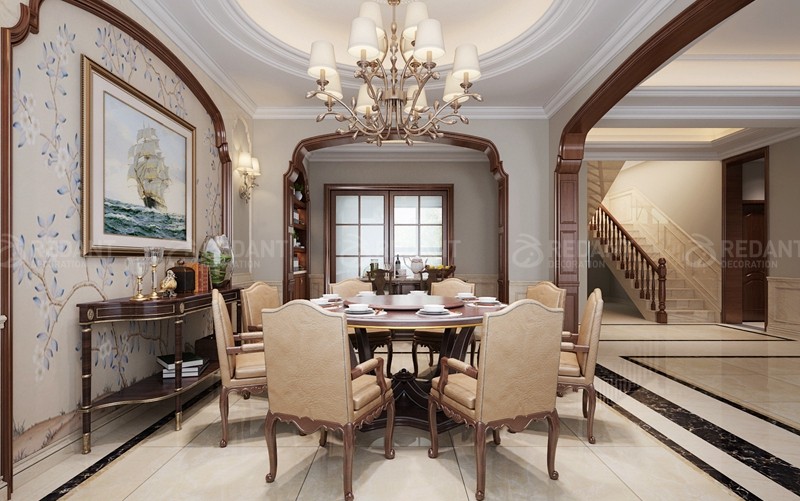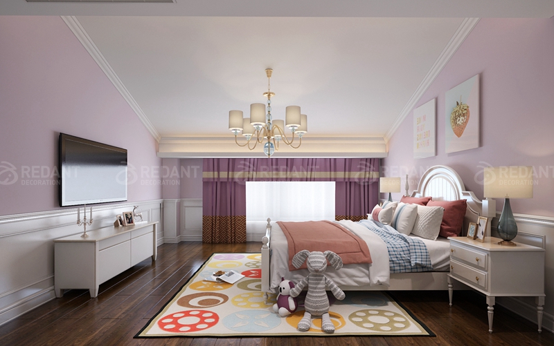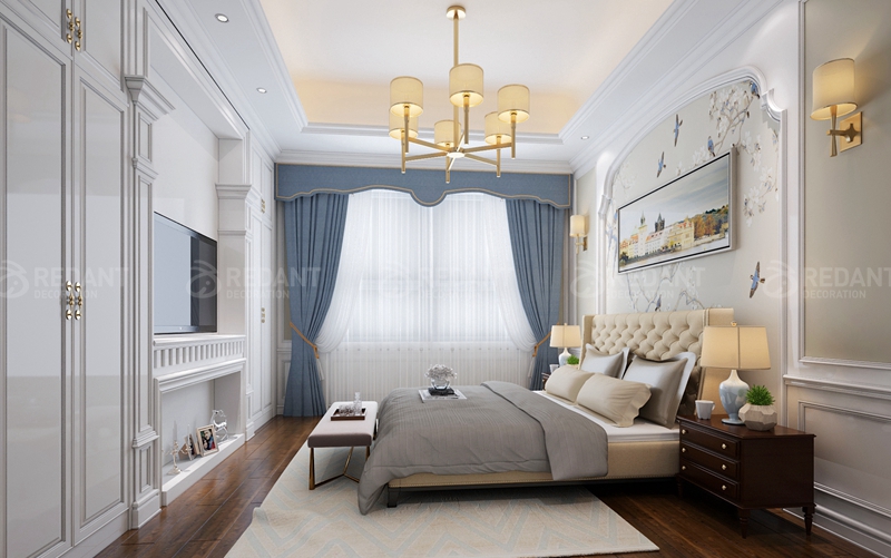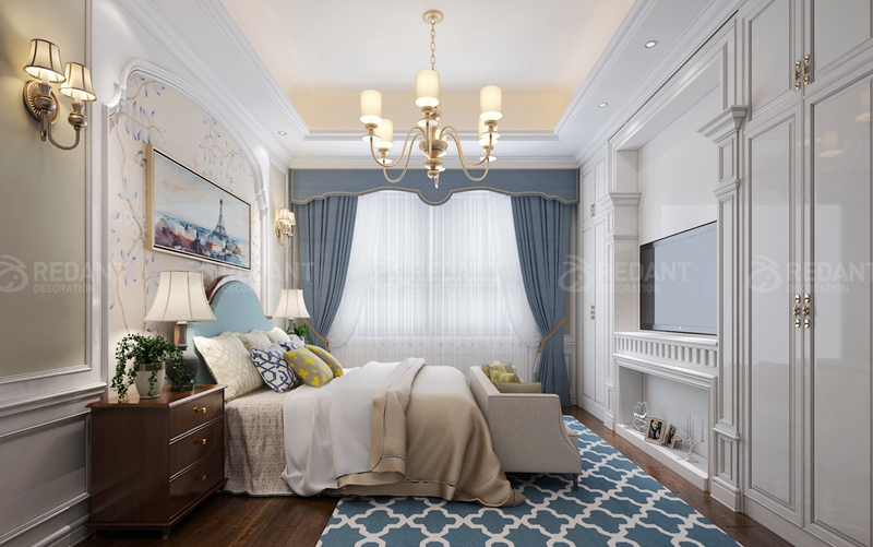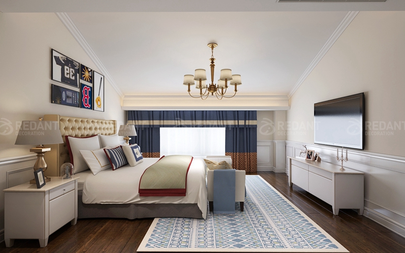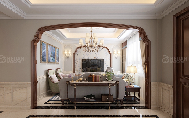 本案整体设计风格定义为现代美式风格。一楼客厅主要是艺术图料为主,部分墙面采用了大理石护墙的设计。二楼是业主休息的空间,设计以温馨现代为主,卧室采用白色护墙板设计,使整个空间更加宽敞明亮,从而营造出了业主心目中的理想家园。在整体软装设计方面,设计师采用了布艺的家具为主,仿大理石砖,背景喷墨墙纸,少许硬包等来达到最后的一个效果表现。