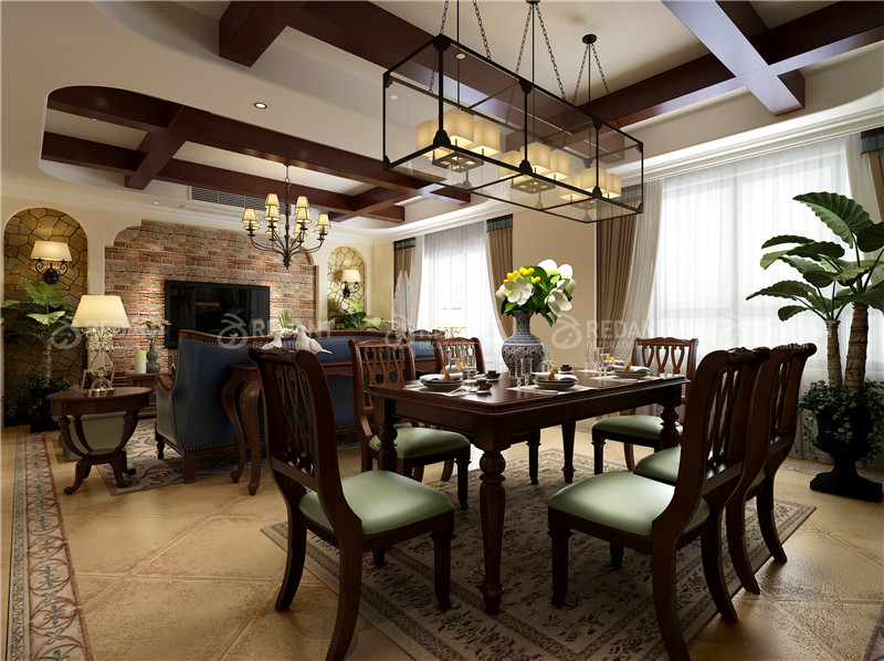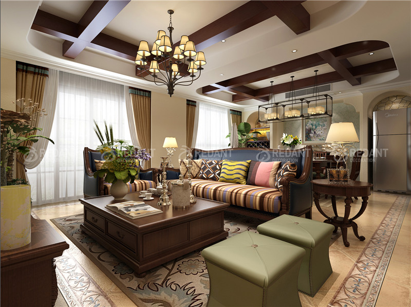 设计师从不同的角度对传统空间进行了新的诠释。将整个居室的格调定位在一个历史时期。色彩的渲染,使整个空间充满了轻松,闲适的气氛。地面的磨砂玻化砖与暗红色的木地板交相呼应,后期陈设将现代与中式完美地融合,别有一番味道