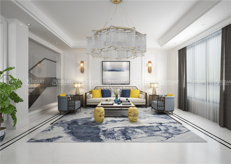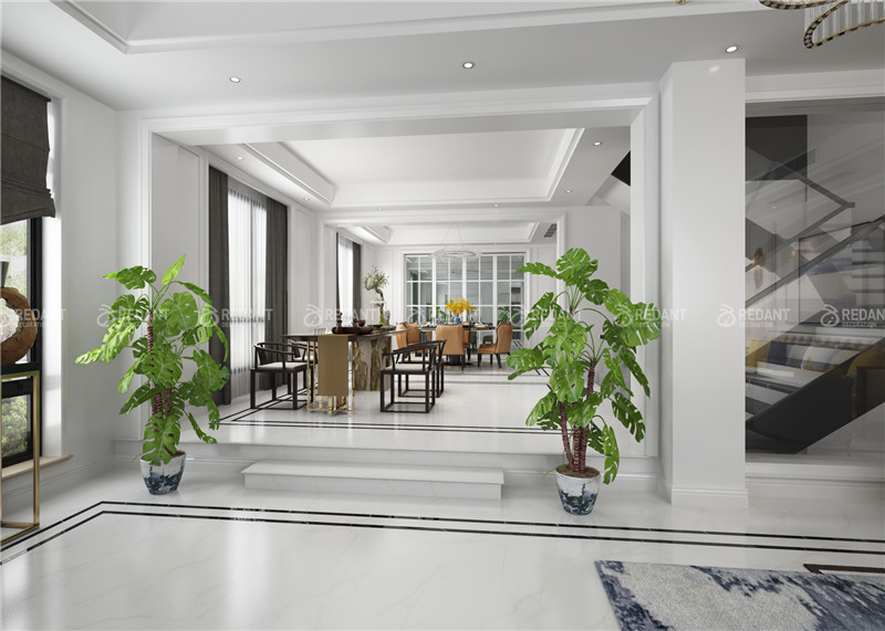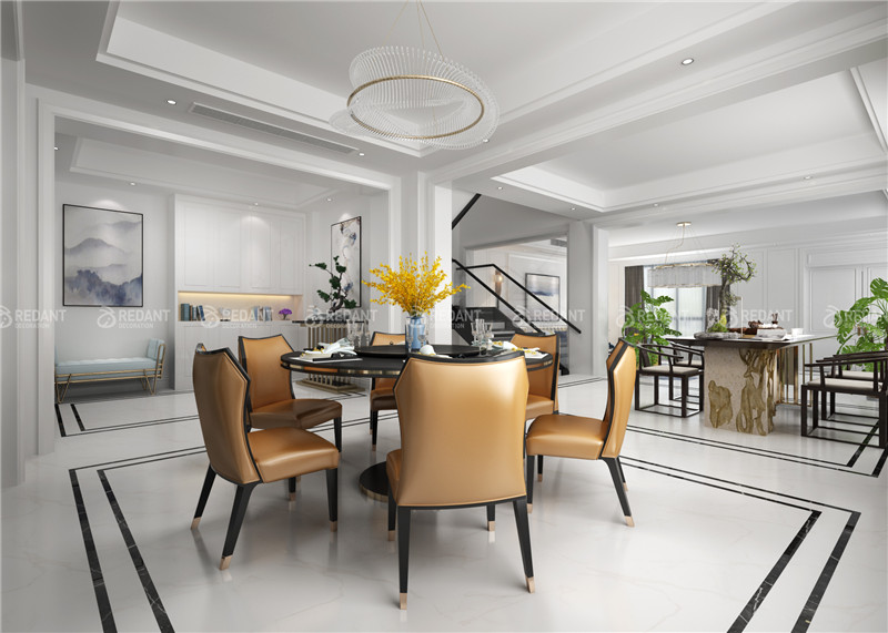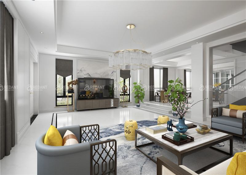 凯旋湾3-105的客厅背景采用大量的白色护墙板,与餐厅的造型相呼应,讲究空间的层次感,家具搭配以古典家具或现代家具与古典家具相结合。设计手法上采用了新中式元素的整体应用上,在细小的造型上添加了白色护墙版,线条等元素,来完美体现新中式给我们带来的理性和宁静。