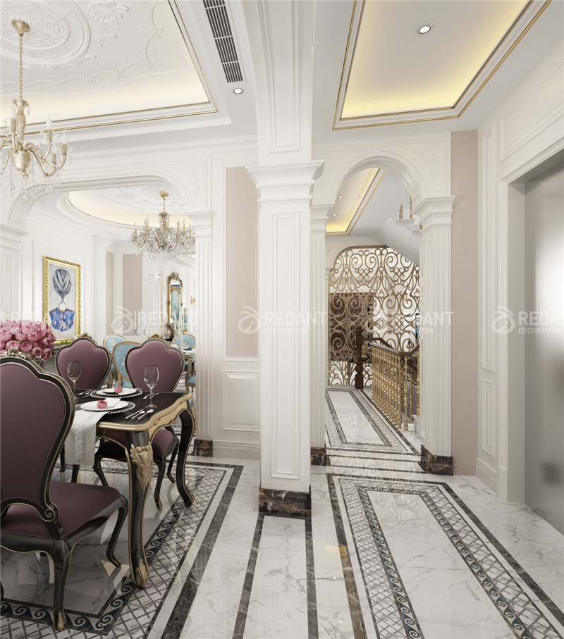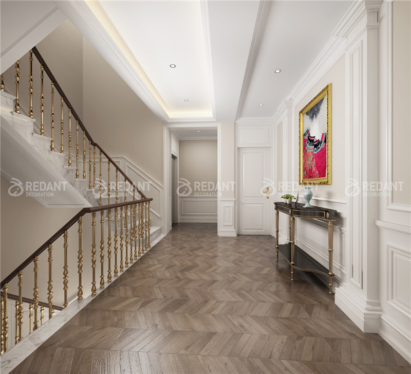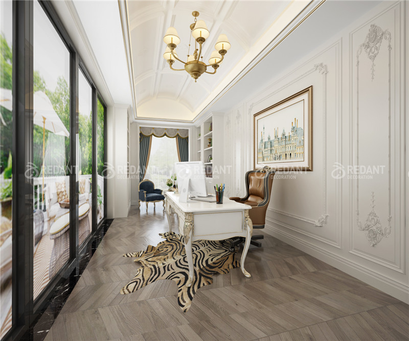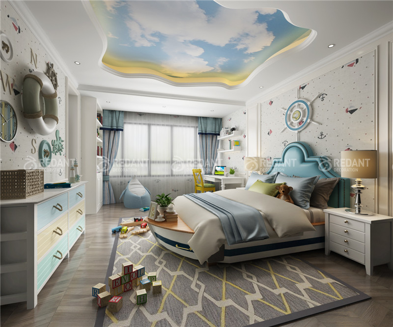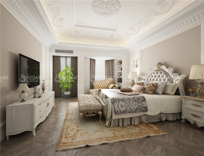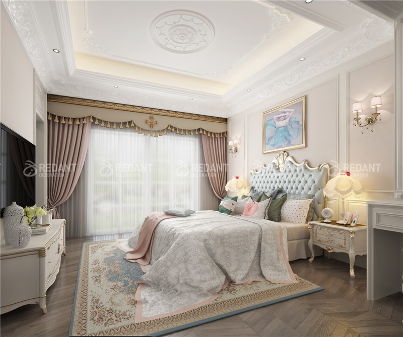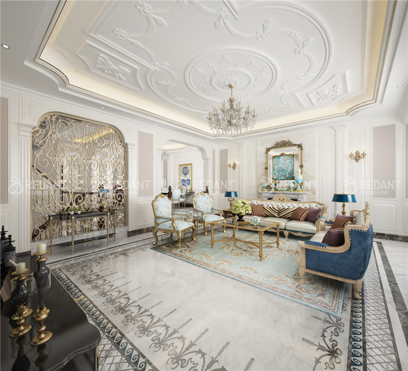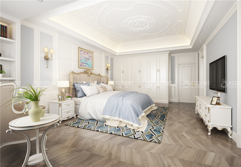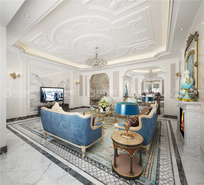 中南世纪城采用的是法式风格,蓝白色系,运用白色护墙。布局上突出轴线的对称,恢弘的气势,豪华舒适的居住空间。效果贵气风格,高贵典雅,细节处理上运用了法式廊柱、雕花、线条,制作工艺精细考究,点缀在自然中,崇尚冲突之美。