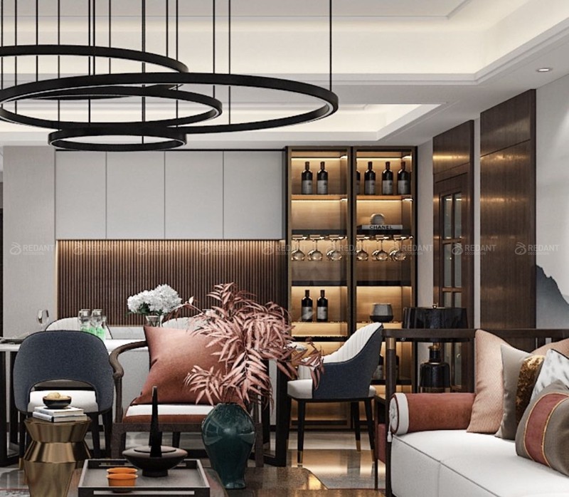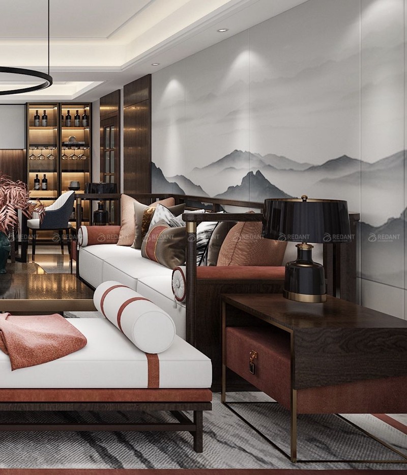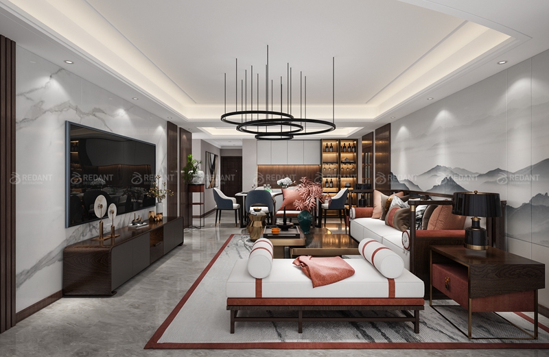 新中式风格特点及设计说明本案以“韵”为题,在整体空间中和谐基调上彰显出浪漫的气质,软装与硬装上的中式元素的运用,成就了本案的精髓与灵魂,设计中不拘泥于单一的设计风格,力图在奢华优雅中呈现出中式的文化气息,追求深沉里显露尊贵,典雅中浸透奢华的设计表现.