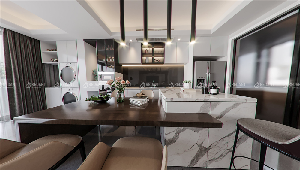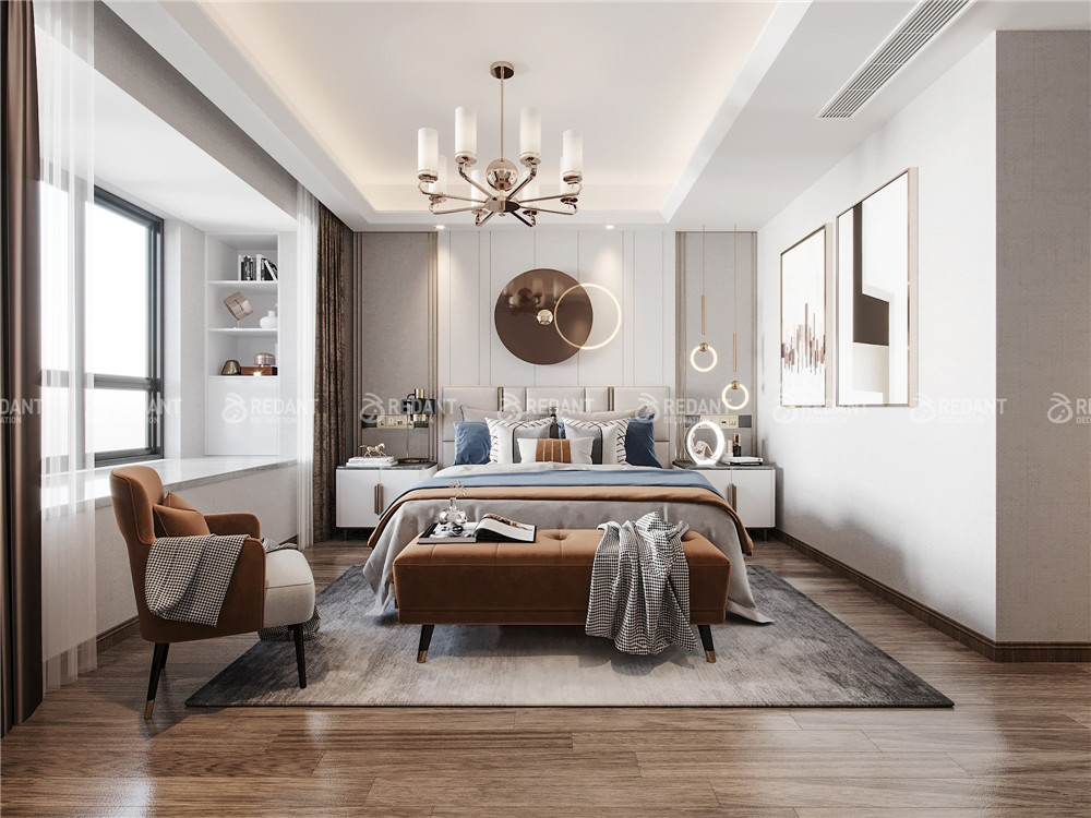 本案为现代轻奢风格,通过干干净净的设计手法,将业主的工作空间巧妙地融入到生活空间中。