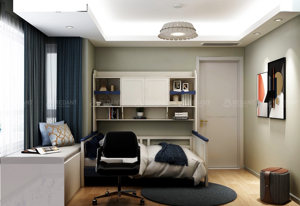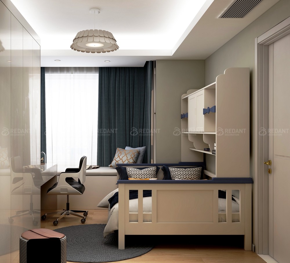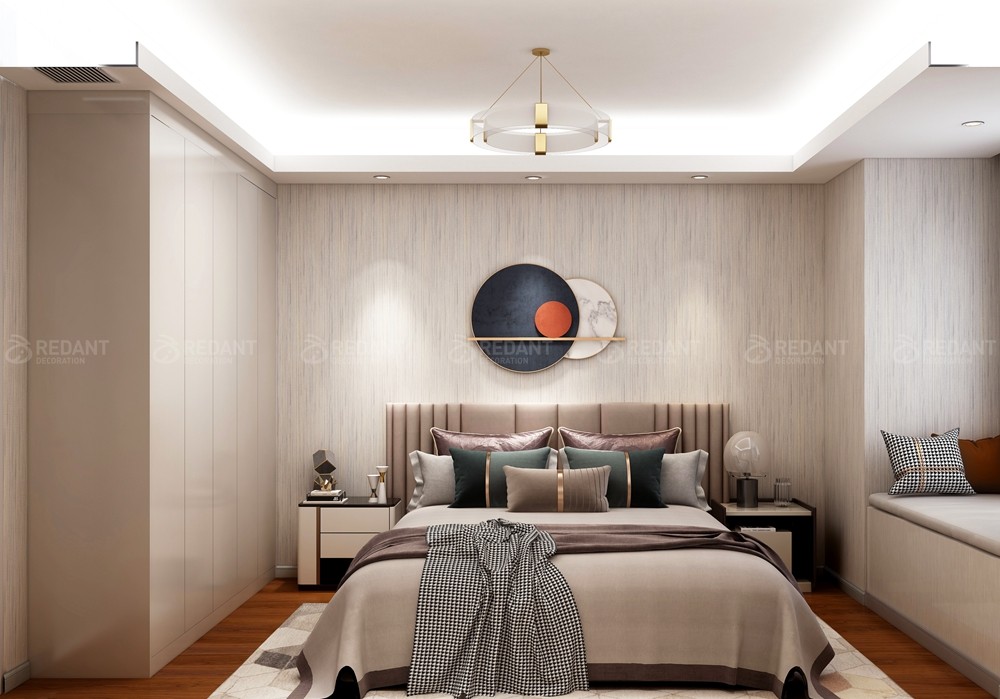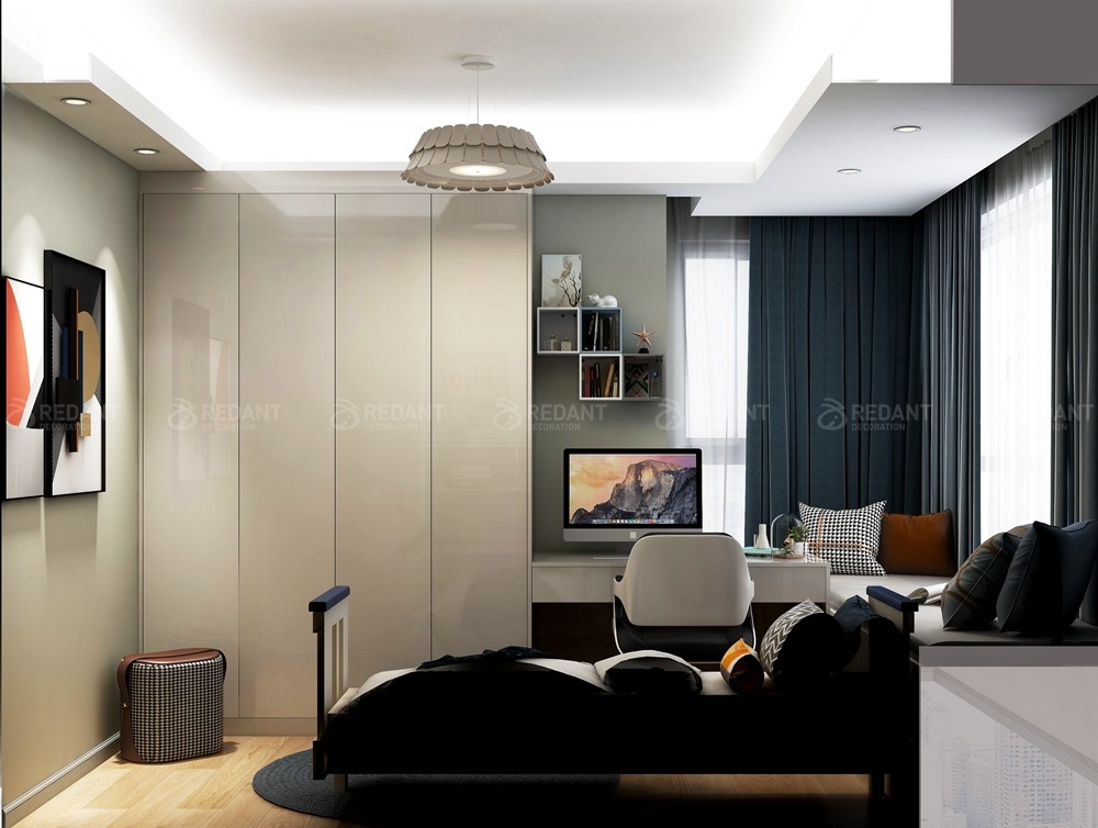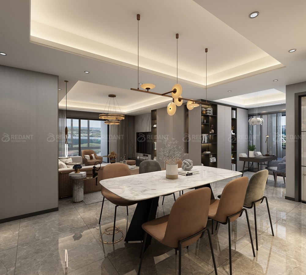 本案3室2厅1厨2卫的平层住宅. 环境优美,业主比较时尚,整体空间以简约舒适的浅度灰色调,布置上自然雅致的软装家具,使得空间充满轻松与惬意的舒适气息, 质感布艺沙发及深灰窗帘为主色调,给予静宁、素雅、平和之体验,引入去触摸、去感受、去发现、体会生活的美好, 现代简约风格,融入一点极简、一点工业风,自然质朴原生态的气息中,亦具有生活的温度。大平层,空间多、门多,容易造成视觉的杂乱,因此大量采用了隐形门的设计。随机纹理的艺术漆墙面,文艺复古的跳色,极具特色的家具,营造不经意间的惊喜,极简的黑白灰调子,却在不同材质、不同纹理的变化中,产生丰富的变奏。墙面,灰色艺术漆大块、大胆涂抹,带来手工的灵动与韵味。地面,花纹如细沙般流动的哑光地砖,纯朴、自然、空灵。其间,波普条纹不规则拼贴的装饰柜、紫红色皮革单椅的意外混搭,却毫无违和感,时尚又复古。如同“出走半生,归来犹少”的灵魂,安静而有趣,不张扬却个性十足。