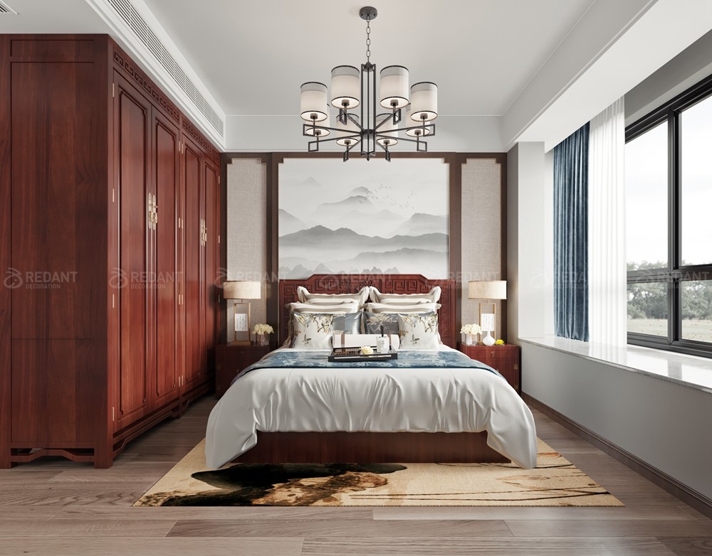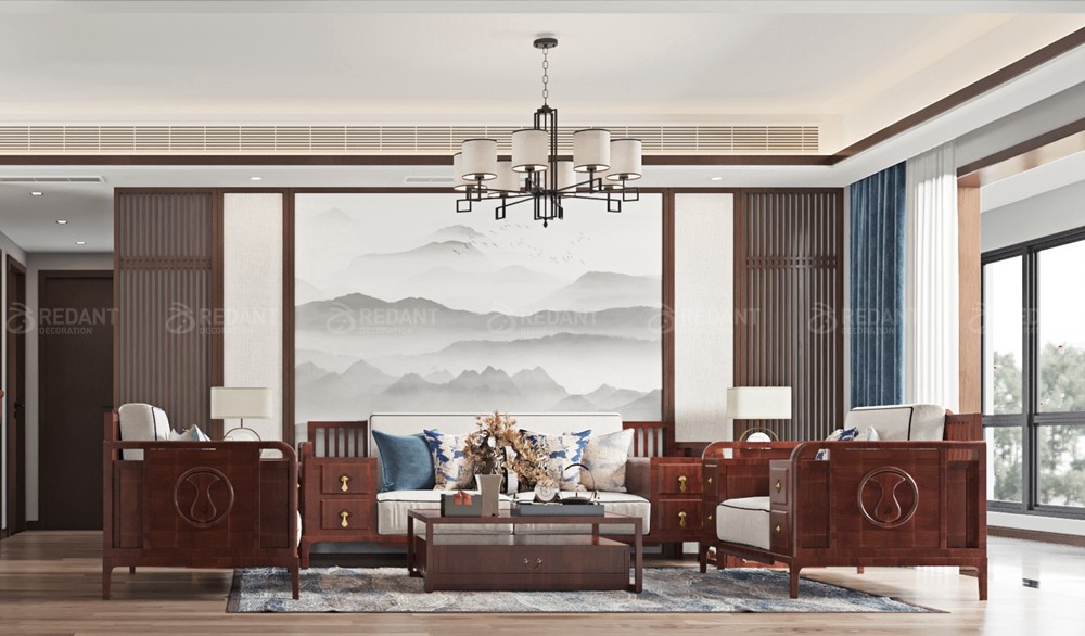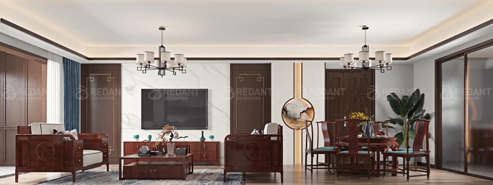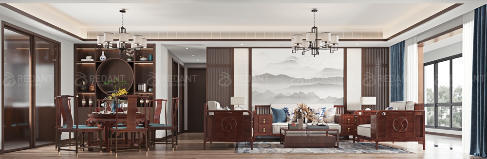 本案属于精装改造。经过研讨,我们将主题定位为中式风格。简洁、干净、舒服、没有约束。以米色系为主、开放式的大厅设计给人以通透之感,避免视觉给人带来的压迫感,没有夸张,不显浮华,通过过于干干净净的设计手法,将业主的工作空间巧妙地融入到生活空间中。