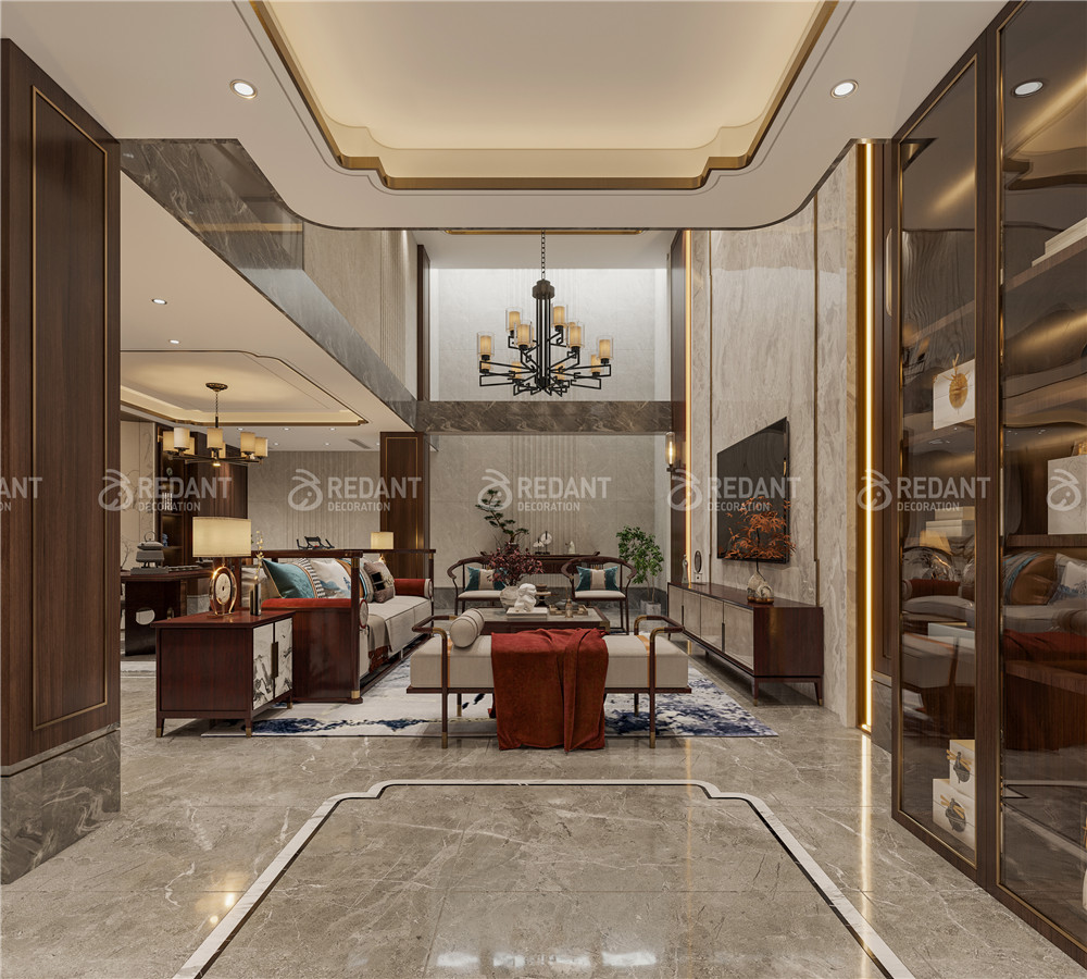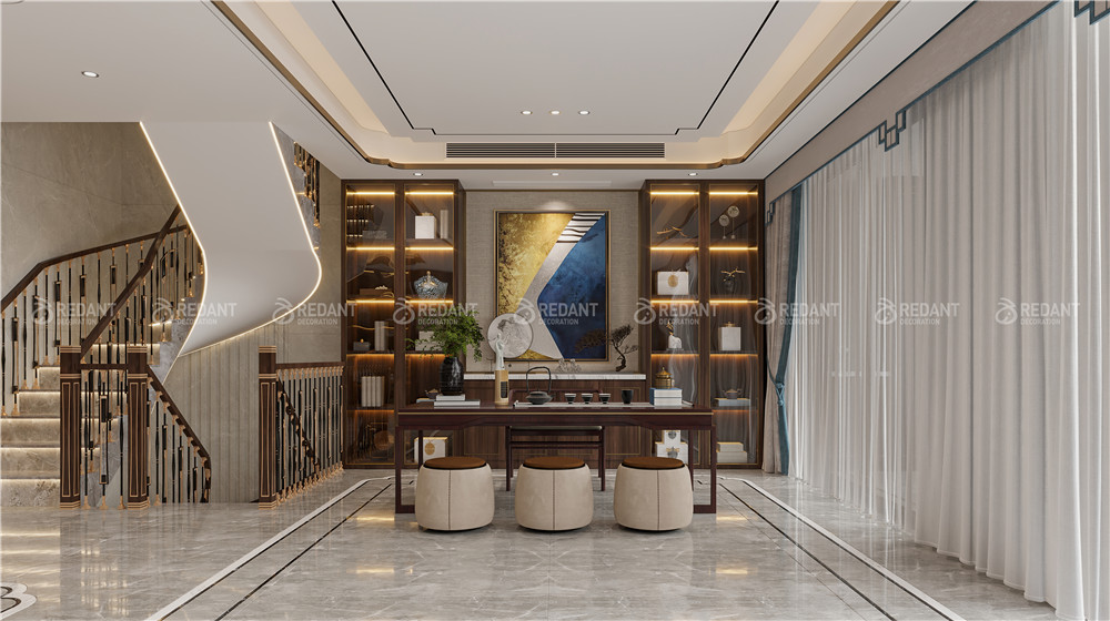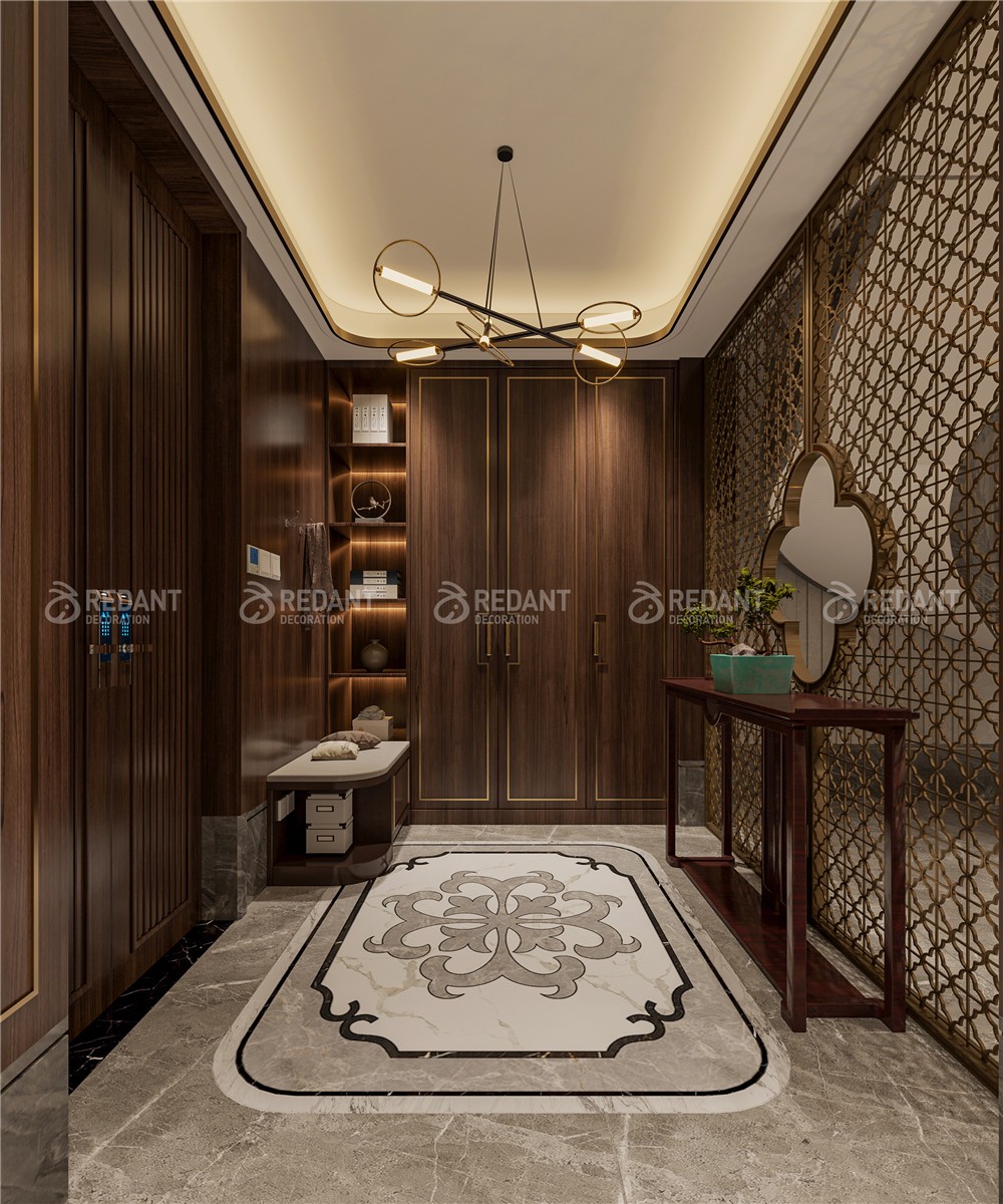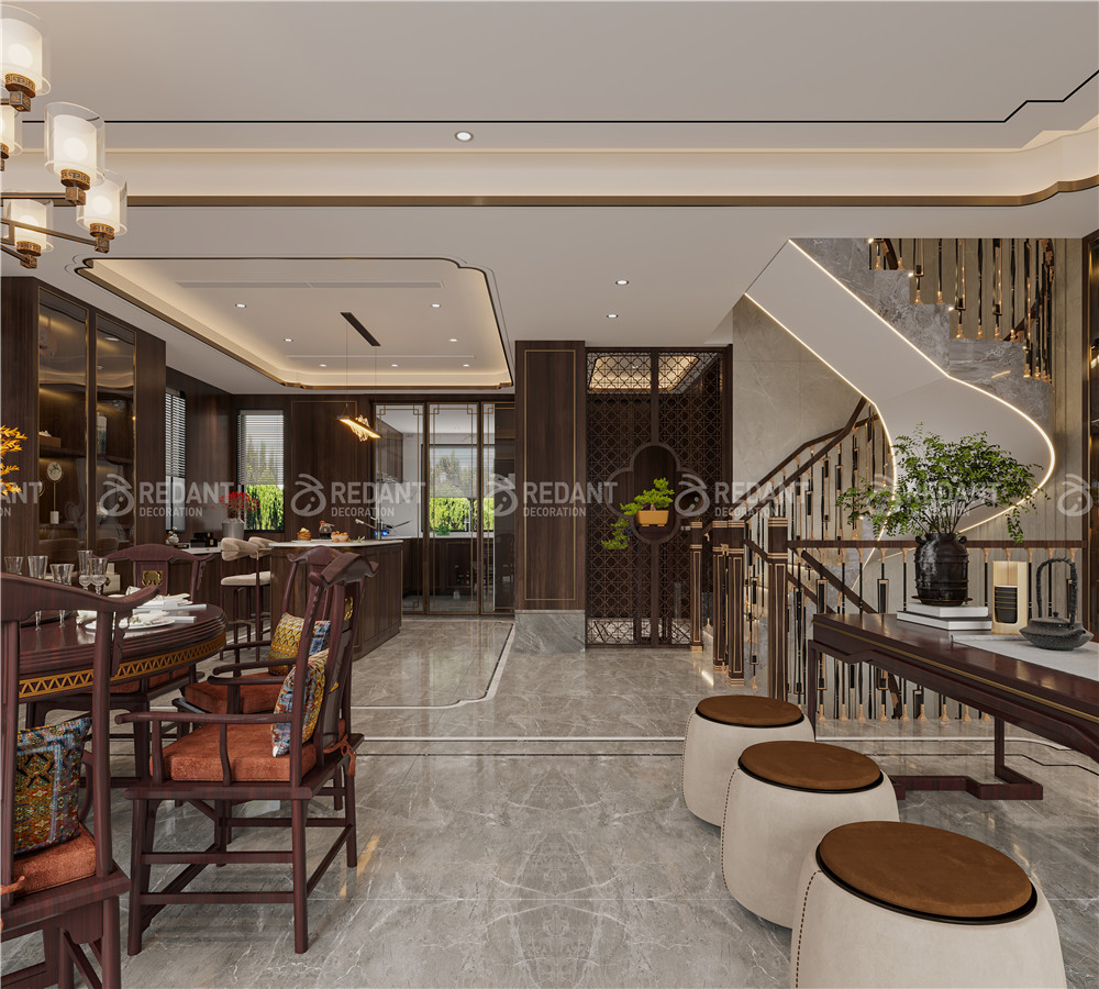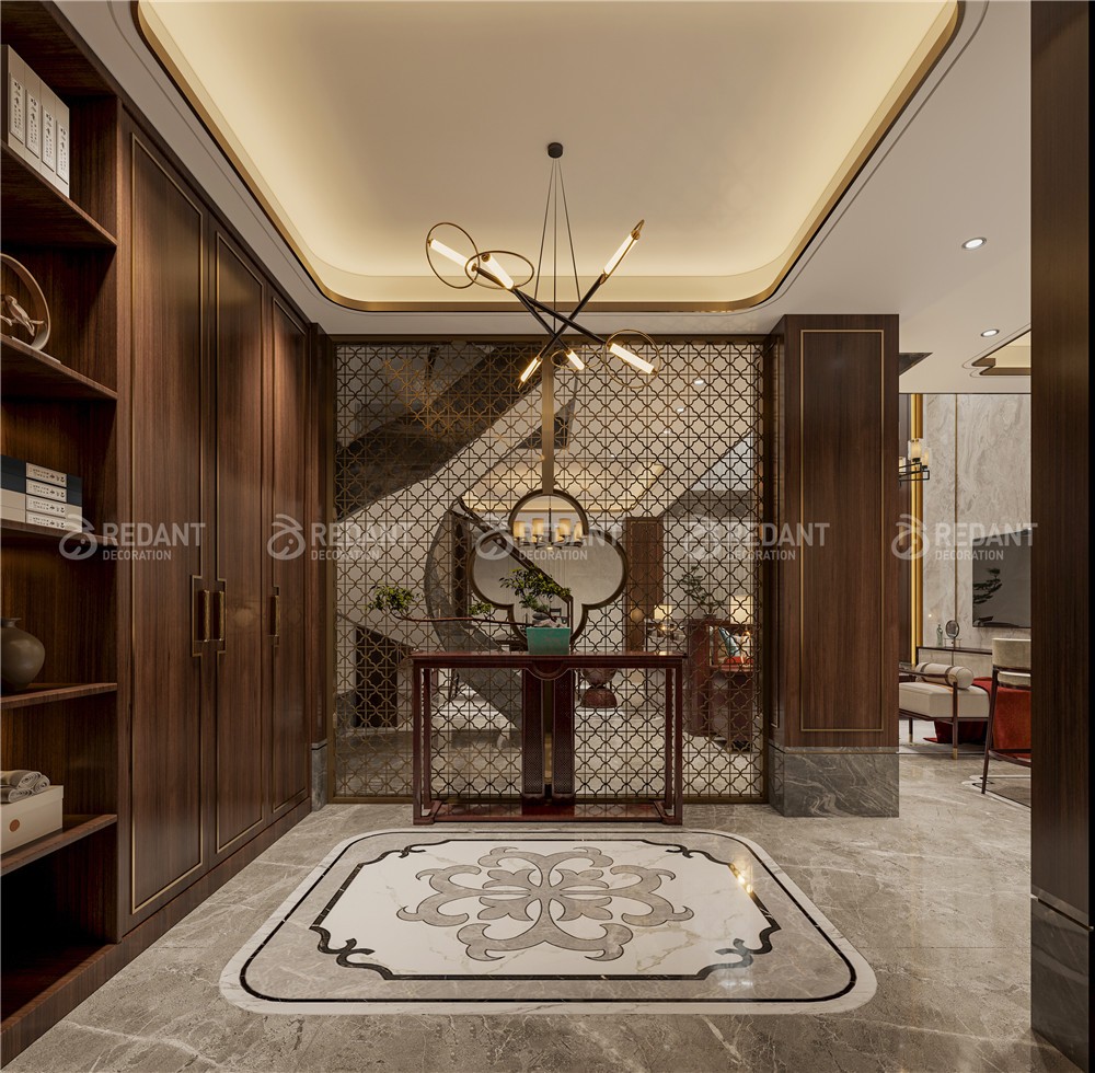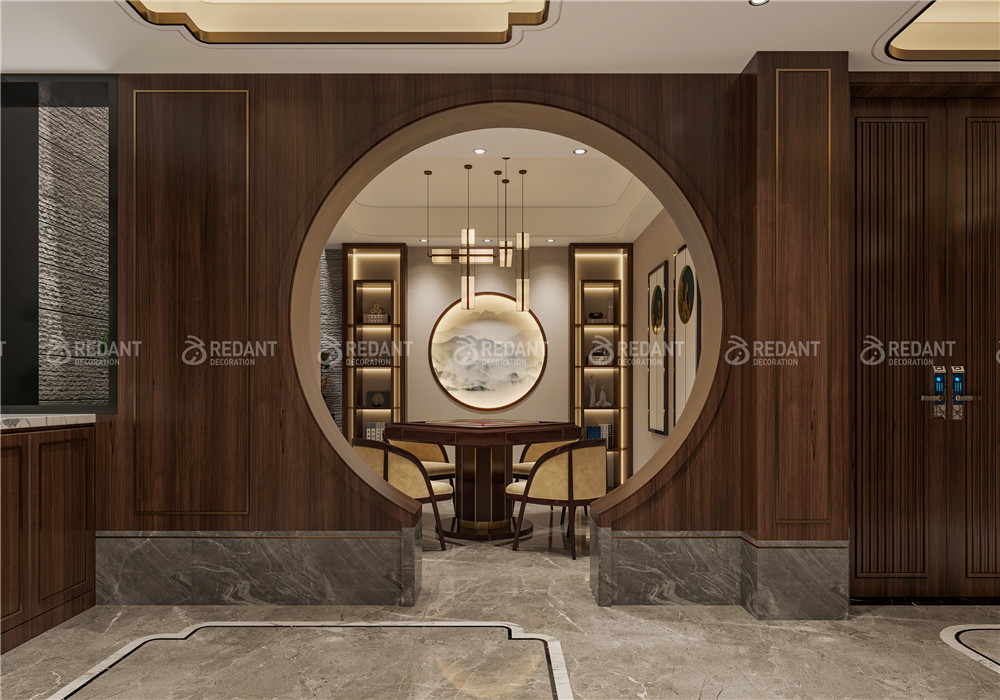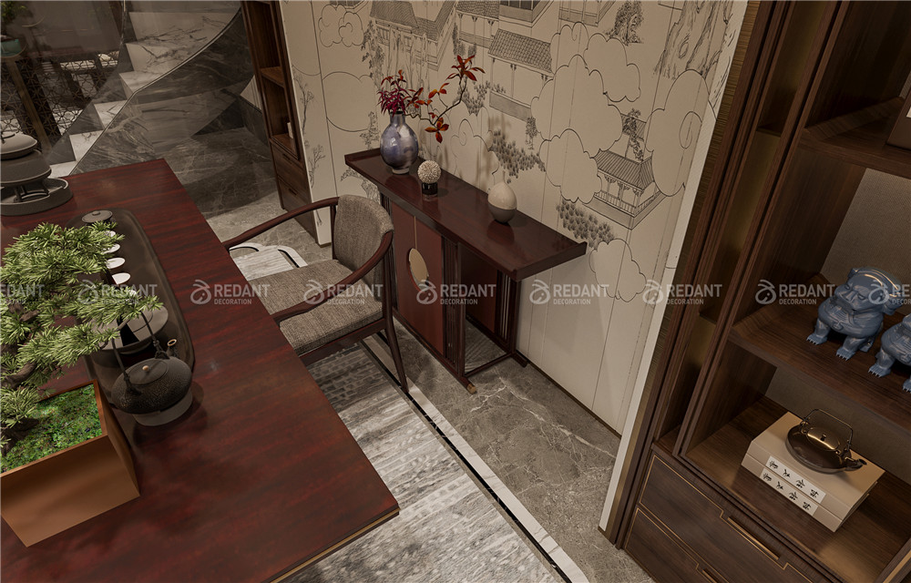 中式风格更多地利用了后现代手法,墙上挂一幅中国山水画等传统的书房里自然少不了书柜、书案以及文房四宝。 中式风格的客厅具有内蕴的风格,为了舒服,中式的环境中也常常用到沙发,但颜色仍然体现着中式的古朴,中式风格这种表现使整个空间,传统中透着现代,现代中揉着古典。