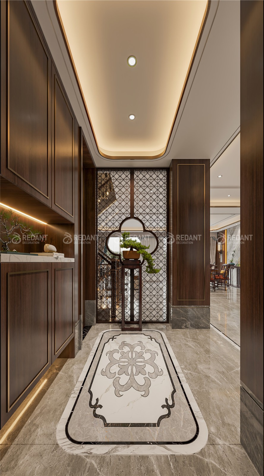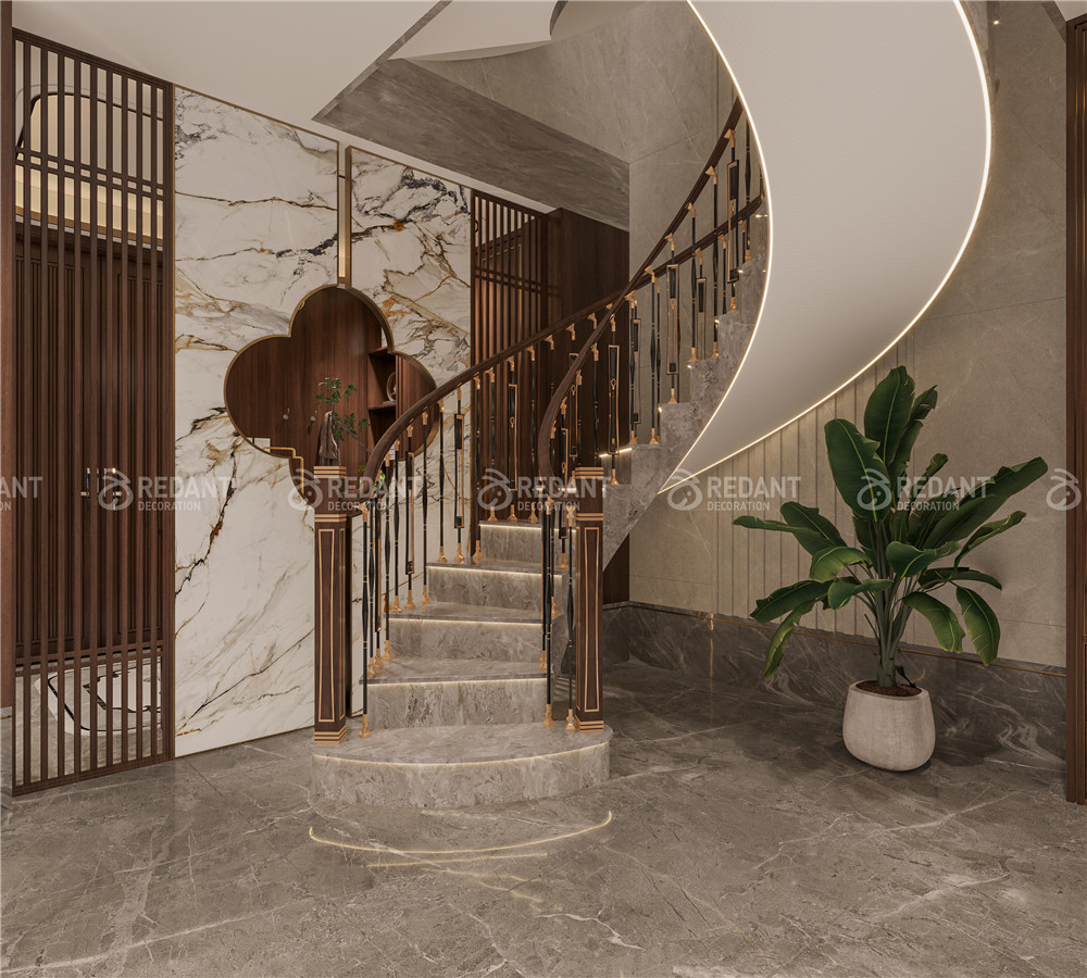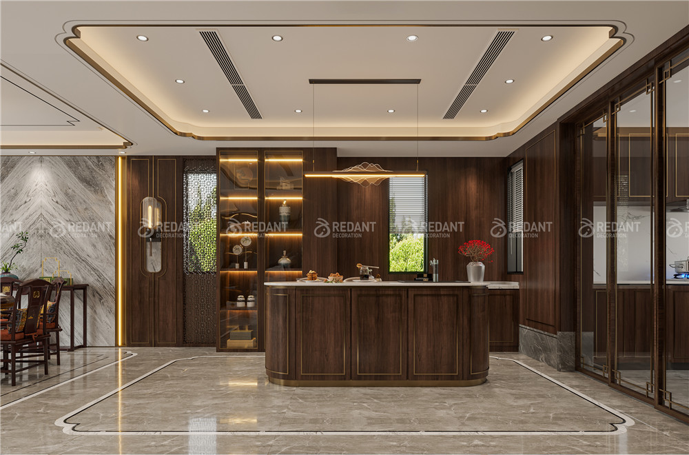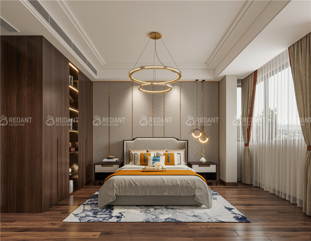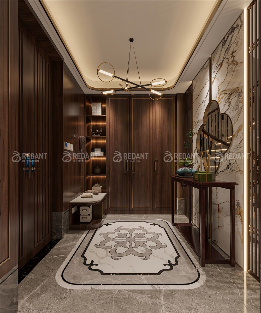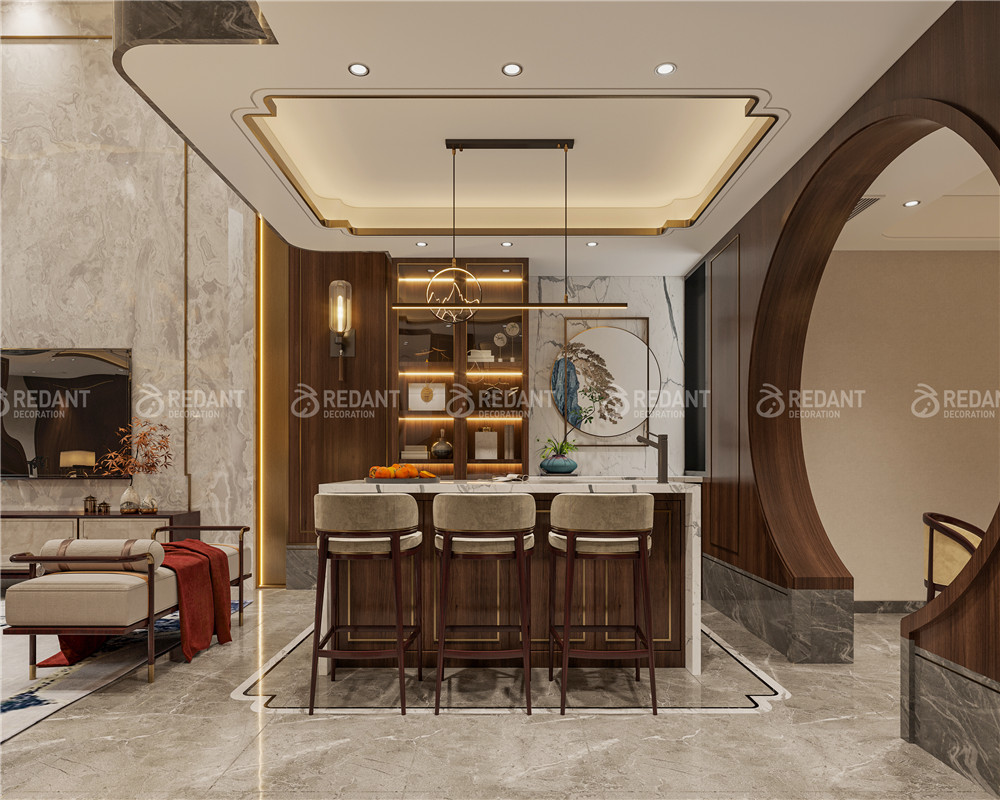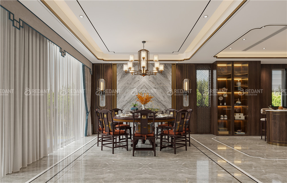 中式风格更多地利用了后现代手法,墙上挂一幅中国山水画等传统的书房里自然少不了书柜、书案以及文房四宝。 中式风格的客厅具有内蕴的风格,为了舒服,中式的环境中也常常用到沙发,但颜色仍然体现着中式的古朴,中式风格这种表现使整个空间,传统中透着现代,现代中揉着古典。