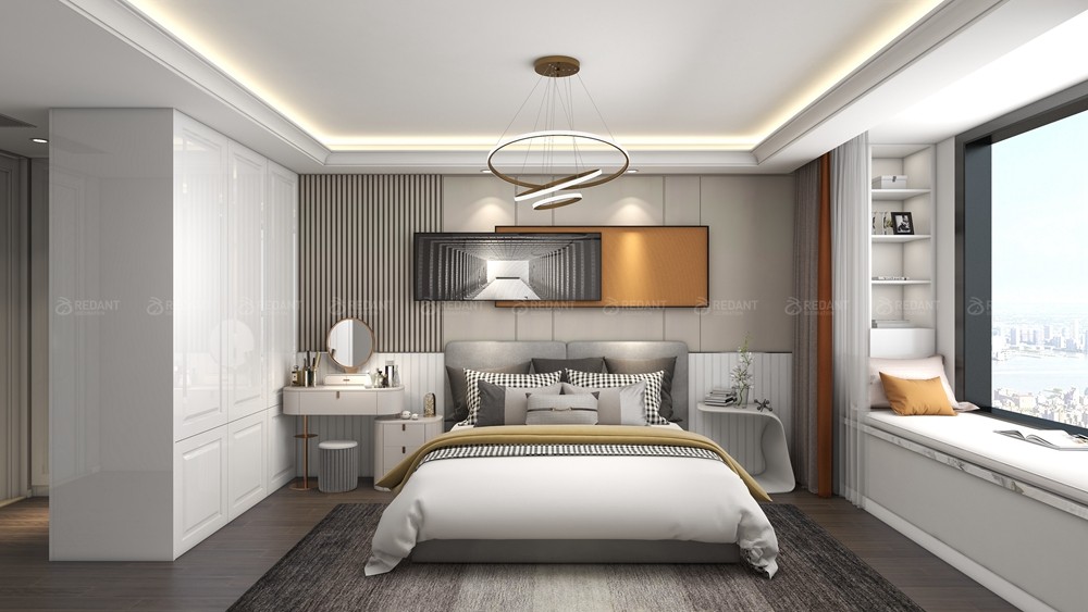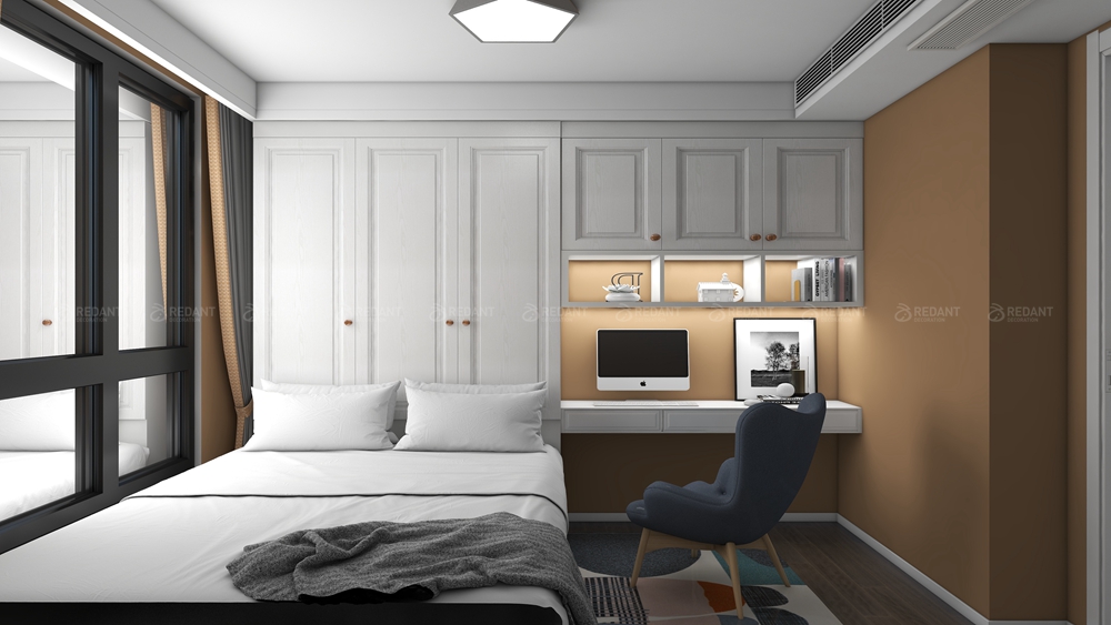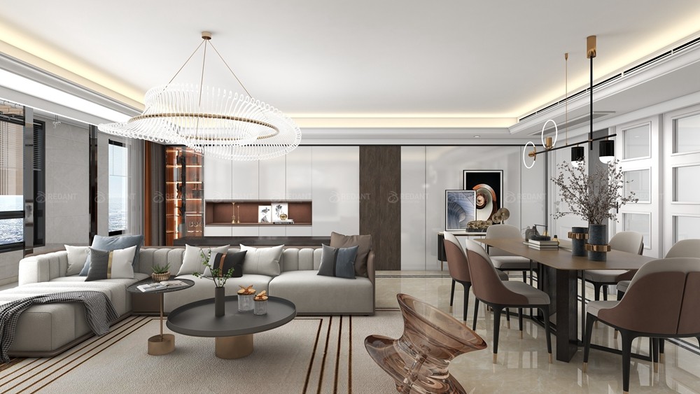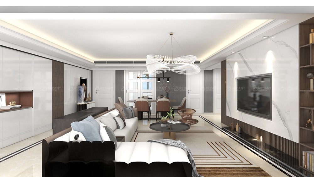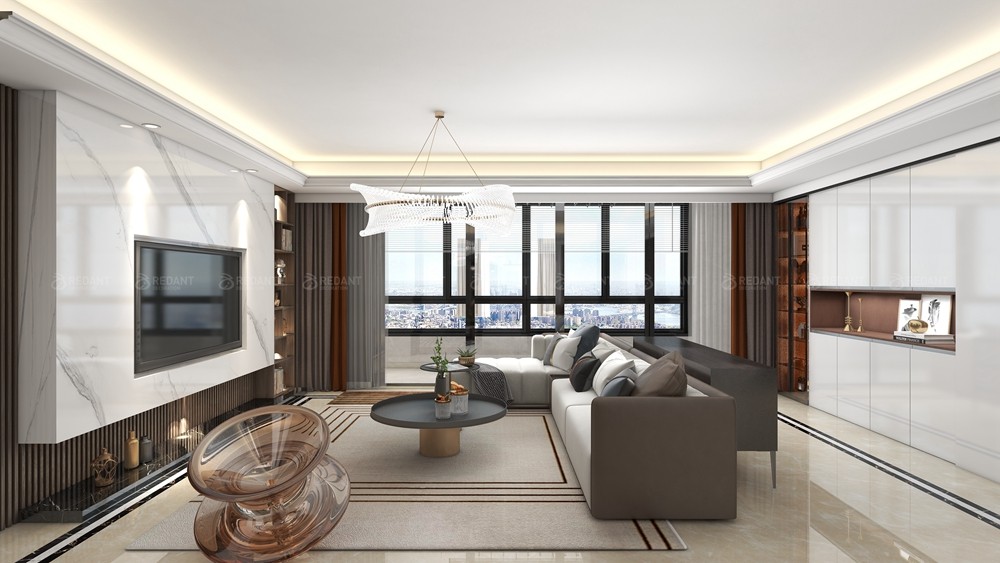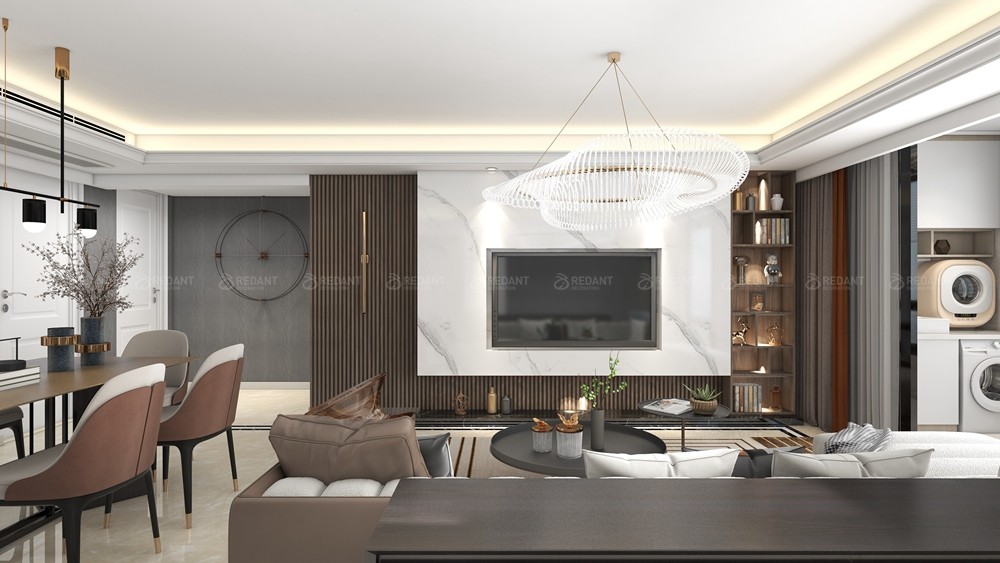 本案客户没有固定风格,喜欢现代时尚的家具感觉,本案中采用岩板和木饰面的结合,加上灯带,营造轻松时尚的家庭风格,拆除原始西卧室门,改造成一体式的沙发背景墙,进门就有宽敞大气的既视感,整个色调以岩板+木色为主,让空间看上去非常简洁,大气。规划选用简约现代的个性是思维追求和精力兴趣的直接反映,它与自个的文化背景和家庭涵养的基础上,在建立个性以后,又思考到布局以完成特定需要的个性情调。选用质地清晰的木色,沙发环绕着茶几,沙发独立成组靠在一角,给人一种舒服安静的感觉。