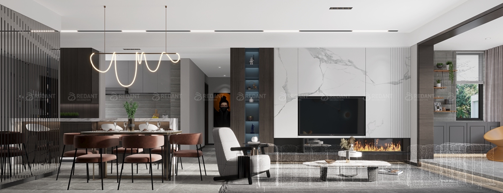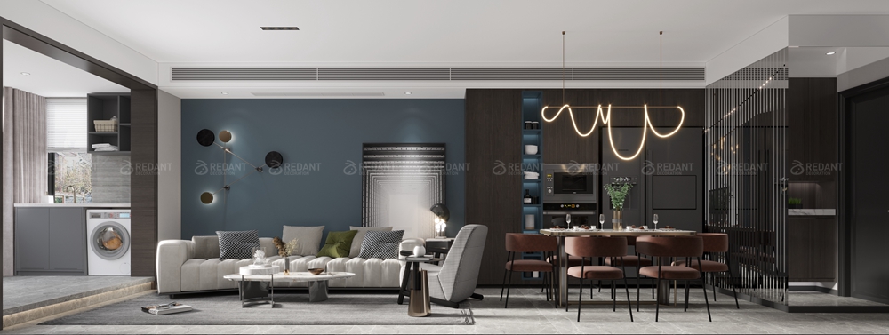 整个空间层次分明,不仅扩展了整个空间的视野,更是增加了整体的简约美观性。内嵌式电视搭配收纳柜,使整个空间更具有层次感。无主灯的设计,以沙发搭配金属色球型装饰灯凸显空间的舒适性。背景墙部分以蓝色与餐边柜质感木色相结合,富有艺术感。简约线管吊灯,赋予了空间的高级感。深色内嵌柜增加了收纳功能区,着重体现了整体的现代风。入户墙和餐厅部分墙面做镜面设计,视觉增大空间。