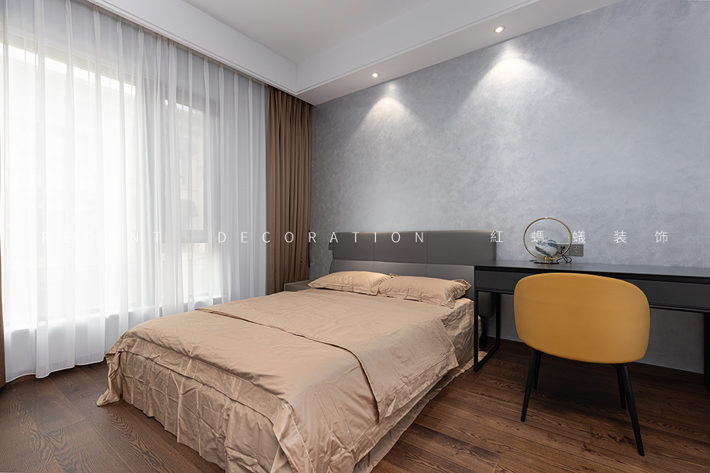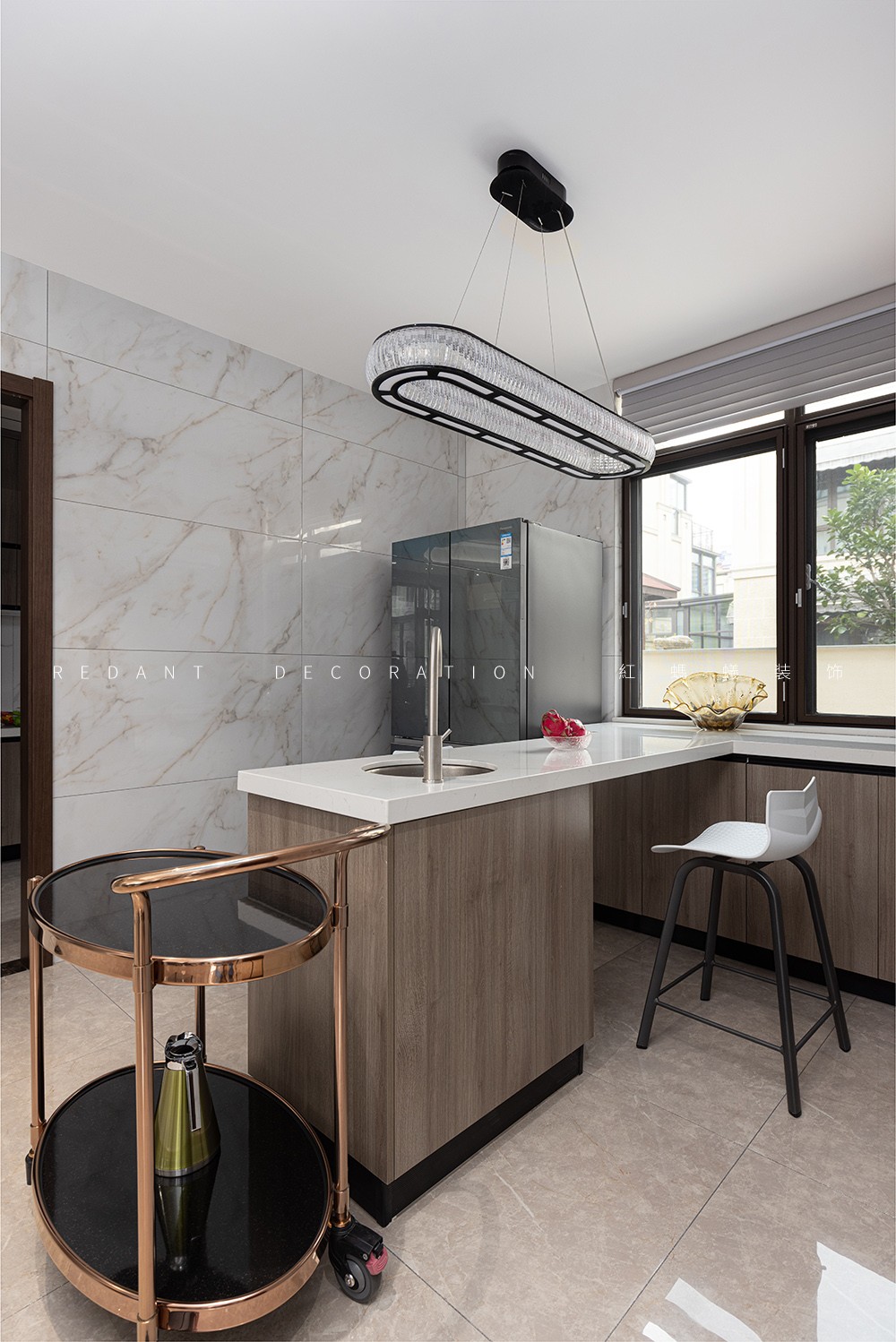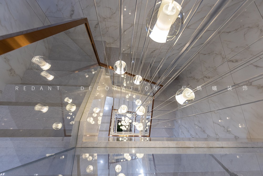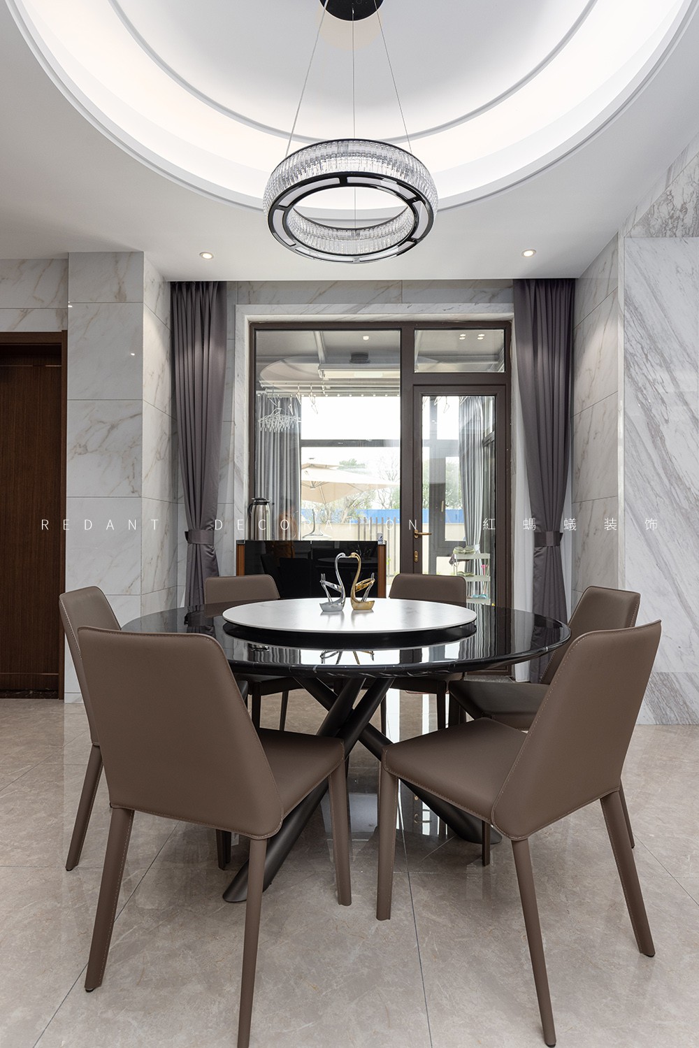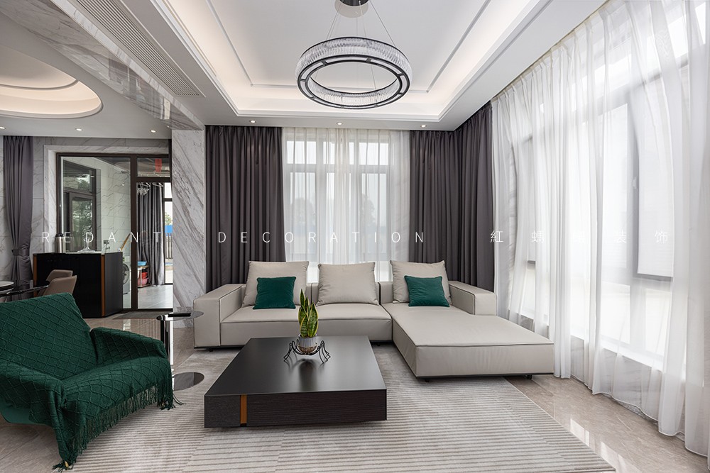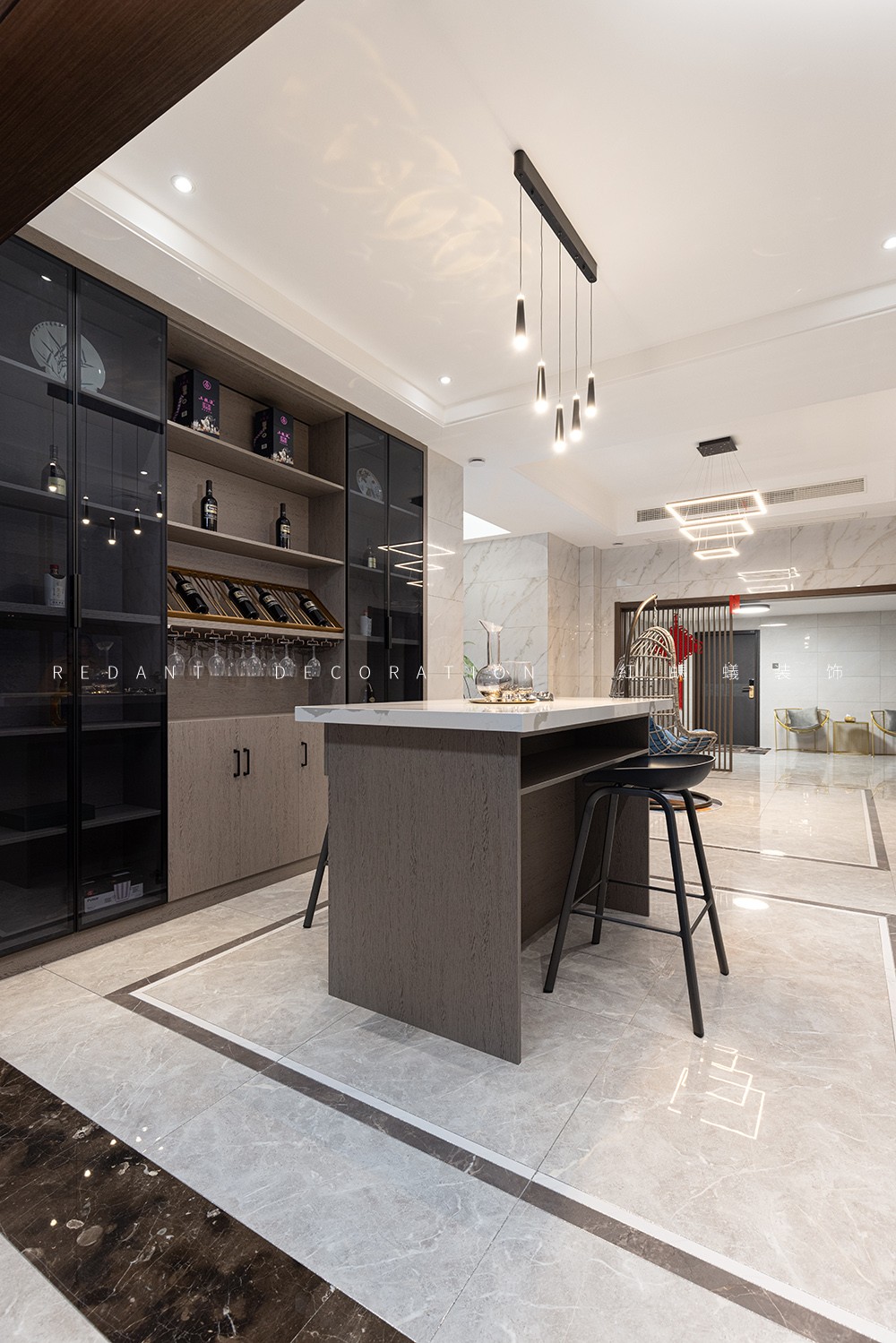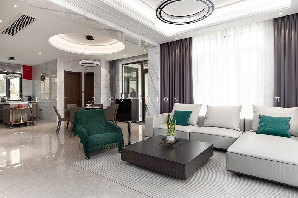 面对扰嚷的都市生活,一处能让心灵沉淀的生活空间,是业主心中的一份渴望,也是在该方案中所体现的主要思想。因此,开放式的大厅设计给人以通透之感,避免视觉给人带来的压迫感,可缓解业主工作一天的疲惫。没有夸张,不显浮华。