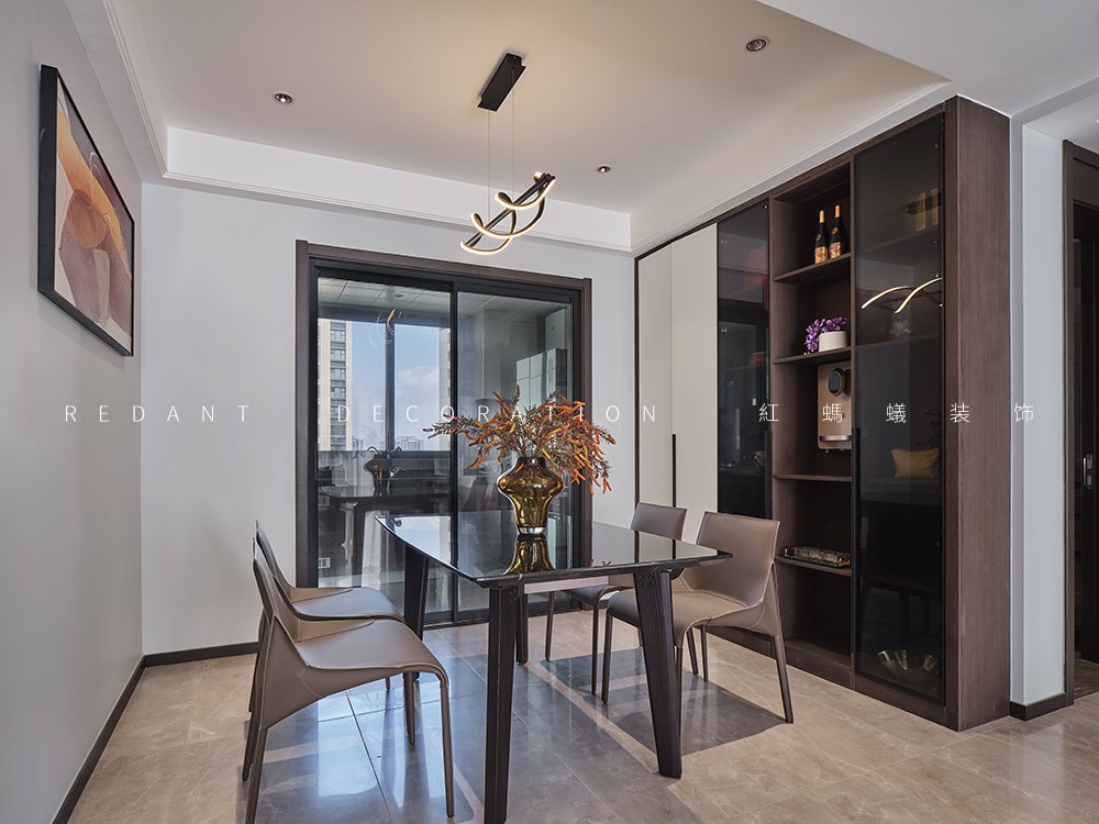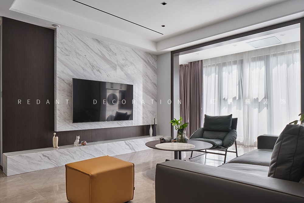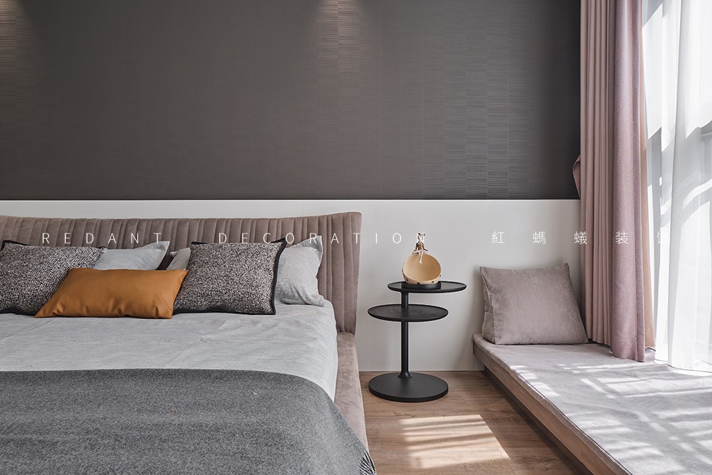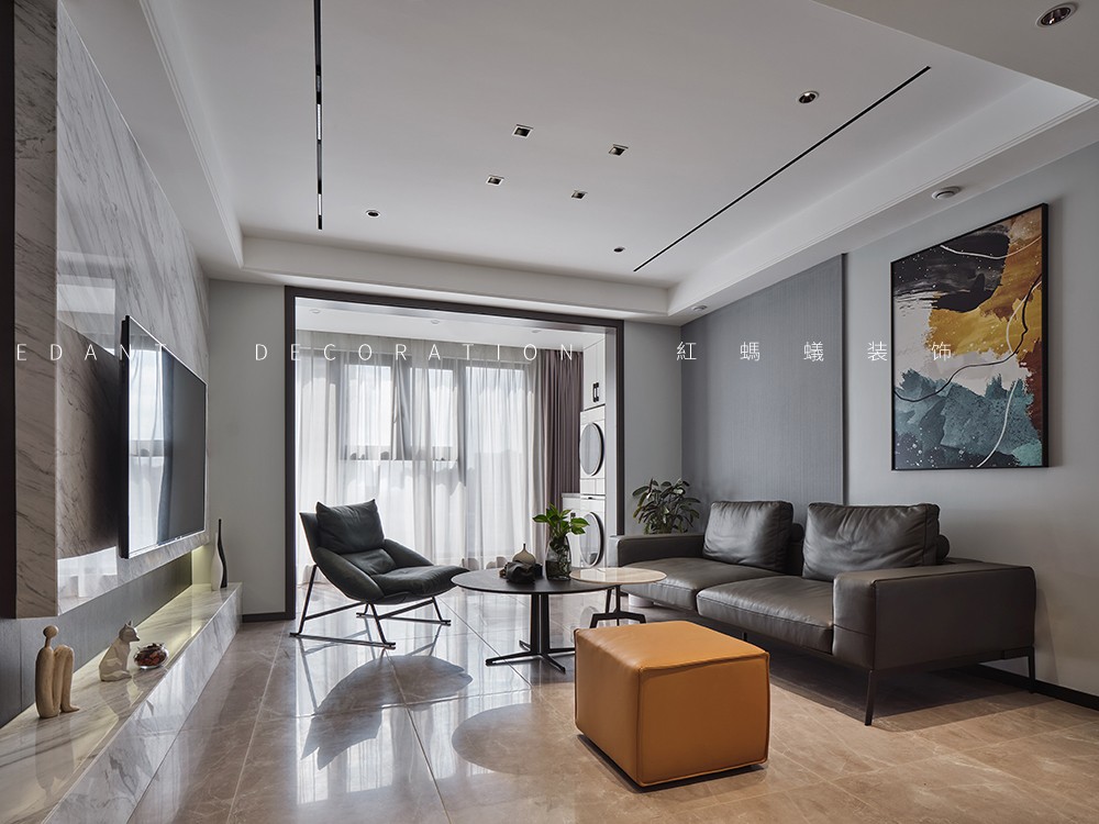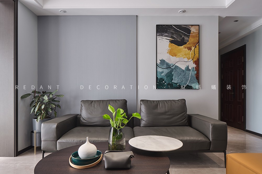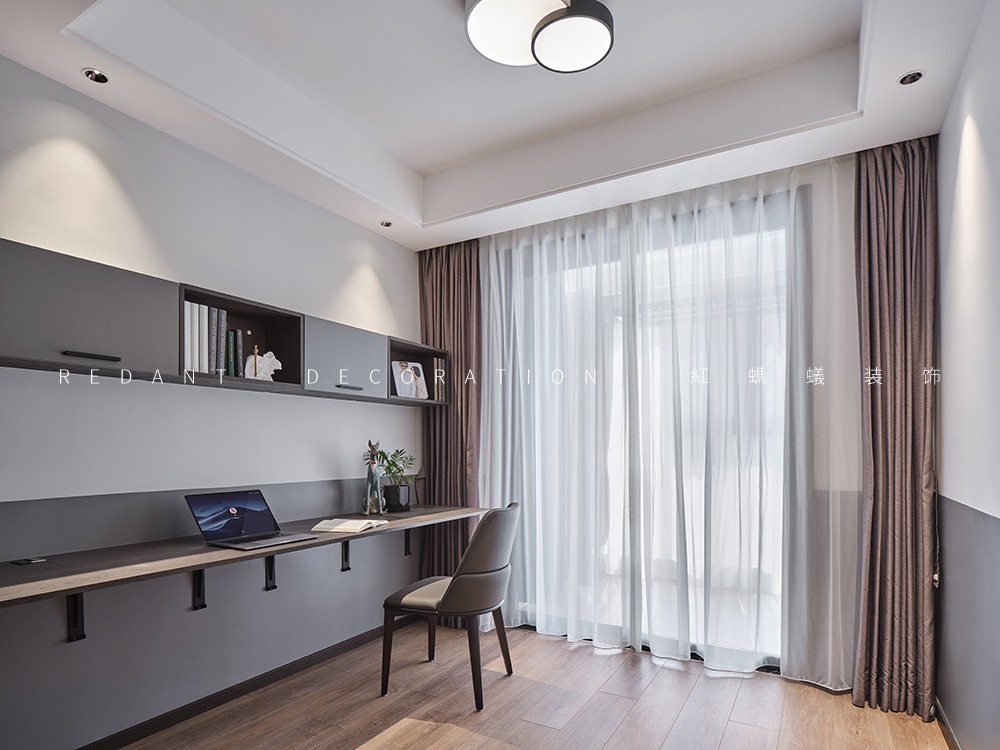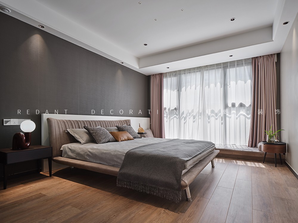 本案是140平的精装房,在原有的厨房卫生间不改动的前提下,尽可能的满足客户对现代极简风格的要求,通过无主灯设计,内嵌风口,超高房门,让整体设计风格简杰大方,空间布局上改动了主卧的格局,将原有的内卫门调整方向,将北面小房间纳入到主卧主卧的空间,让主人的生活方式得到极大的提升。客厅和阳台打通,整个客餐厅厨房空间通亮、简洁、舒适。色彩上采用的是灰色调深浅的搭配,窗帘配以局部的亮色做点缀,整个空间高级灰的同时也不失活泼。
