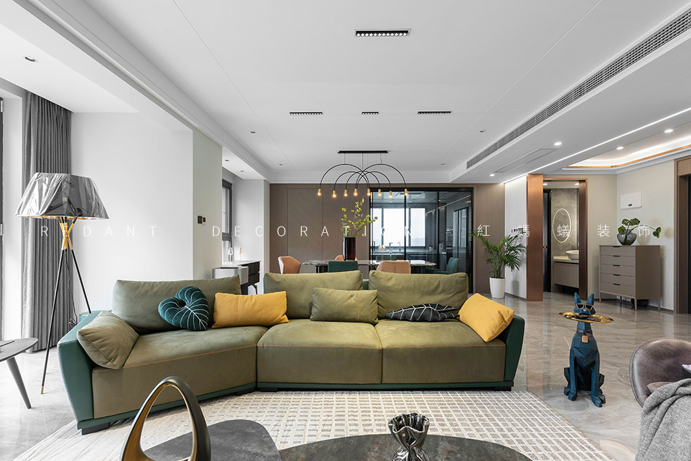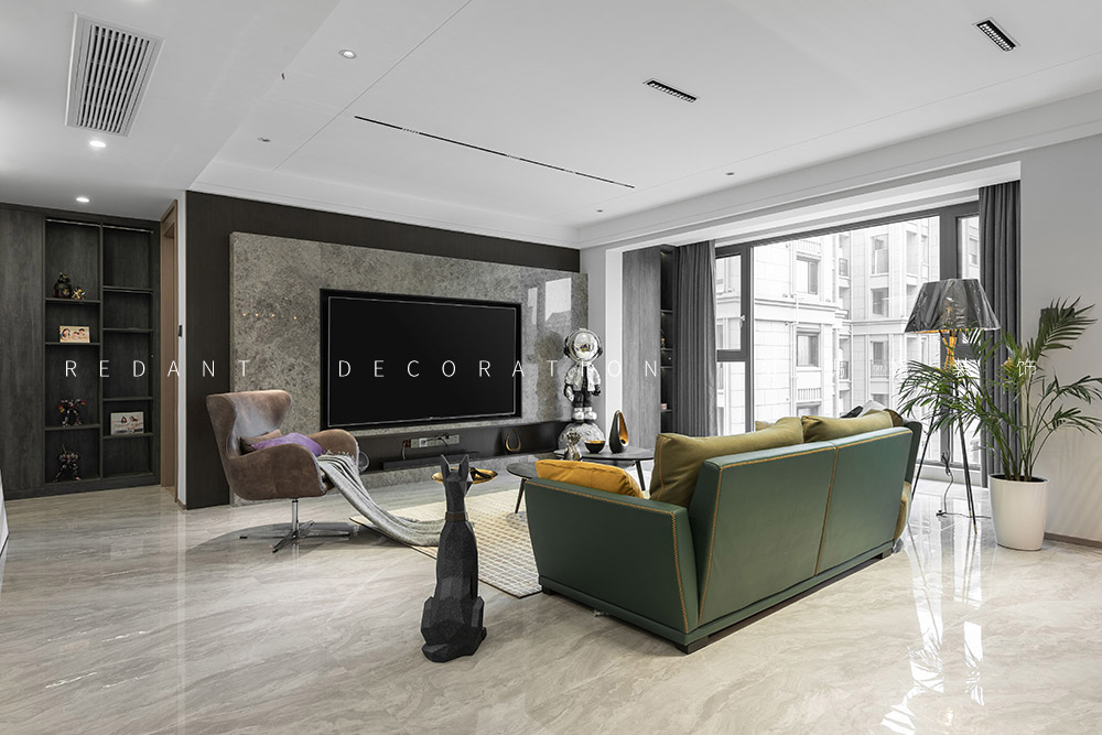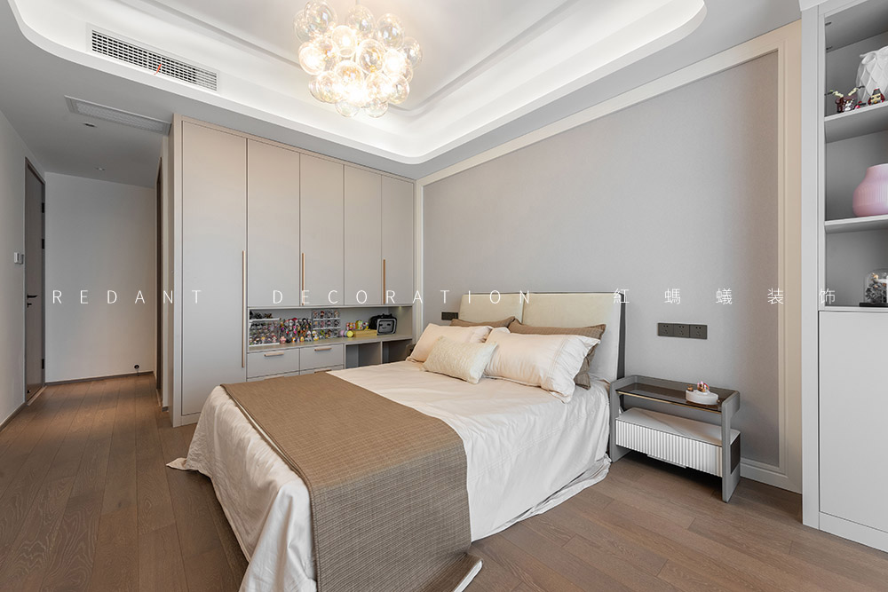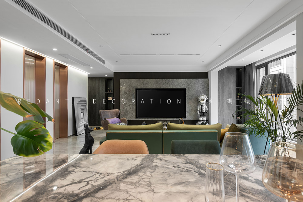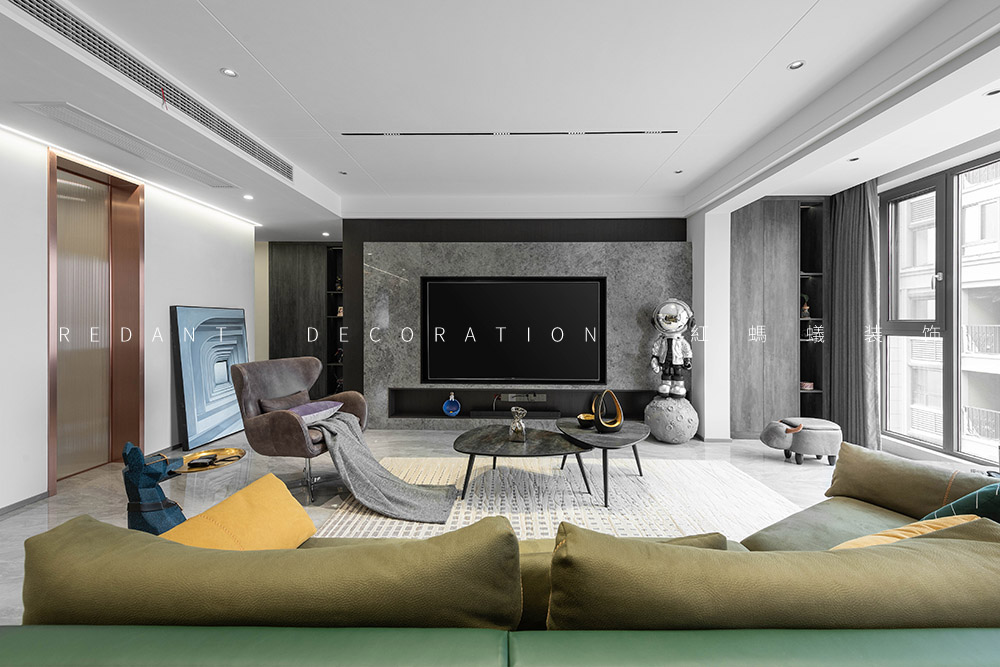 这是幸福的三口之家,业主是一对社会的精英人士。他们有一个可爱乖巧女儿,一家人都很喜欢模玩手办,对色彩不希望单一,喜欢三亚及厦门休闲浪漫的生活方式,希望硬装基调简单素雅,对色彩不希望单一,尽可能增添一些时时度假的感觉。经由沟通发现他们喜欢现代轻奢的感觉,但又不完全喜欢轻奢风,于是我的设计整体表达处在一种“已至 未满”的状态。主要运用材质有通体瓷砖、多层地板、天然大理石、木饰面、硬包、墙布、艺术漆等。在简单且素雅的空间中寻找一种更适合居住者休闲度假的生活状态。