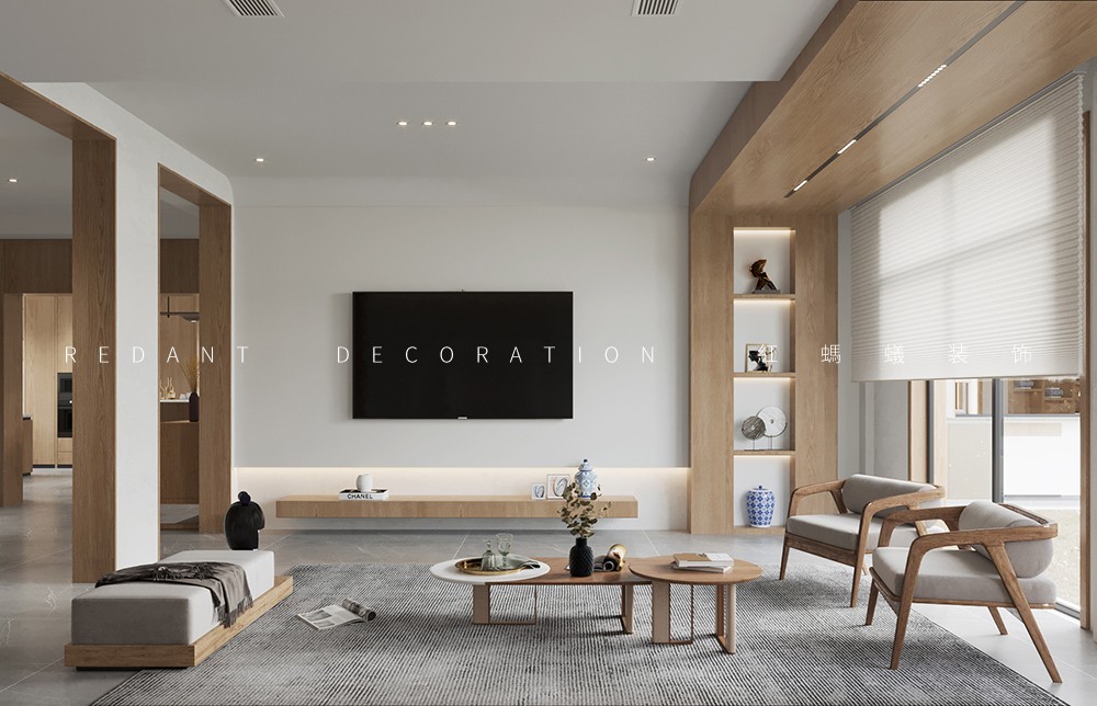 本案例定位日式风格,是和业主沟通过后确认的主体设计格调,在主色彩上我们选用了白主色彩,摈弃了造型电视背景墙,取而代之的是造型简洁的电视柜组合墙,内嵌式的柜子和木饰面计保持了简约设计的主调,又集强大储物功能为一体,搭配业主喜欢的简洁家具,轻松营造出了有趣的家居空间。