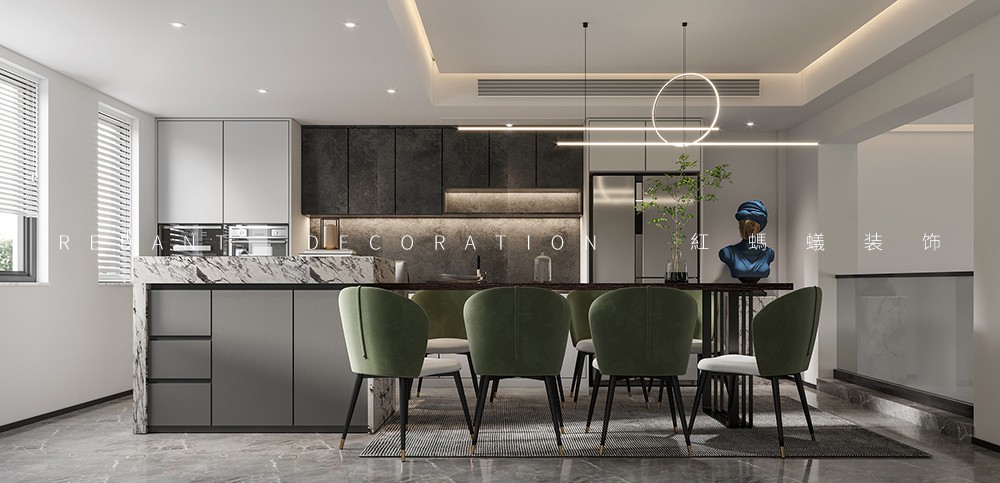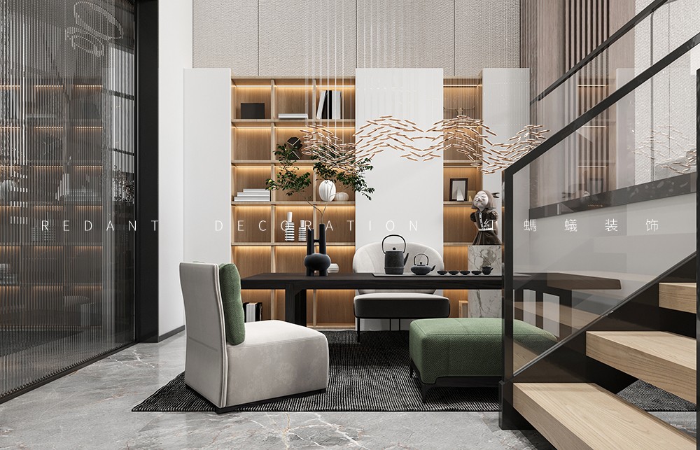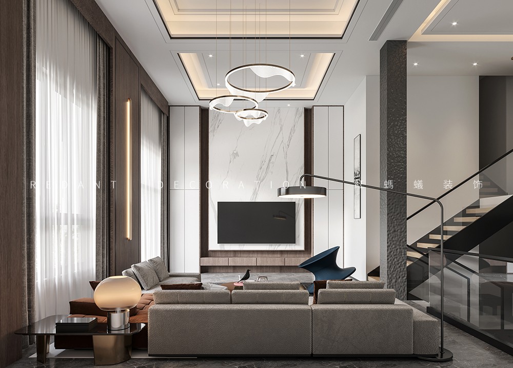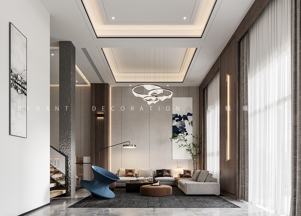 沉静是一种内涵,一份采菊东篱下的淡泊释然;沉静是一种力量,一种潜藏心灵深处的感染力。空间中大面积的白色,优雅而高级,糅合着材质的肌理质感,将现代沉静的艺术空间呈现的淋漓尽致。挑高的空间,自带一种仰望的体量感,呈现了一种自由的精神状态。沙发采用精致的灰白色皮料,点缀苍青色的单椅营造出一种清雅气质。