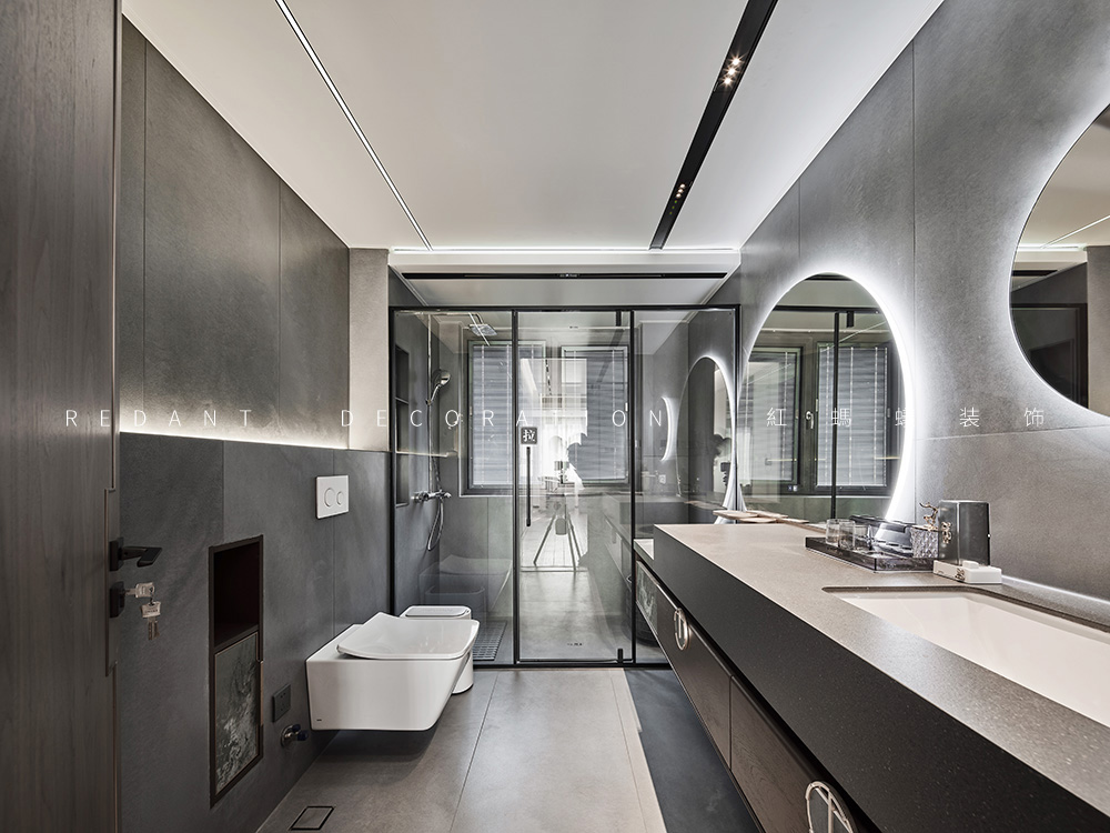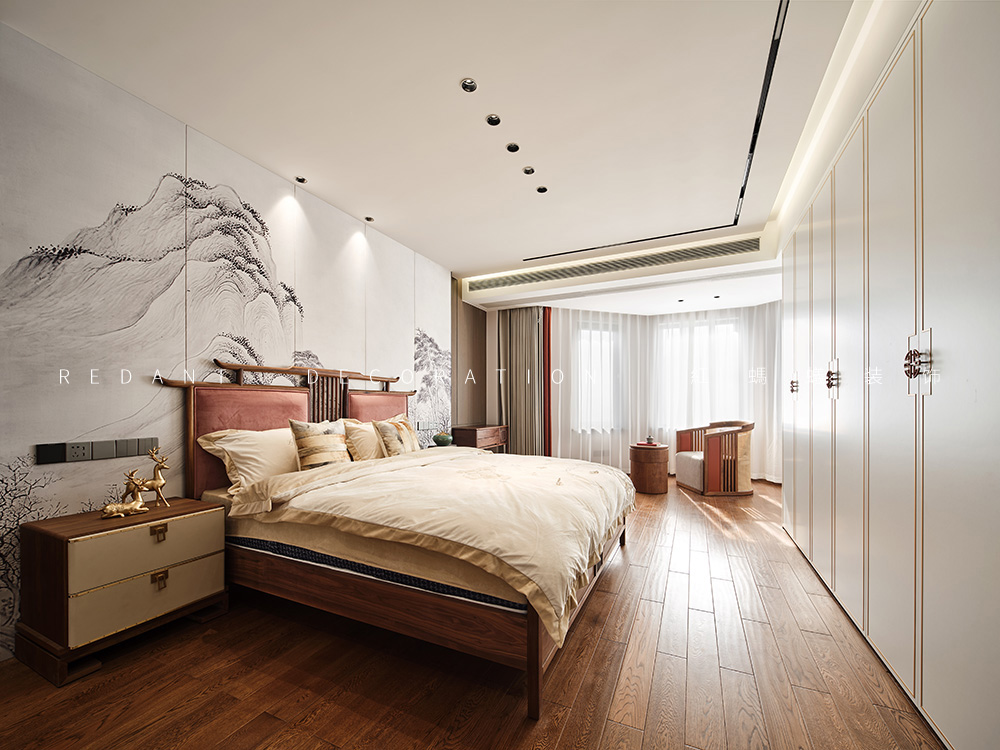 然后在功能布局上卧室方面,因为业主家有两位男孩所以最终保留了三个卧室,都各自打造了不同的风格,主卧室+衣帽间依然延续了客餐厅的禅意新中式风格