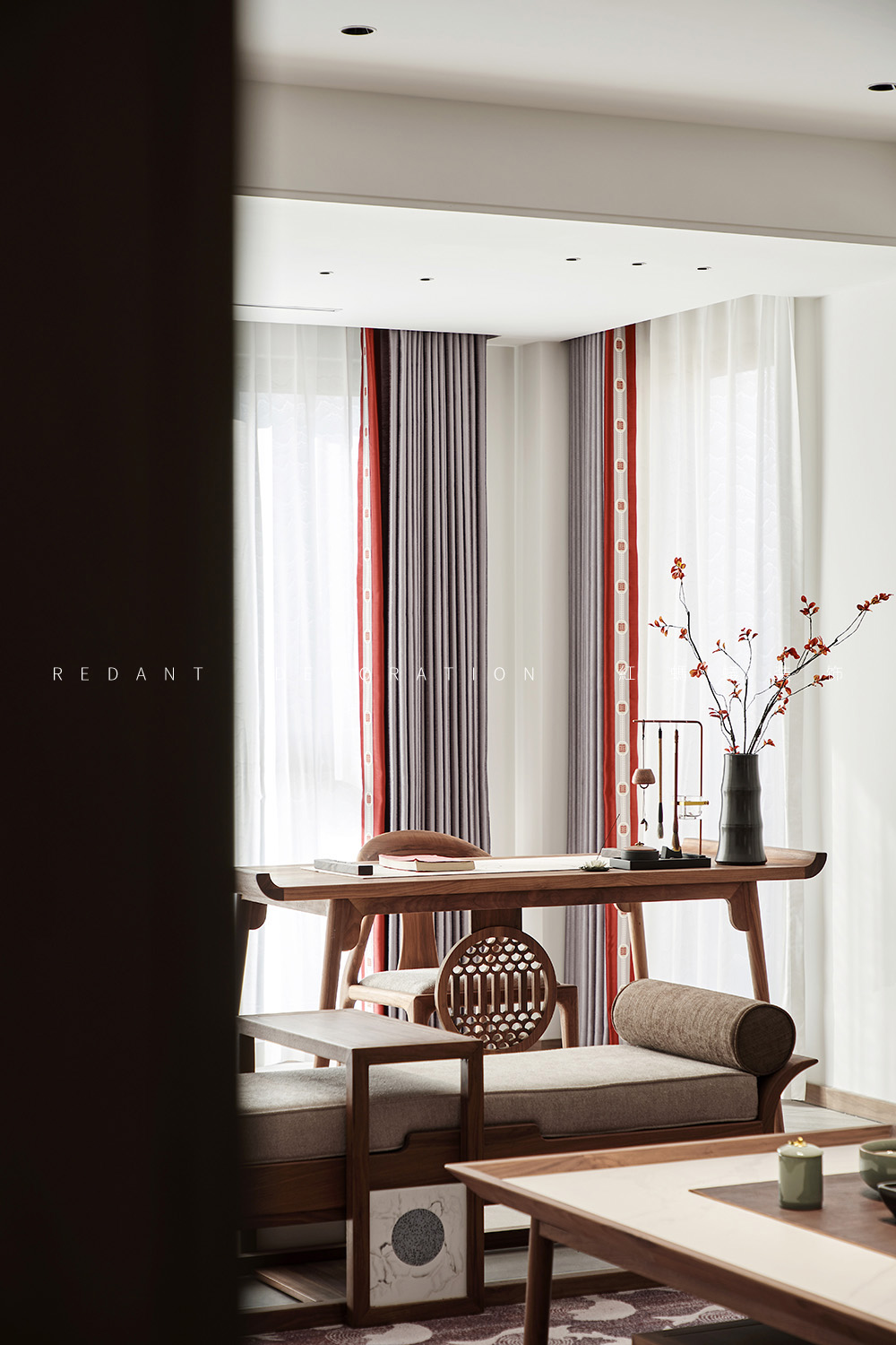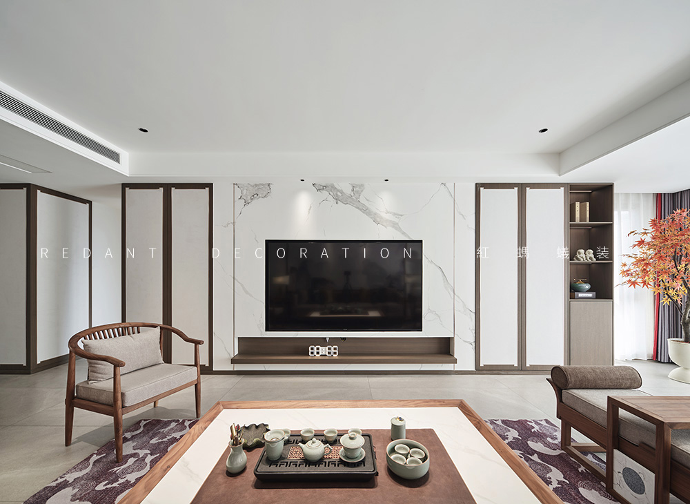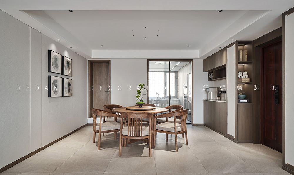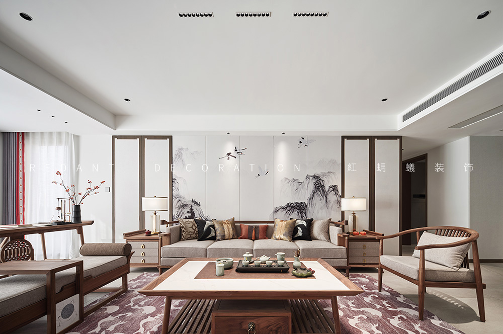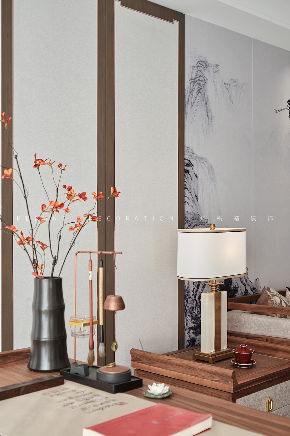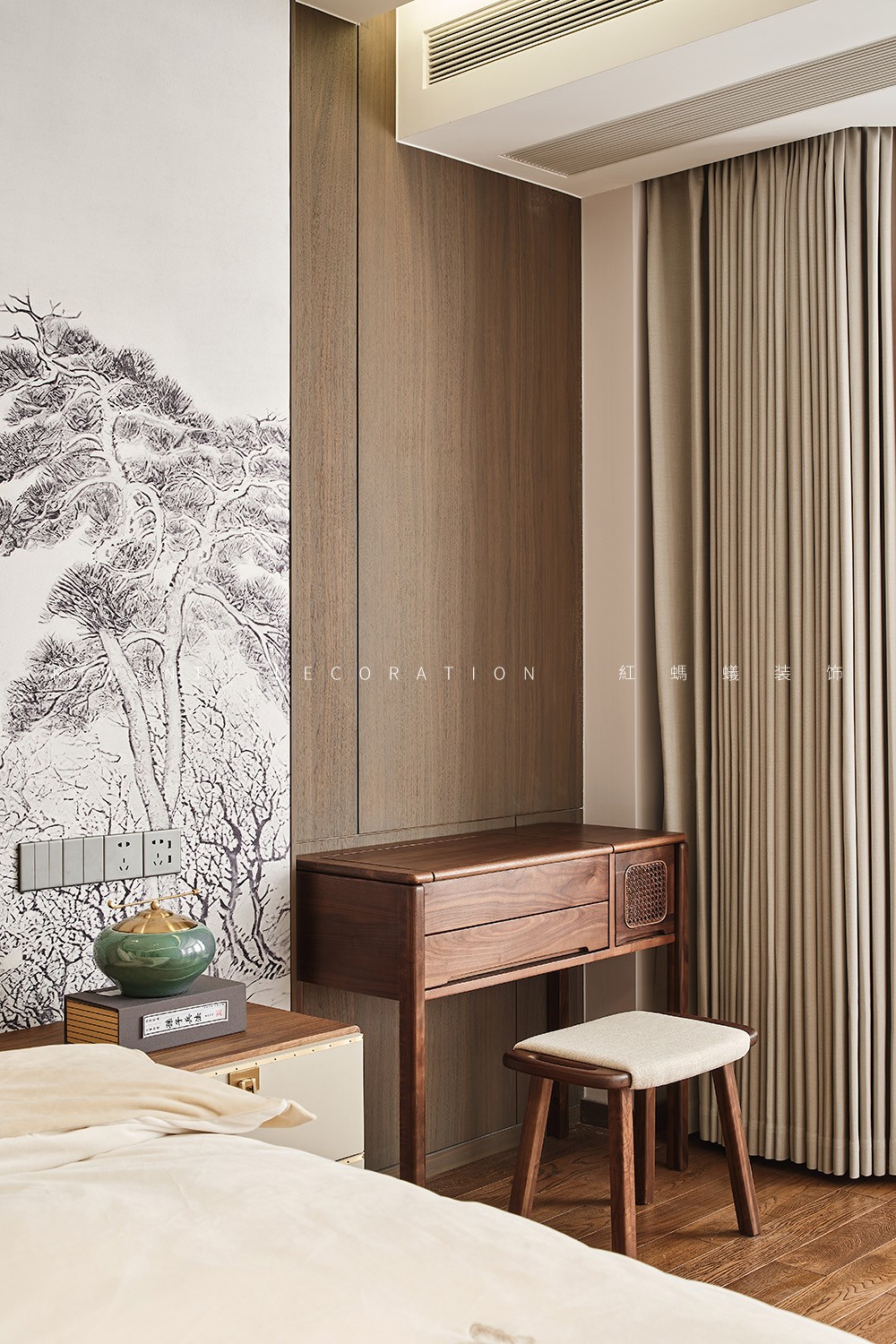 在材料上面木作部分开放活动空间和主卧室更多的采用了适合禅意新中式的胡桃木的材质包括家具,融为了一体