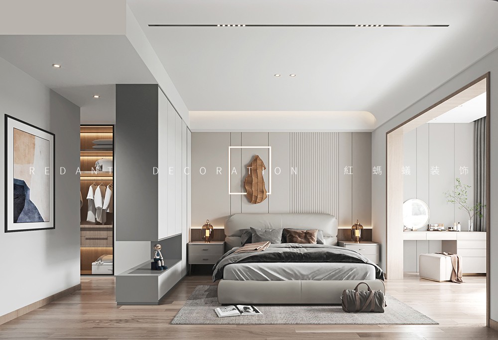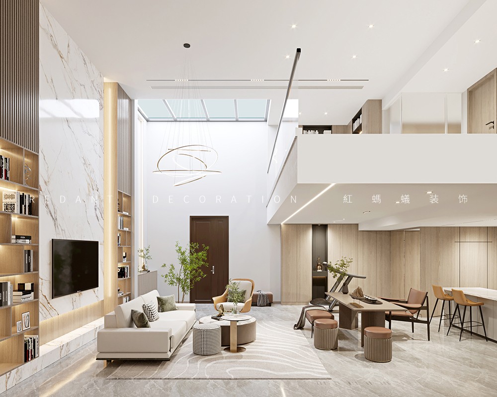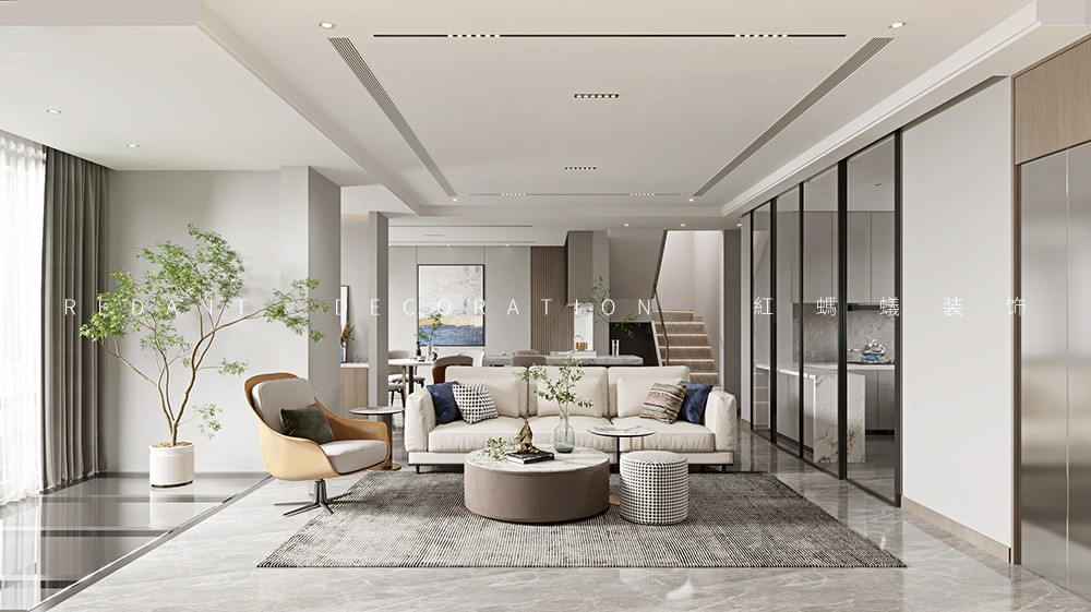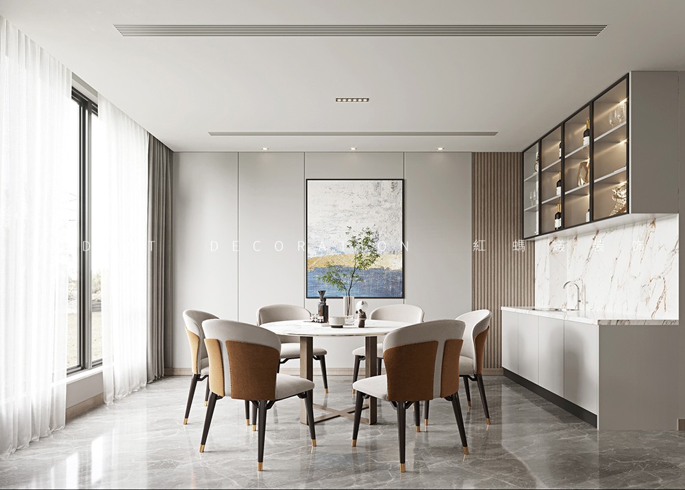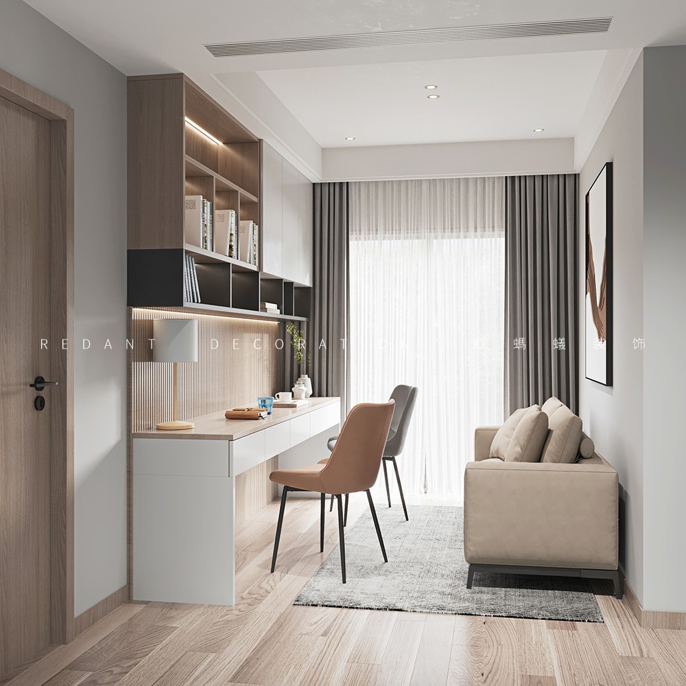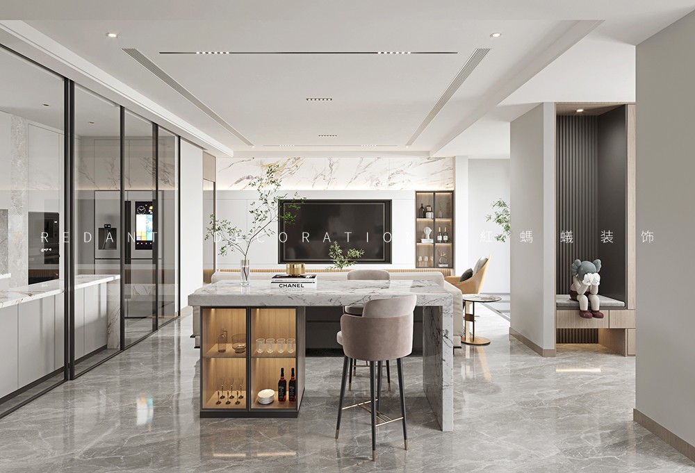 “空间设计的理想境界,是保留具象的空间和意象的空间,供情感知,供境对话,供人想象。”客厅以光为引,辅以飘逸织物、中性配色树立自身的美学内核。 借用部分客厅空间,扩大厨房面积,也提升了厨房的视觉通透感,让烹饪更舒适。采用黑框勾勒的笔法,在通透玻璃的助力下强化厨房的区位性。可分可合的移门,让厨房可以在开放或封闭两种形态间自由切换,整体空间更加连贯。构筑简洁吧台,承续环境色,打造与整体统一的厨房风貌。黑白灰基调如画卷,清晰记录着光影的足迹。将视野过渡至阅读区,利用穿插、叠层、分隔的手法,让隐于一侧的天地尽显思想精神的丰富性。听一听风,品一品茶,翻一翻书,细腻地去感受当下的生活。