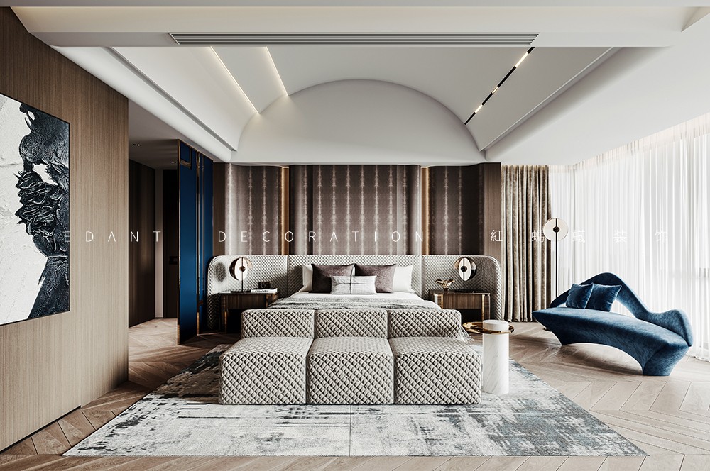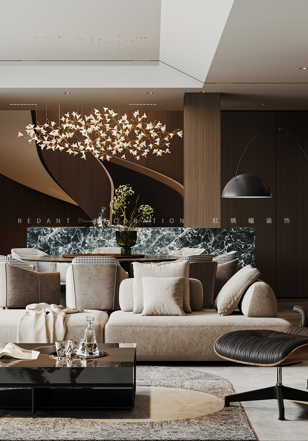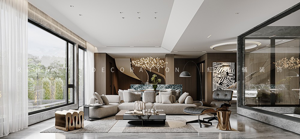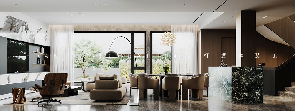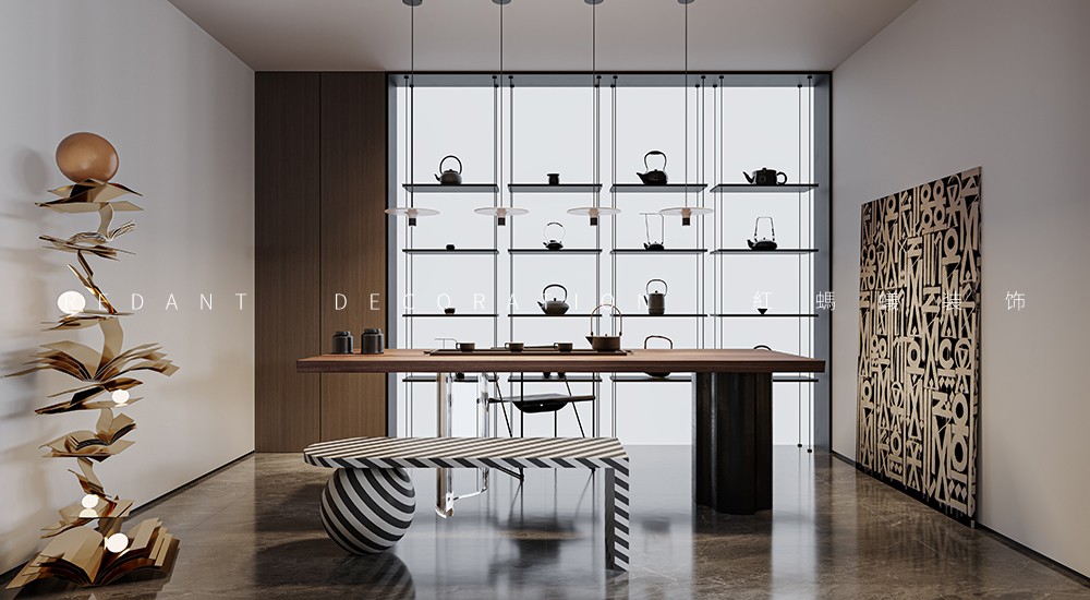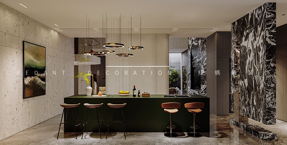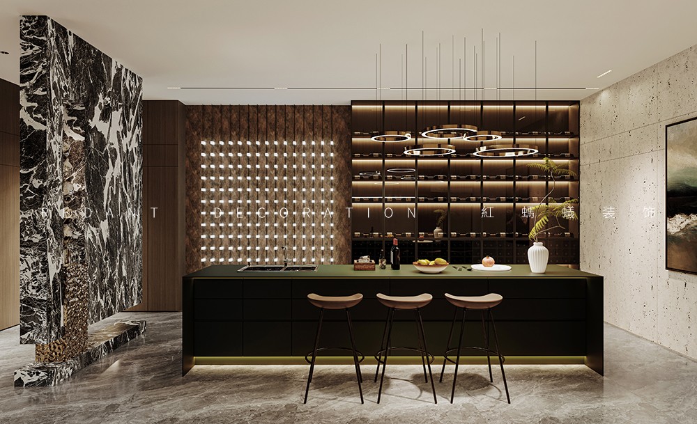 设计将整个动区化零为整,实现一个超级尺度+复合场景的生活场,在一个格局自由的开放性空间内同时呈现客餐厅、中西双厨、茶吧等多重复合空间。开敞的西厨与中厨有机结合,并设有多功能桌。提供一个区别于正常空间的社交场所,可聊天、可饮茶、可桌游…… 令空间更具灵活性,融于生活、融于社交、融入风景。佳宴必有美酒,吧台、酒柜等由酒延展的构件体现其自身具备的收藏与展示属性。