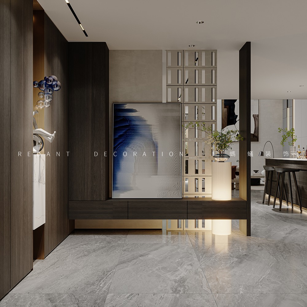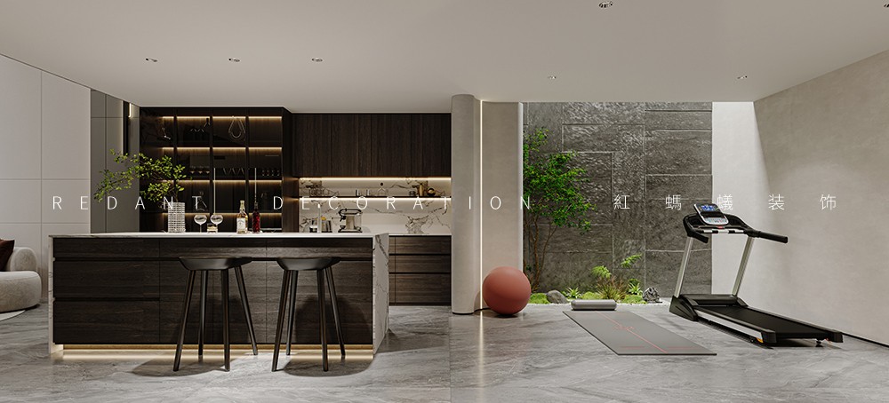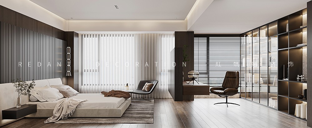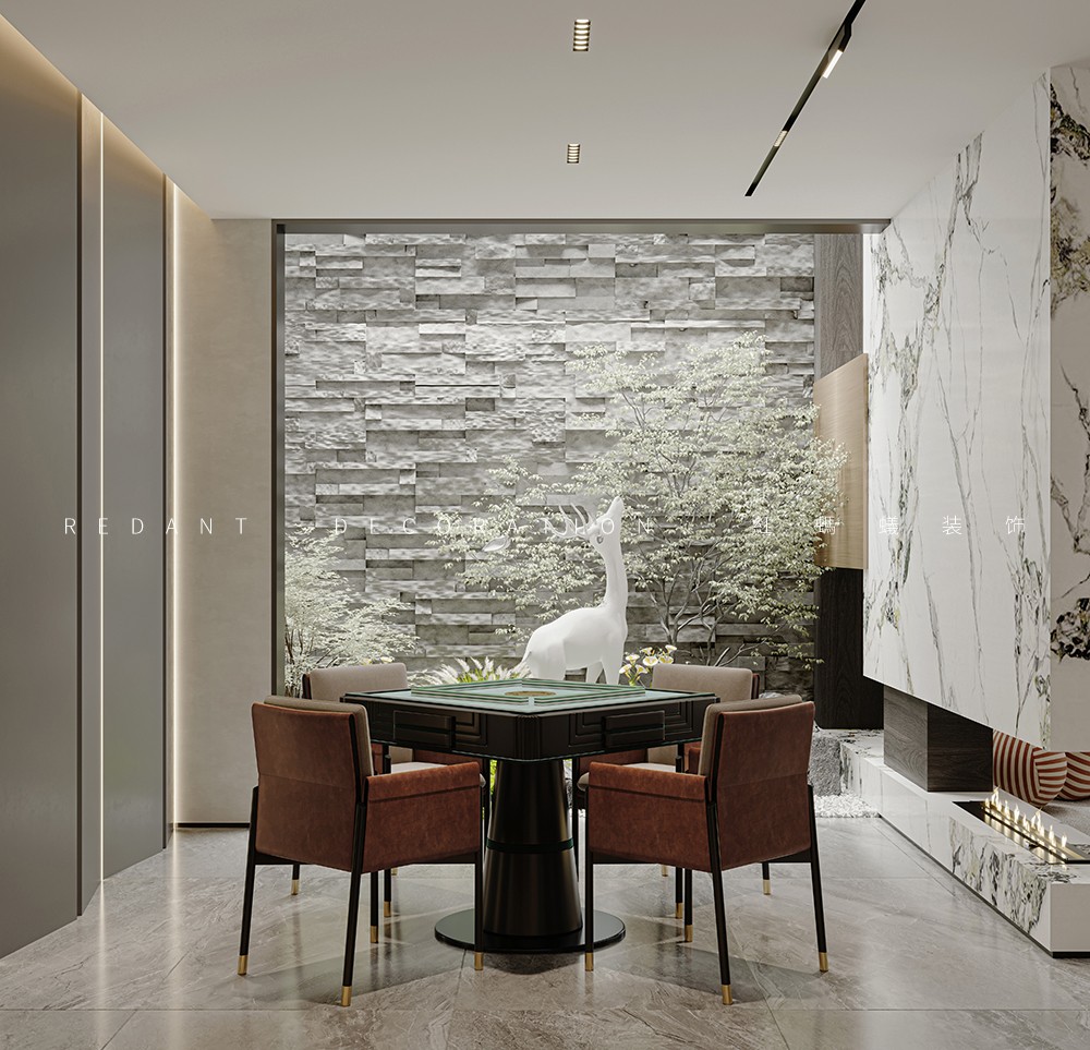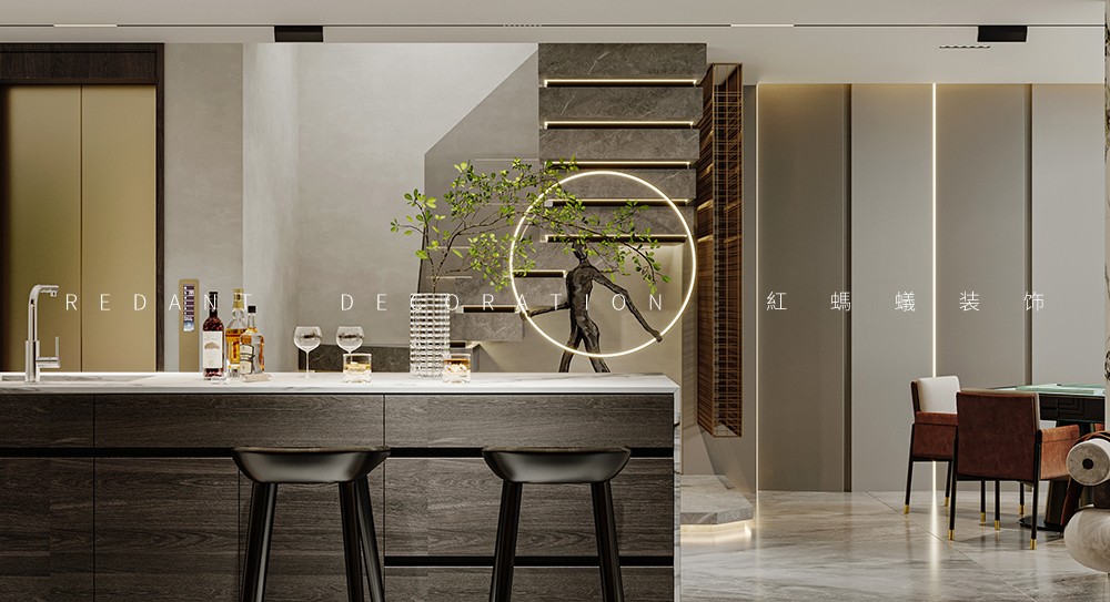 本案为阳澄湖边的联排别墅,客户考虑自住夫妻二人以及小孩后期婚房考虑,风格这块定位为现代轻奢,客户倾向于深色系的木皮以及鱼肚灰的石材的质感和色调,本案中运用了一些哑光黑色不锈钢增加了一些金属质感。