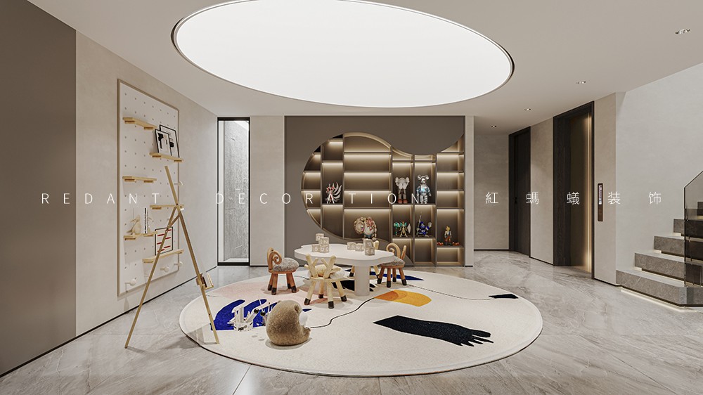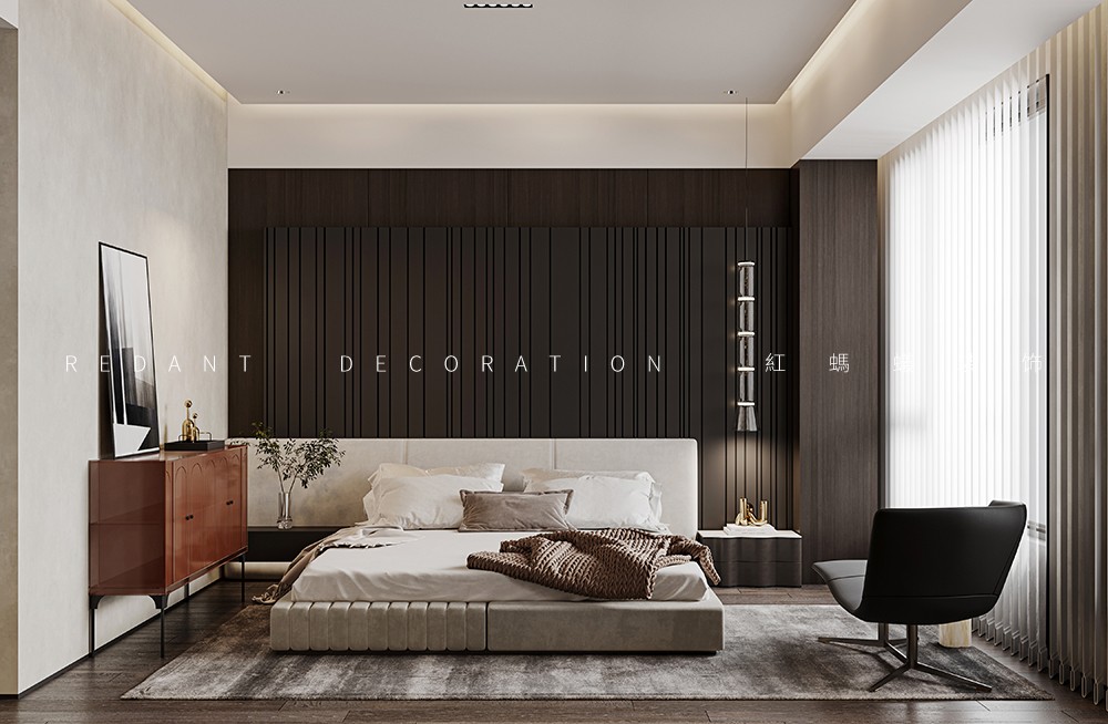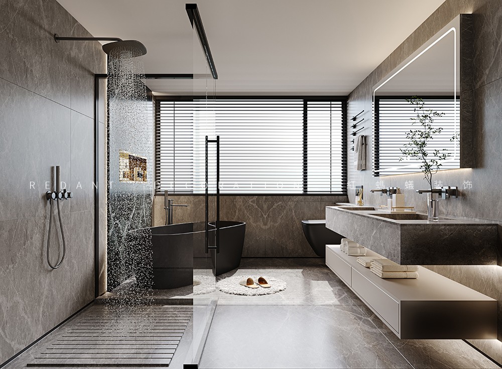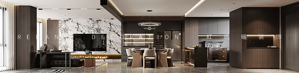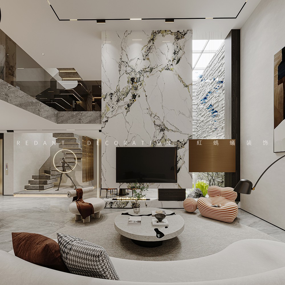 本案为阳澄湖边的联排别墅,客户考虑自住夫妻二人以及小孩后期婚房考虑,风格这块定位为现代轻奢,客户倾向于深色系的木皮以及鱼肚灰的石材的质感和色调,本案中运用了一些哑光黑色不锈钢增加了一些金属质感。