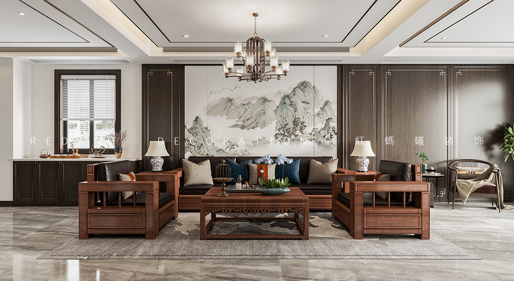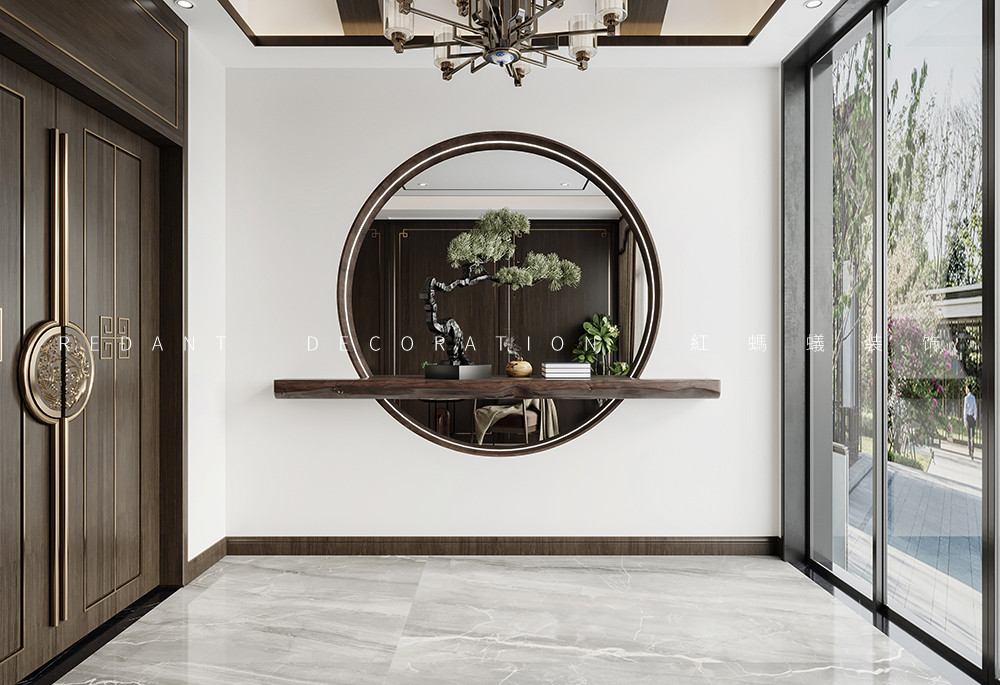 新中式风格独有的移步换景得设计,在进门处设置玄关空间,使得空间藏而不露,整体采用深色胡桃木颜色,沉稳大气