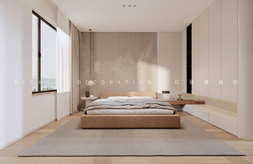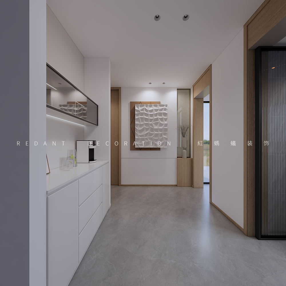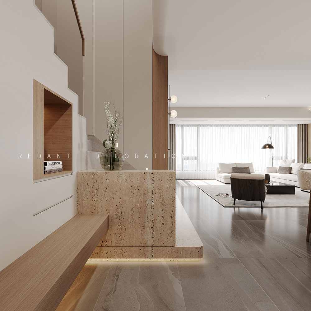 “清逸起于浮世,纷扰止于内心。”从进门的那一刻起,木质的换鞋凳和天然质感的洞石玄关将疲惫的灵魂在此刻卸下武装,从玄关延伸至电视背景墙的洞石和石材底部暗藏的微弱灯光是指引家的方向。进门后即刻展现在眼前的是温润的木质餐桌和柔软的椅子和沙发,温暖的食物包裹着内心,家的味道浸透着每一处细胞,餐桌边黑的玻璃酒柜和玻璃门置于厨房和餐厅之间,虽不起眼却是锦上添花,无不彰显主人温润的气质和接人待物的处世哲学。