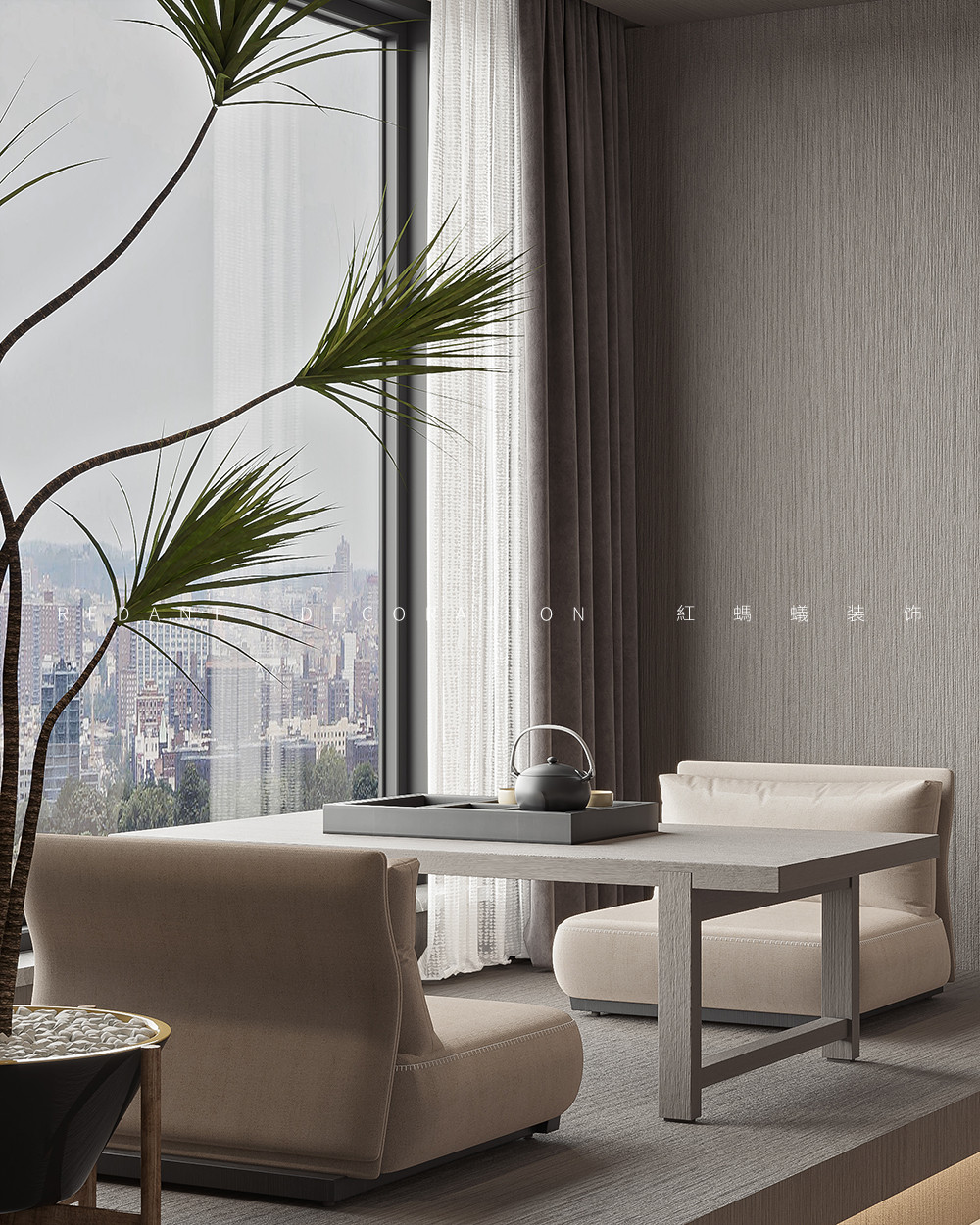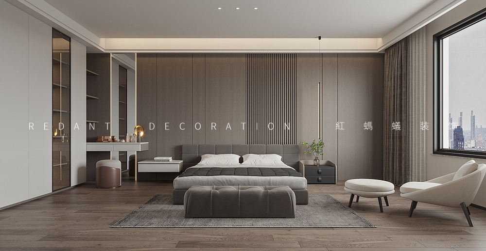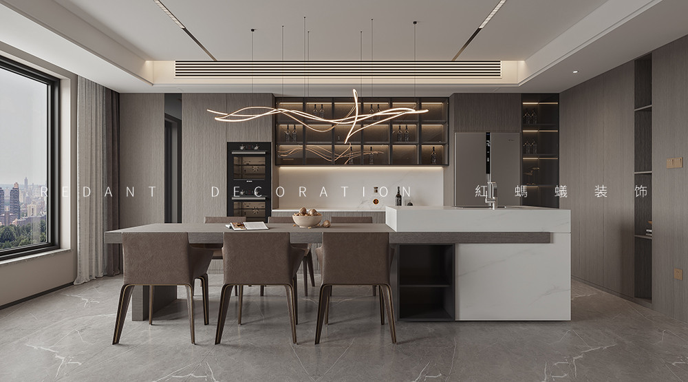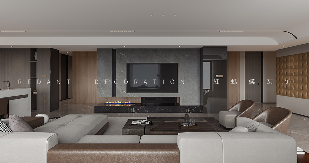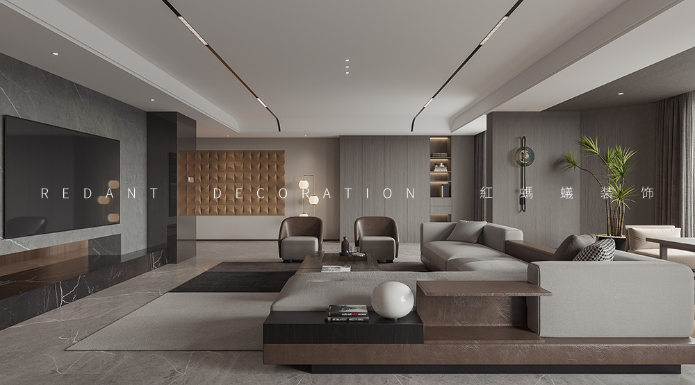 此项目是大平层空间,客厅中,将艺术、时尚、奢华恰到好处地进行融合,呈现居者享受生活与极具个性的力量,以独到的方式将居住环境娓娓道来。弧形流动的吊吊顶造型和黑色轨道灯,同为弧形的舒适沙发,不仅带来了视觉上的享受,也融合了居者的感官体验。奢石和金属的设计碰撞,以及通透大空间的处理手法,让客厅空间的仪式感拉满。低调奢华的秩序与精工匠造的设计细节,重构客厅的空间体验。