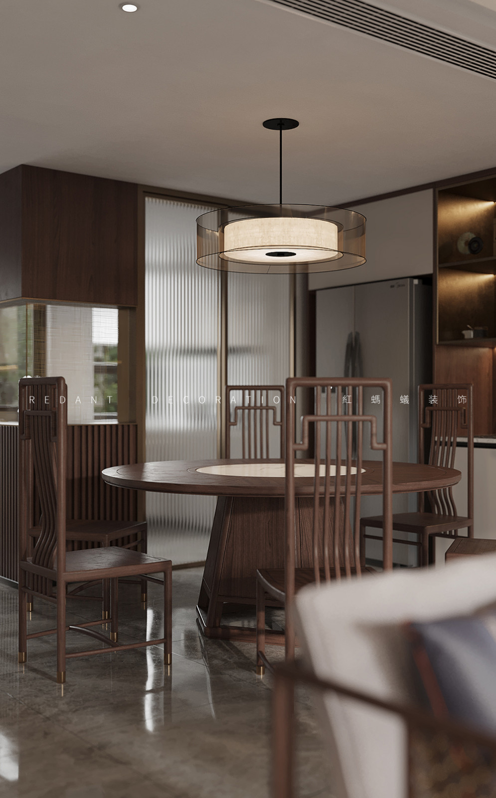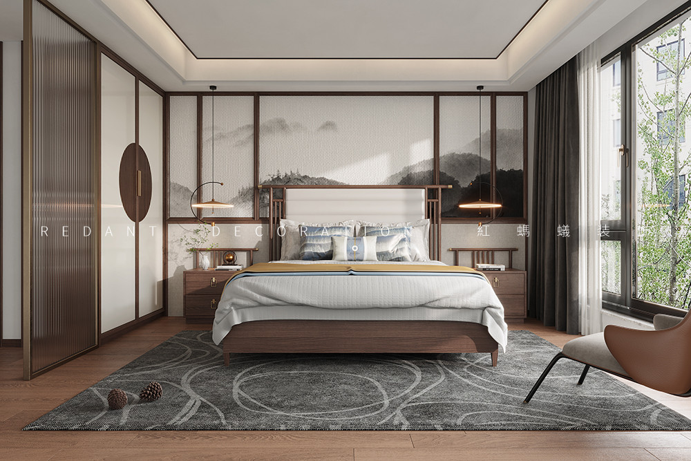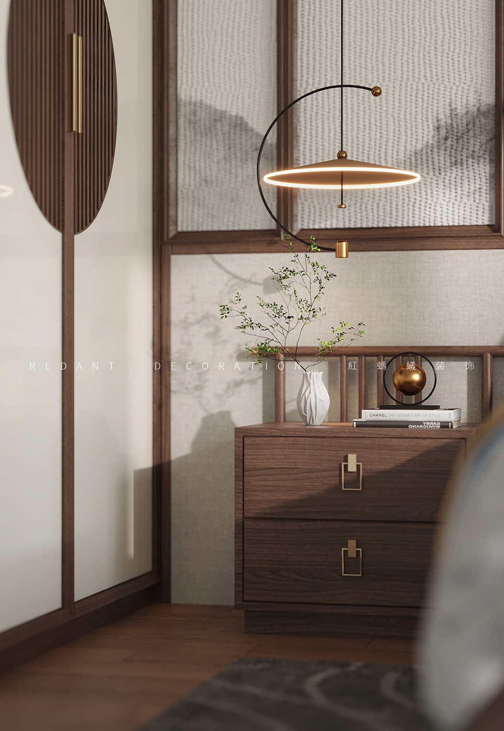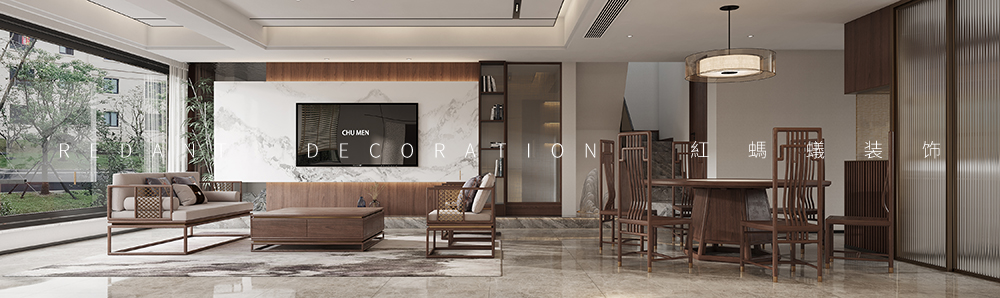 此项目是上叠别墅,两层带一层阁楼。业主喜欢中式缅甸花梨木的家具,因此整体风格色调以新中式为主基调,缅甸花梨木的色彩比较偏红色,因此墙面的木饰面以比较偏深色沉稳的胡桃木为主,局部用古铜色金属收口包边,提升空间品质感的同时彰显业主低调沉稳的性格特征。