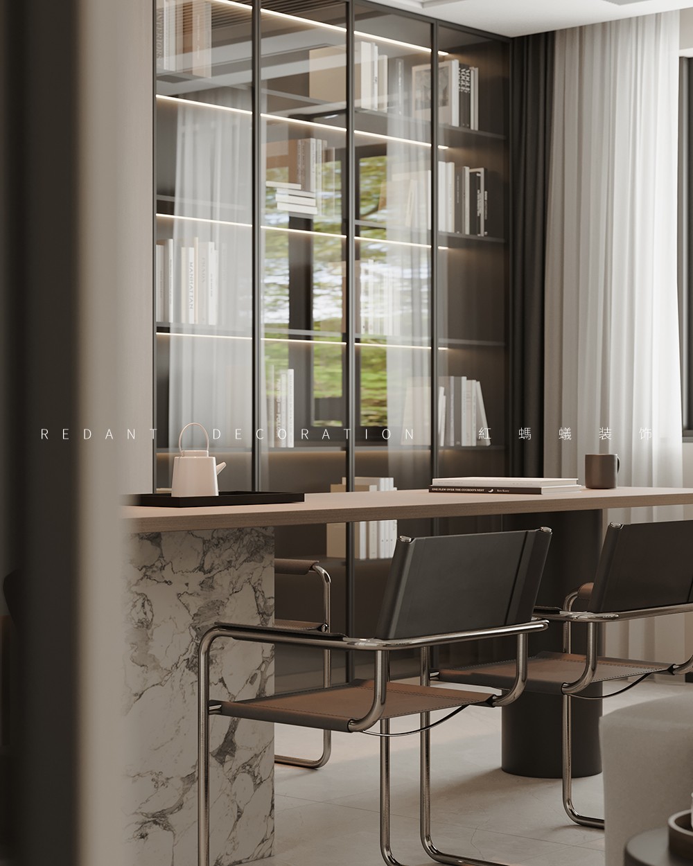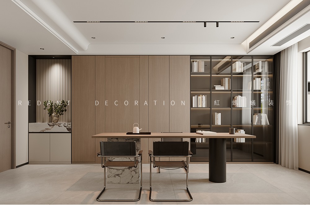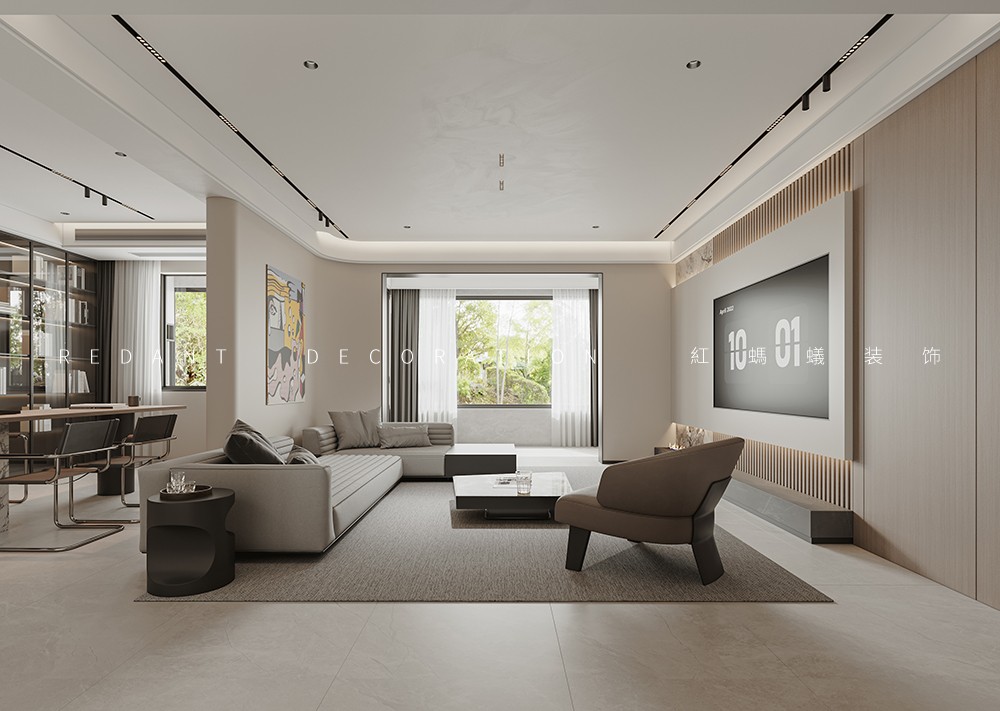 客厅是住宅空间的中心首脑和对外的一个窗口。本案电视背景墙的设计是整个住宅空间的亮点,运用了石膏板、乳胶漆、木饰面等装饰材料,简单的装饰材料,营造出现代化空间。开放式书房为整体空间融为一体,创造了一个现代化的工作、阅读空间。