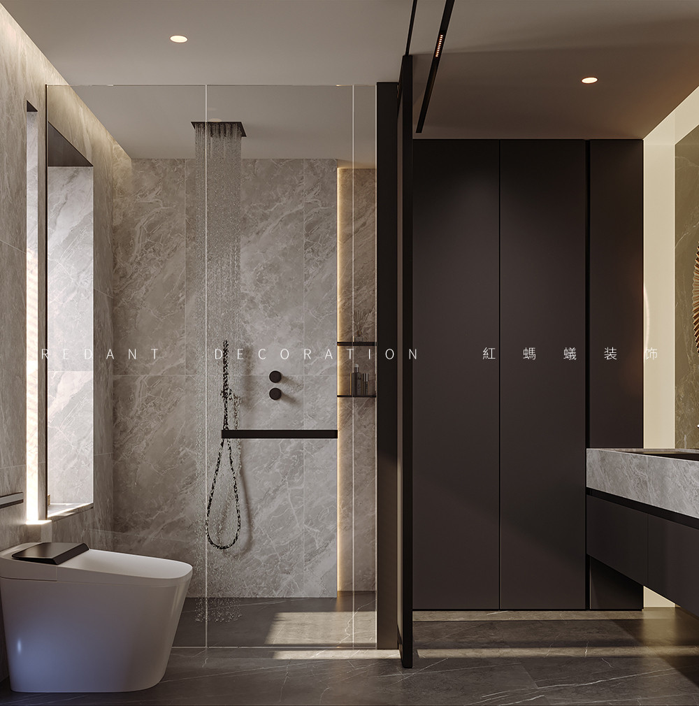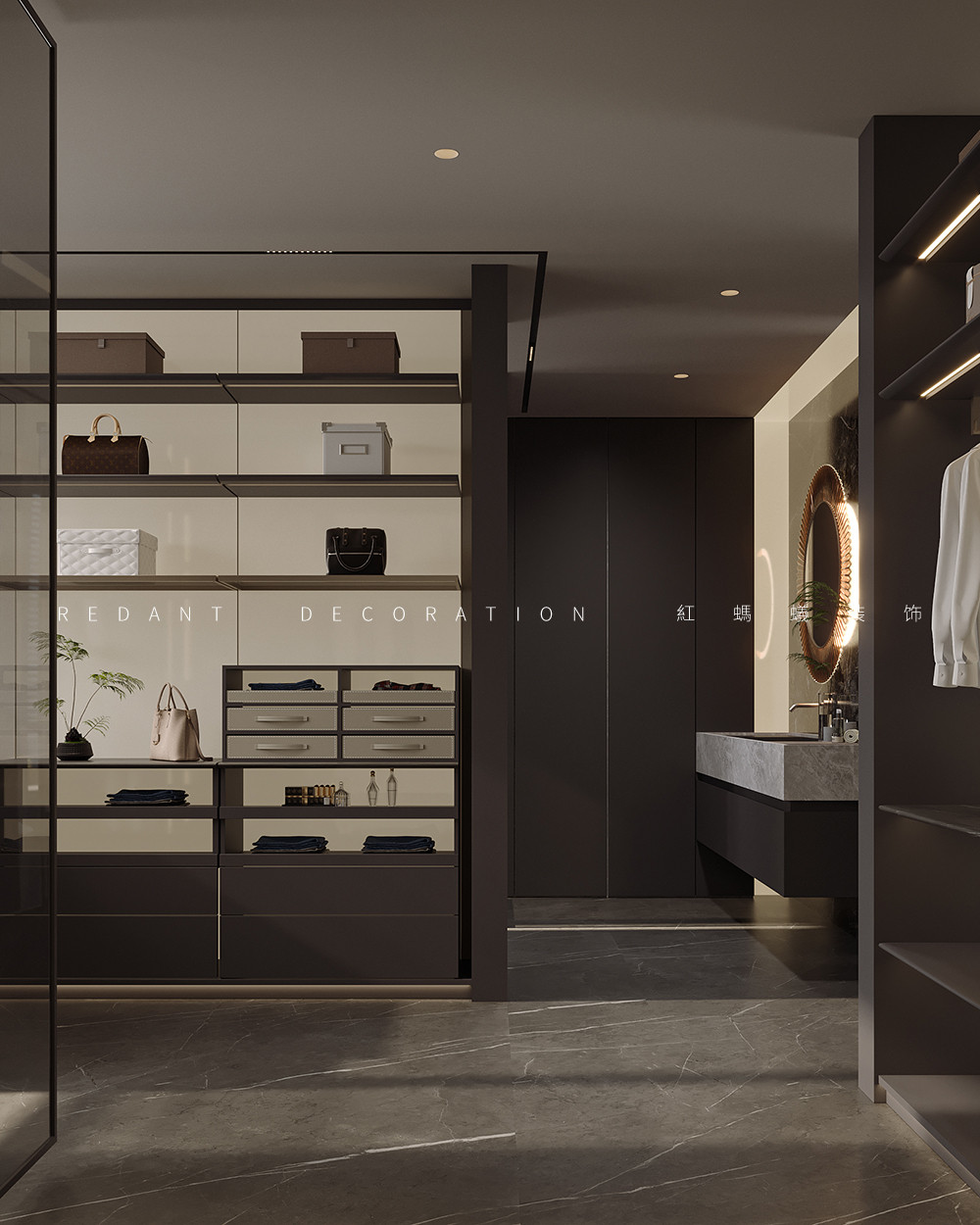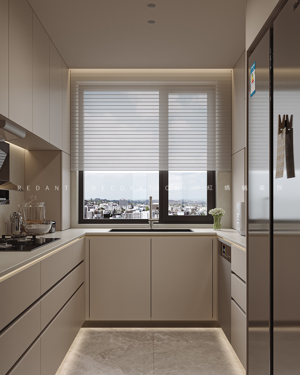 在厨房与餐厅之间设置独立岛台,拓展操作空间,兼具早餐吧台、家人互动交流以及临时备餐等功能。岛台选用岩板台面,坚固耐用且易于清洁,搭配时尚简约的高脚凳,营造出轻松惬意的用餐氛围。