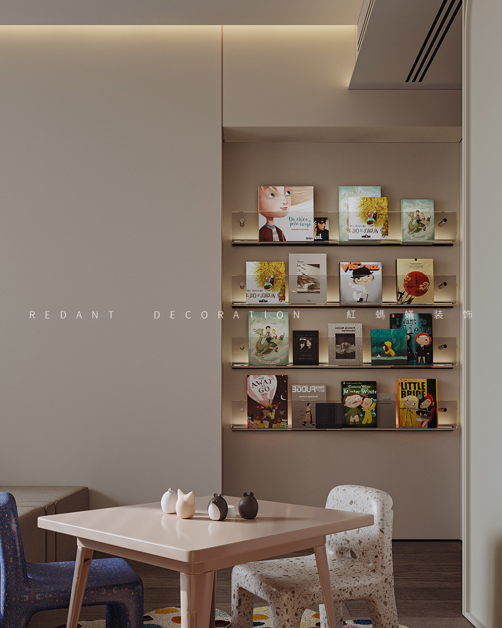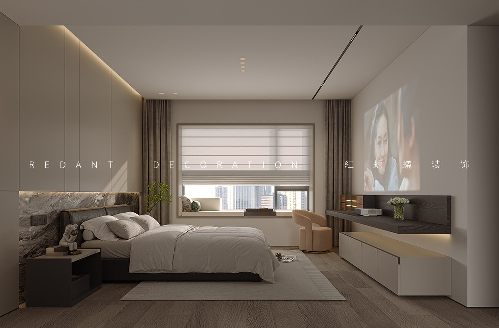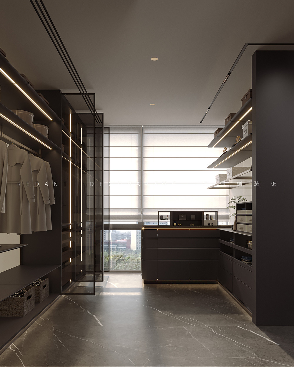 在厨房与餐厅之间设置独立岛台,拓展操作空间,兼具早餐吧台、家人互动交流以及临时备餐等功能。岛台选用岩板台面,坚固耐用且易于清洁,搭配时尚简约的高脚凳,营造出轻松惬意的用餐氛围。