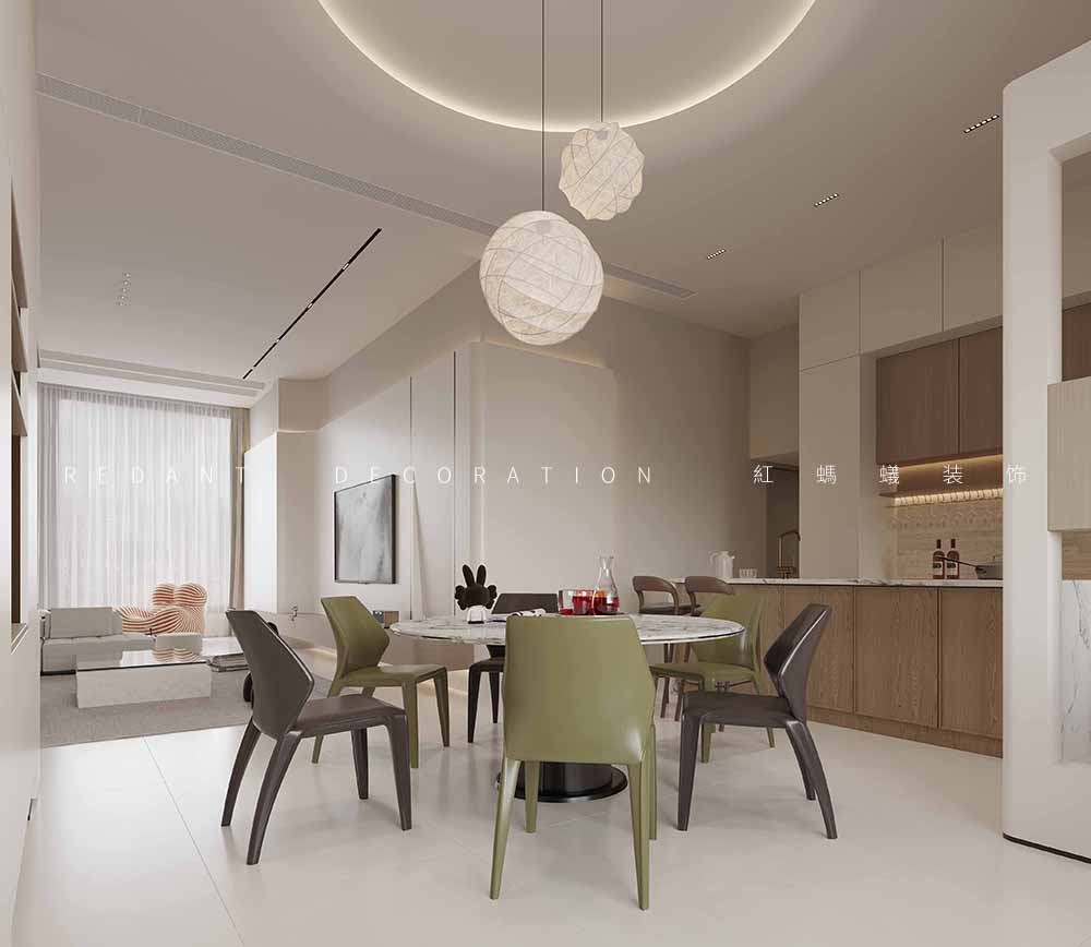 餐厅位于西厨与客厅之间,摆放一张可容纳多人的餐桌,满足家庭聚餐和宴请宾客的需求。周边预留足够的走动空间,方便上菜与清理。