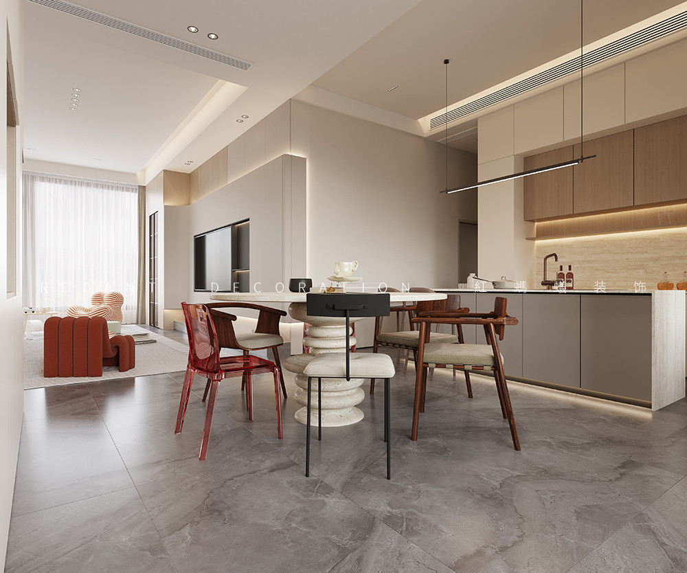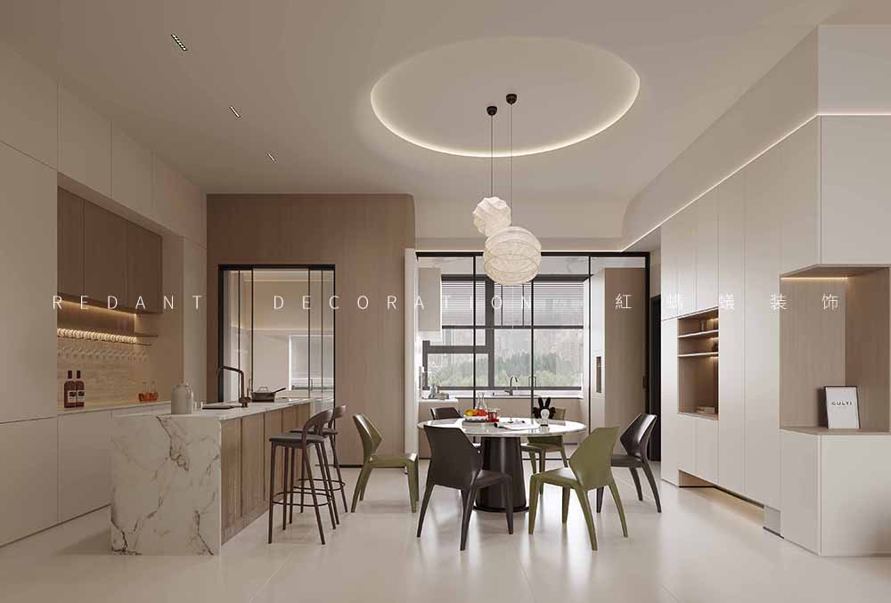 封闭厨房独立的封闭厨房有效阻隔油烟,L型橱柜设计充分利用墙面空间,操作台面宽敞,炉灶、水槽、冰箱位置合理,符合人体工程学,方便烹饪操作。西厨紧邻餐厅与客厅,设置中岛台,可作为早餐吧台、临时办公区或家人朋友交流互动的空间,增加厨房的社交属性。搭配精致的吊灯,营造温馨的用餐氛围。